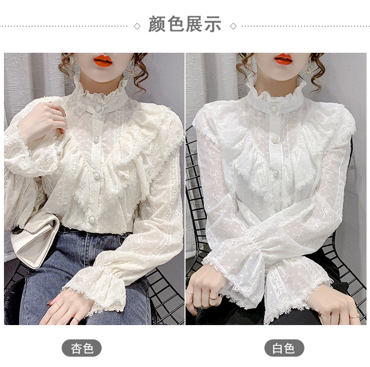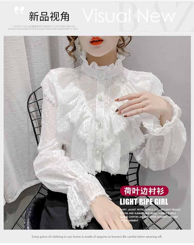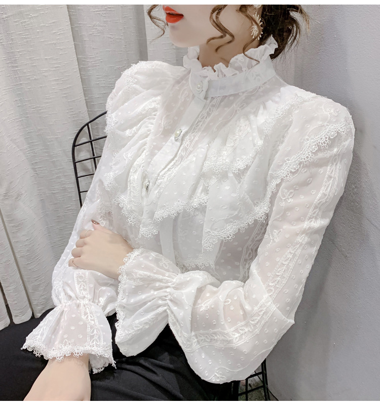 2025 봄 새로운 슈퍼 페어리 러플 트럼펫 소매 폴카 도트 쉬폰 셔츠 예술적 모리 자수 도트 셔츠스토어 가기