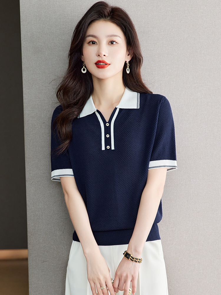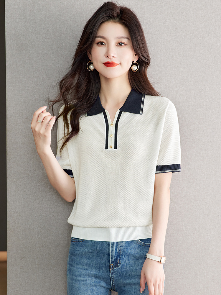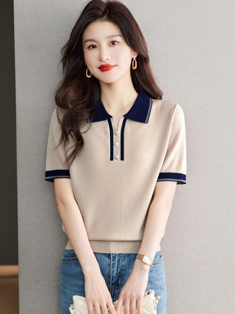 레이저 아이스 실크 반팔 티셔츠 여자 여름 톱 2025 뉴 콘트라스트 폴로 칼라 텐셀 중소매 얇은 스웨터