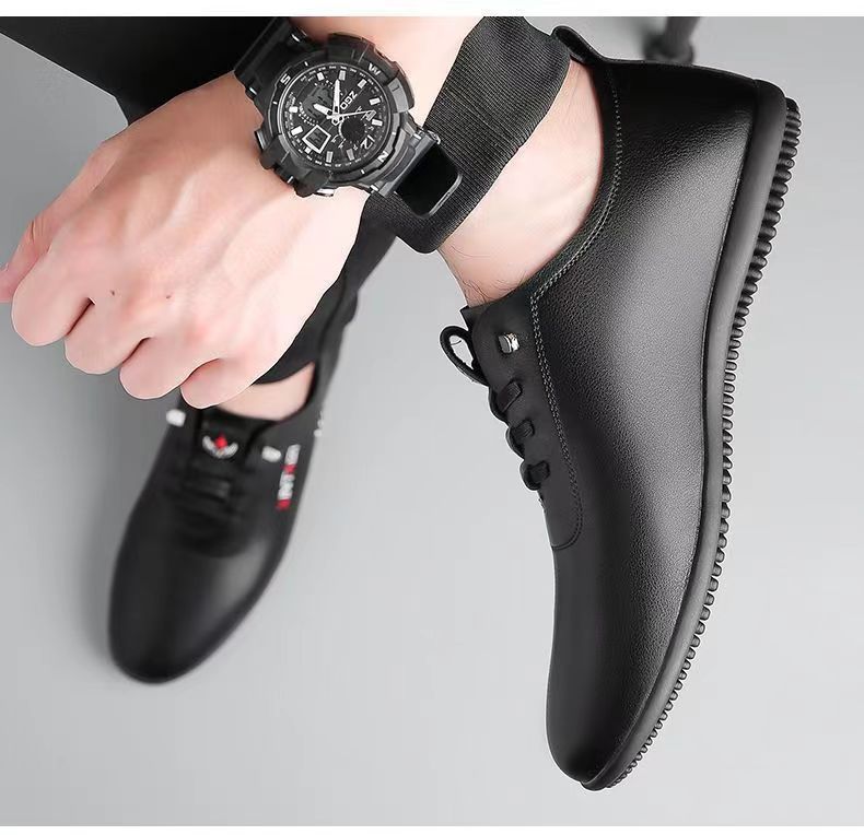 국경을 넘는 새로운 스타일의 남성 캐주얼 신발, 통기성 좋고 편안하며 다용도인 가죽 신발, 한국 스타일의 부드러운 밑창의 흰색 슬립온 구두스토어 가기