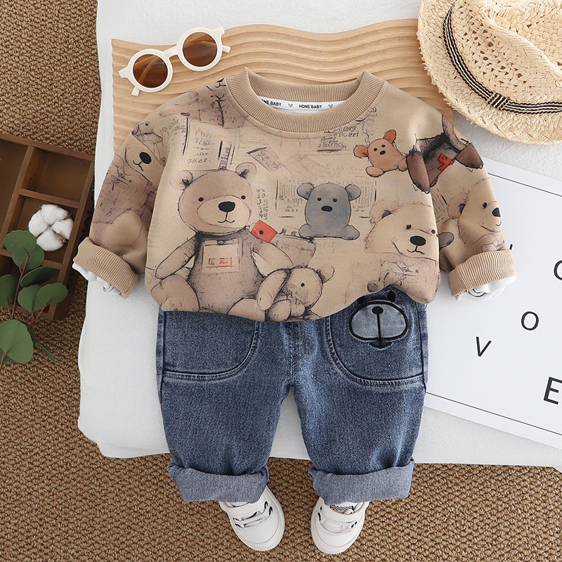 새로운 어린이 크루 넥 스웨트 셔츠 봄 한국 스타일 봄과 가을 캐주얼 스웨트 만화 곰 세트 유행 의류스토어 가기