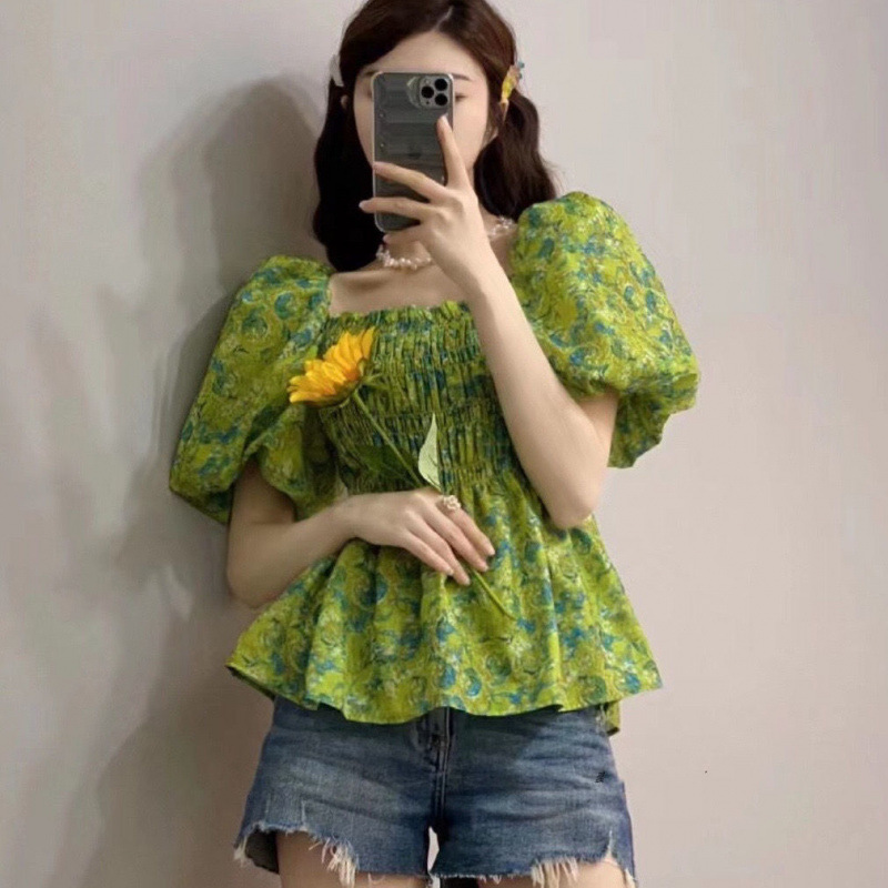 통통녀 여름 옷 여성 2025 새로운 프랑스 스타일 슈퍼 페어리 퍼프 슬리브 탑 스퀘어 칼라 플로랄 셔츠 트렌디 숄더스토어 가기