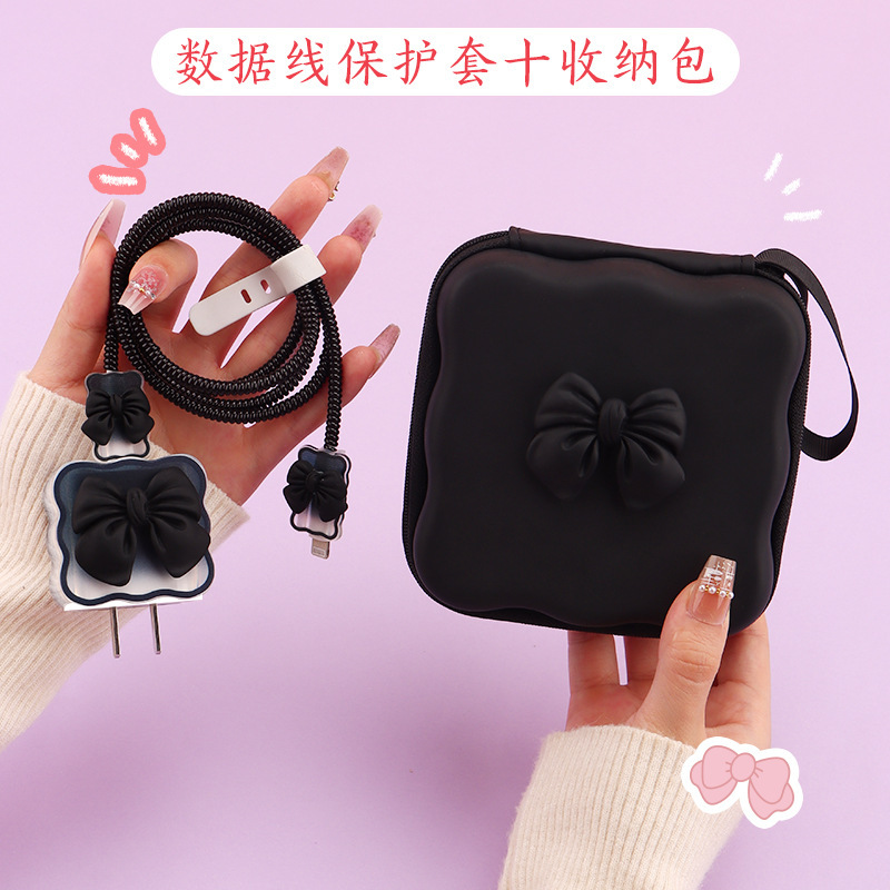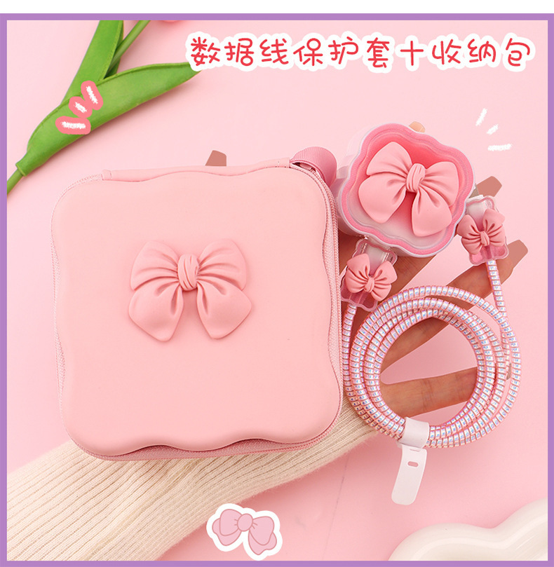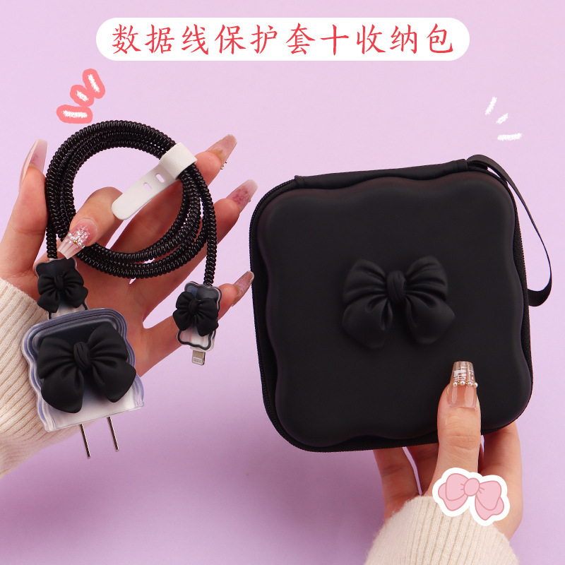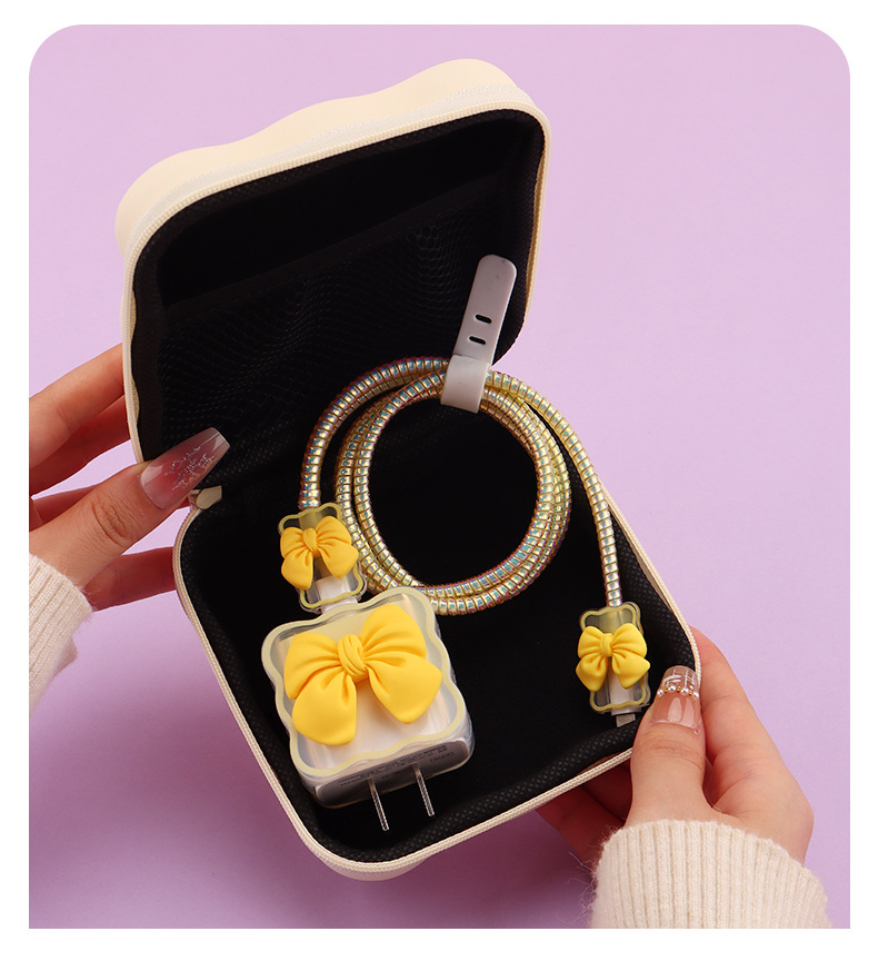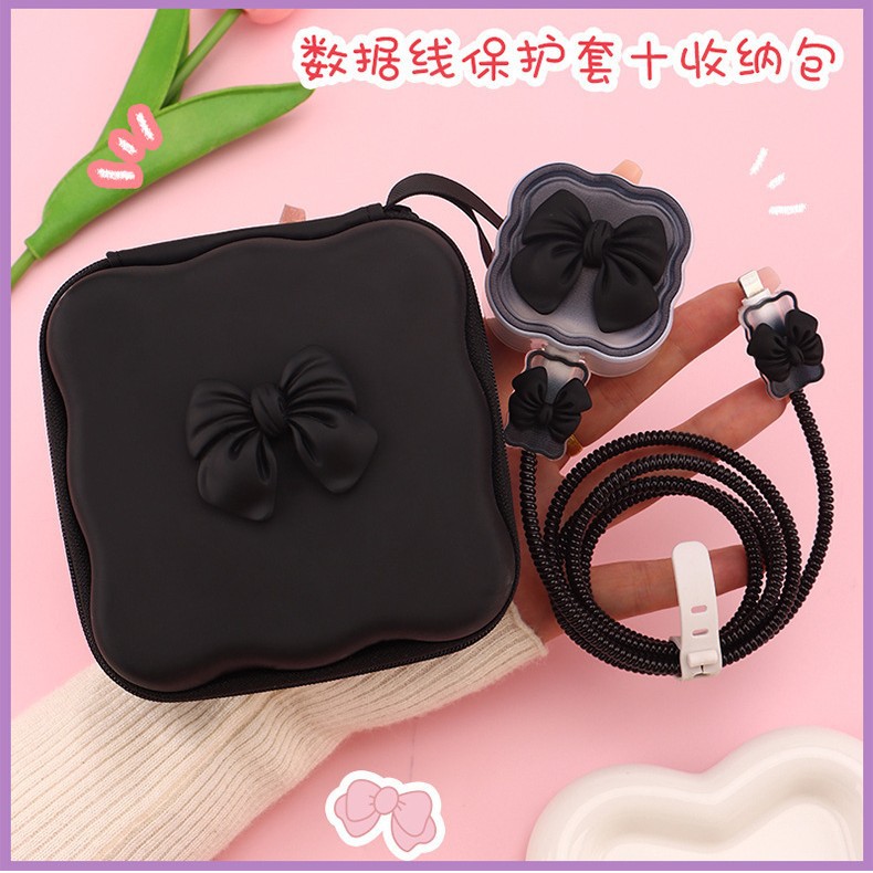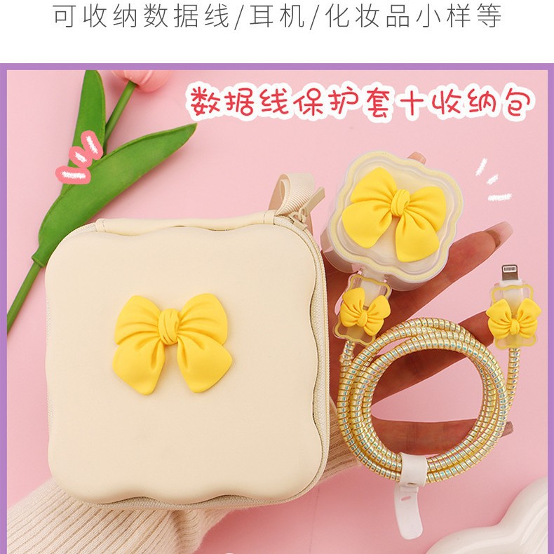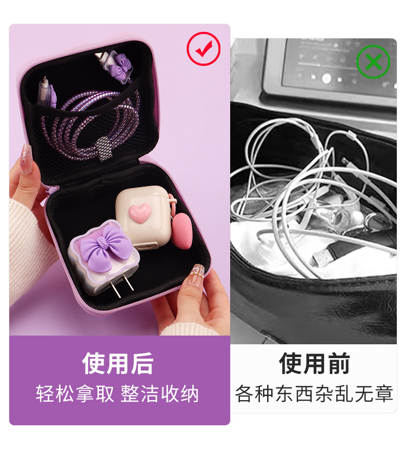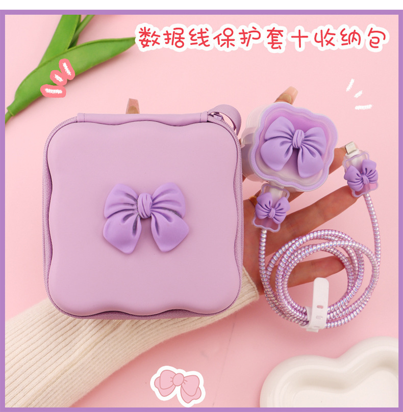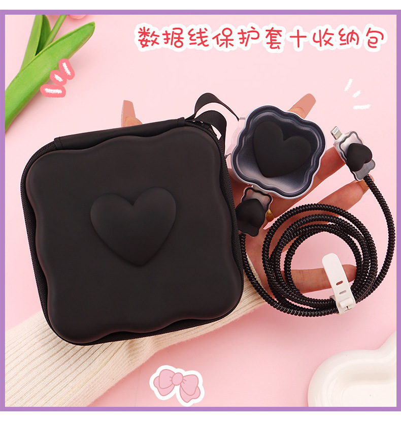 五件套包含:1个充电器套,2个数据线接口保护套,1根数据线保护绳,1个绑带,5件套包装尺寸13*15*3cm