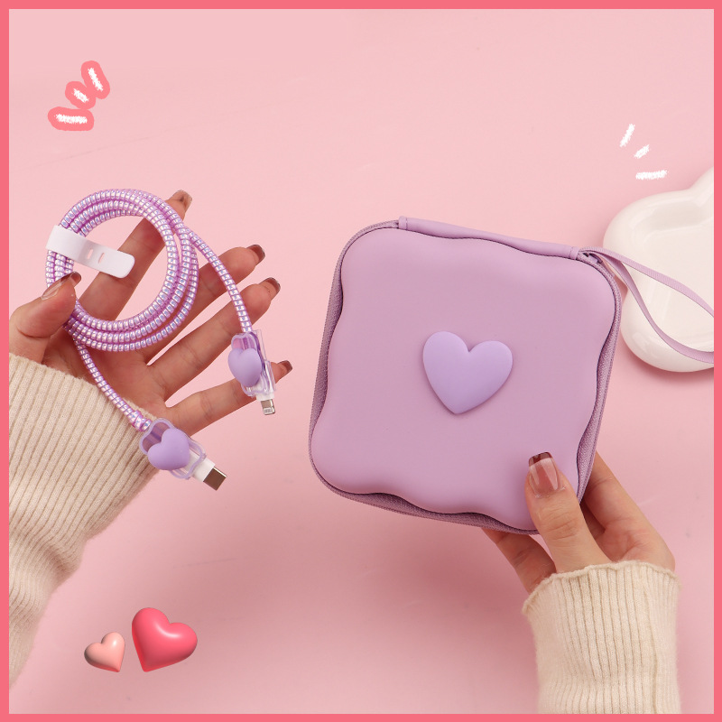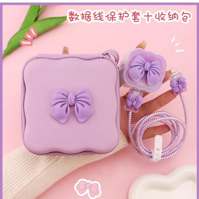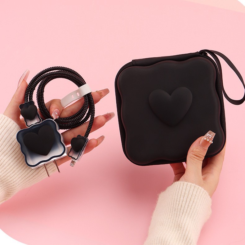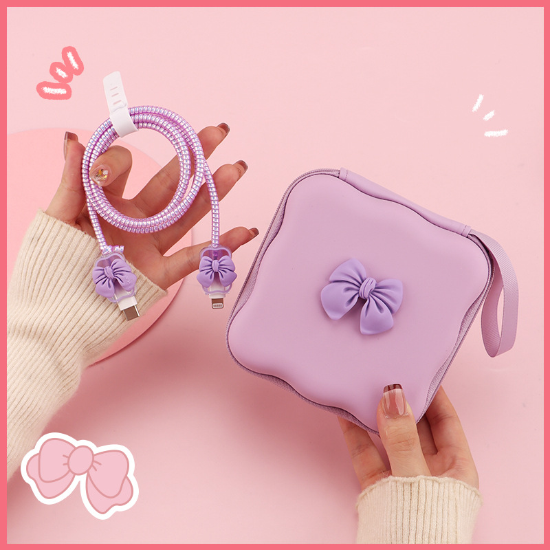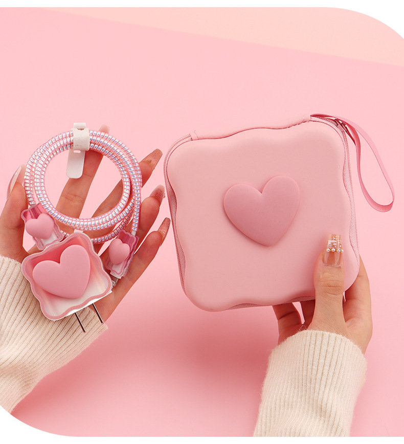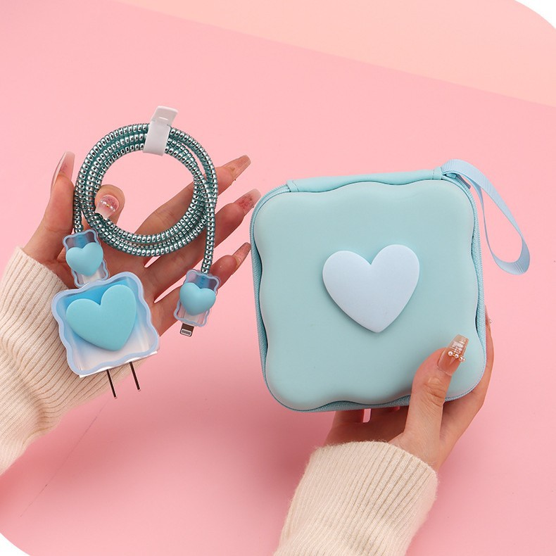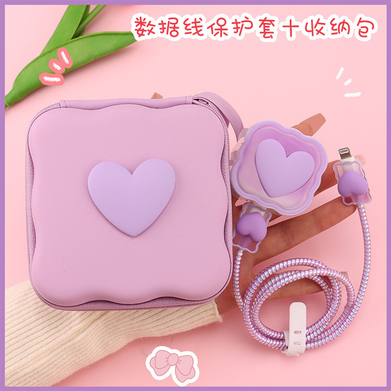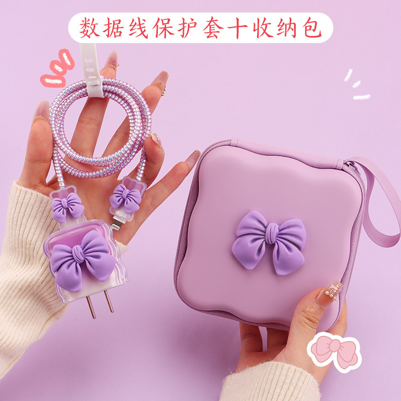 五件套包含:1个充电器套,2个数据线接口保护套,1根数据线保护绳,1个绑带,5件套包装尺寸13*15*3cm