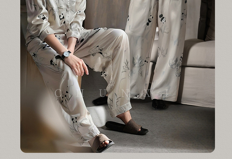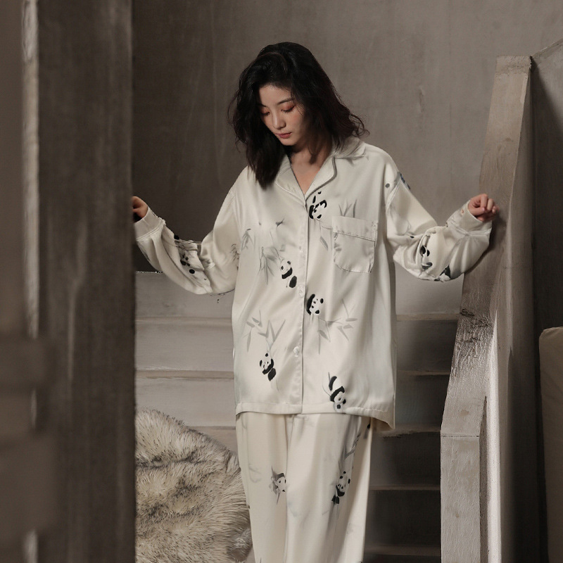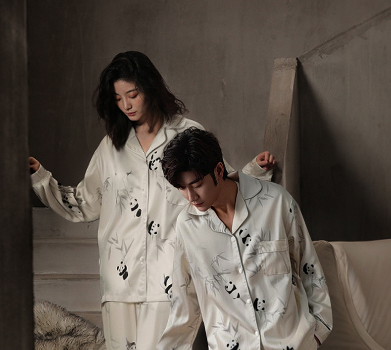 커플 잠옷 여성용 긴팔 쿨 아이스 실크 봄 및 가을 실크 폭발 플러스 사이즈 남성 홈 옷은 세트 입을 수 있습니다스토어 가기