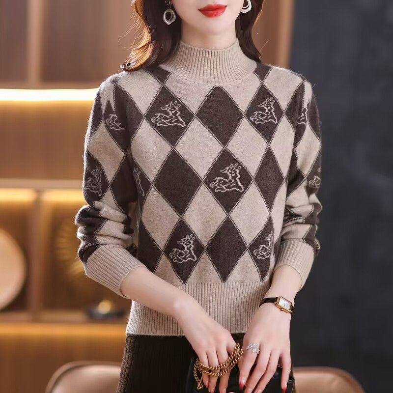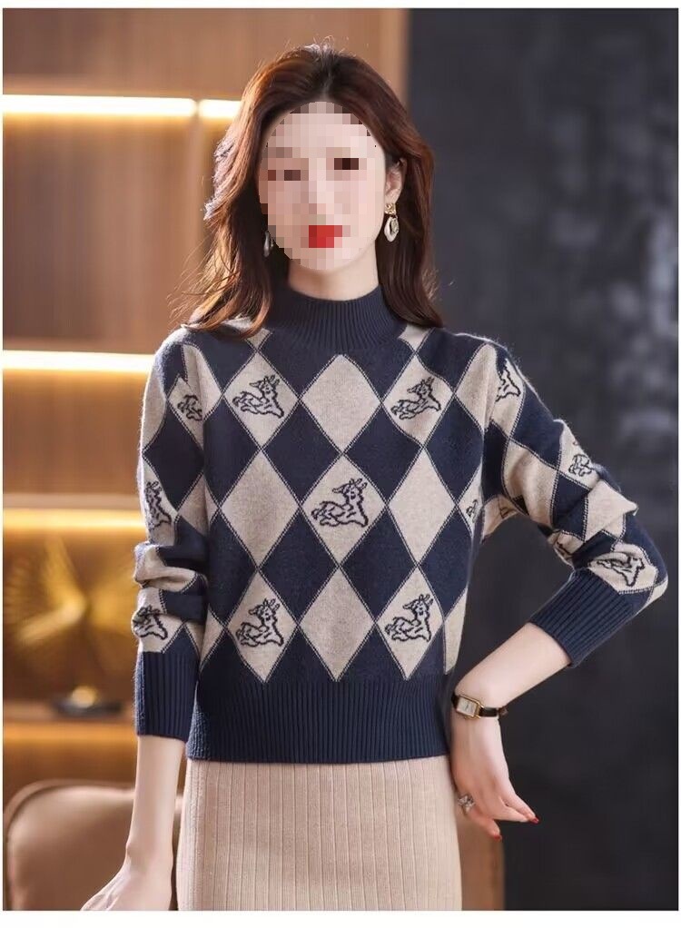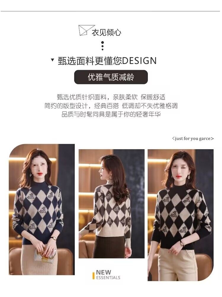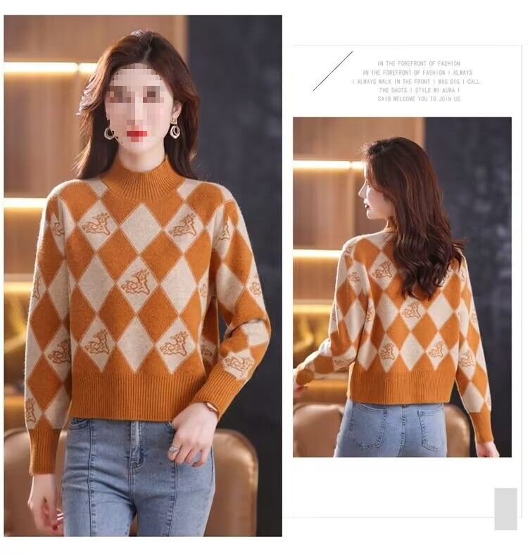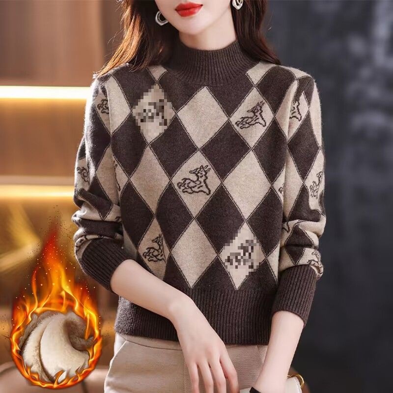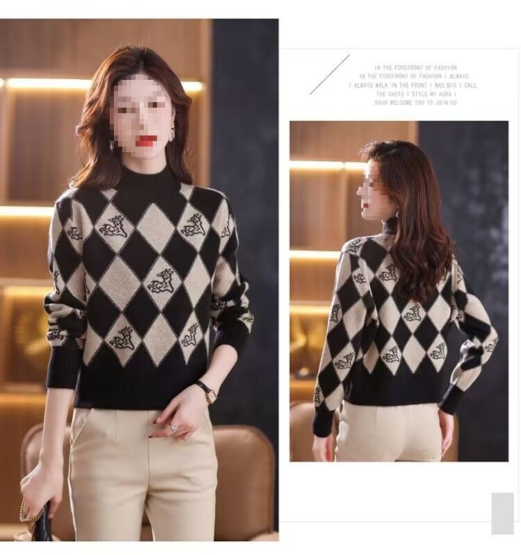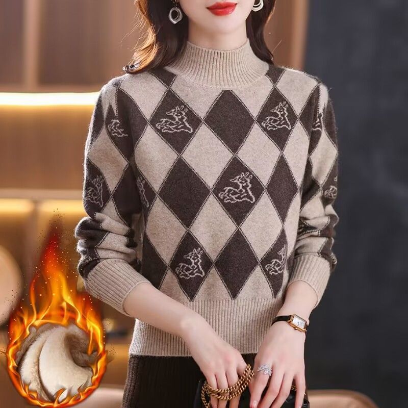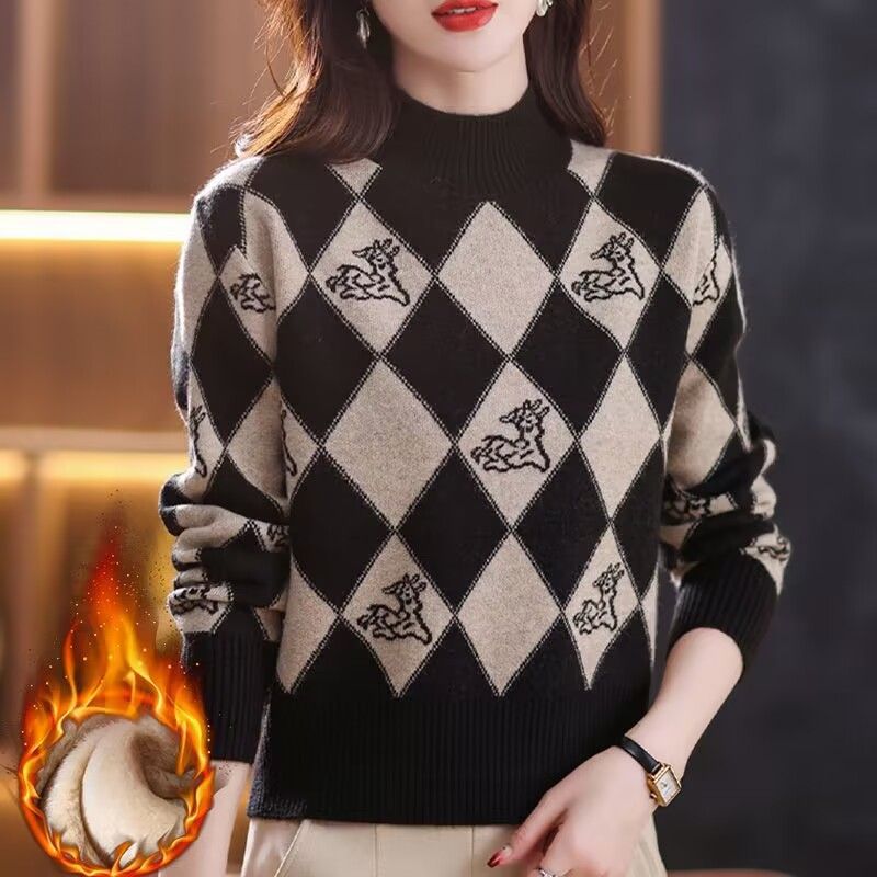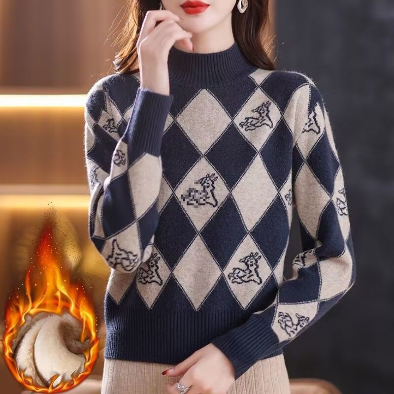 기모 두꺼운 가을과 겨울 새로운 짧은 스웨터 여성의 세련된 마름모 자카드 느슨한 니트베이스 탑