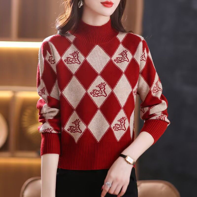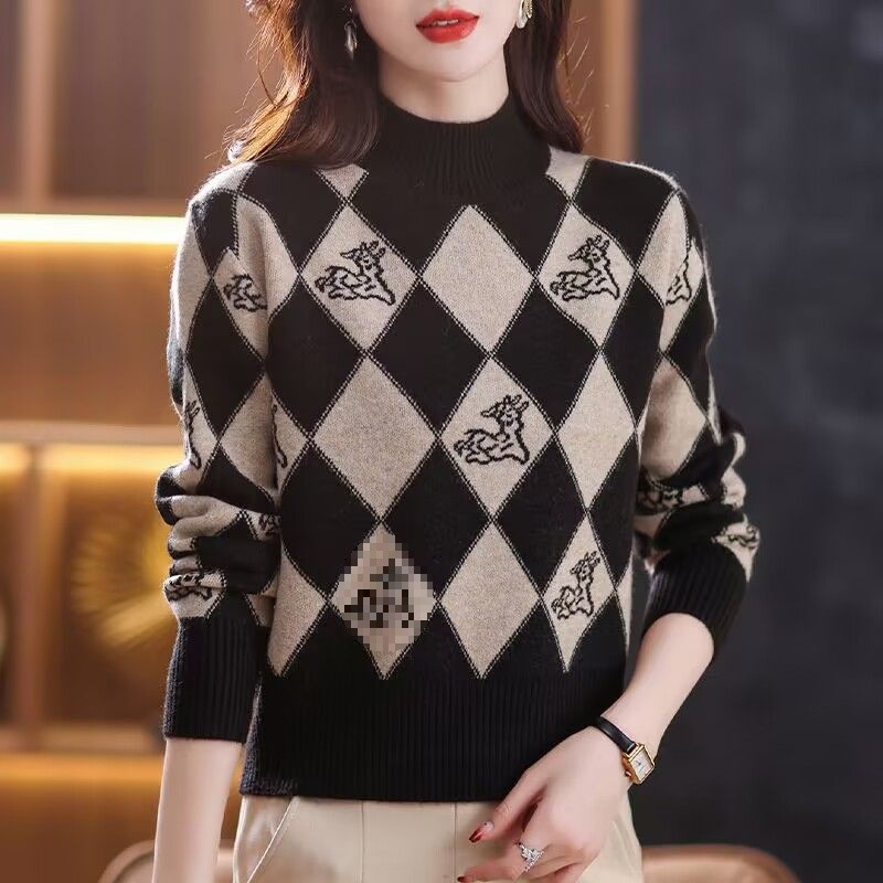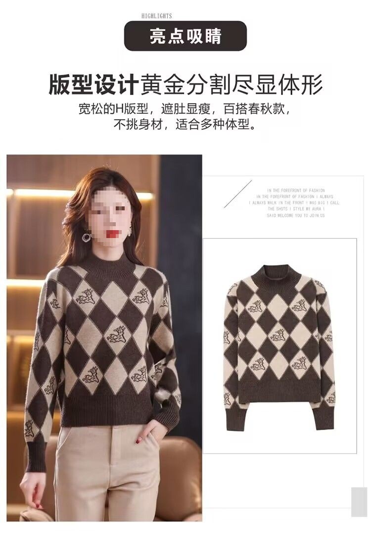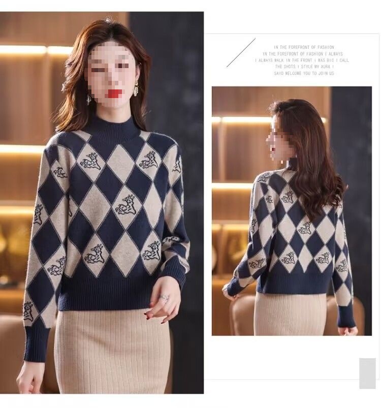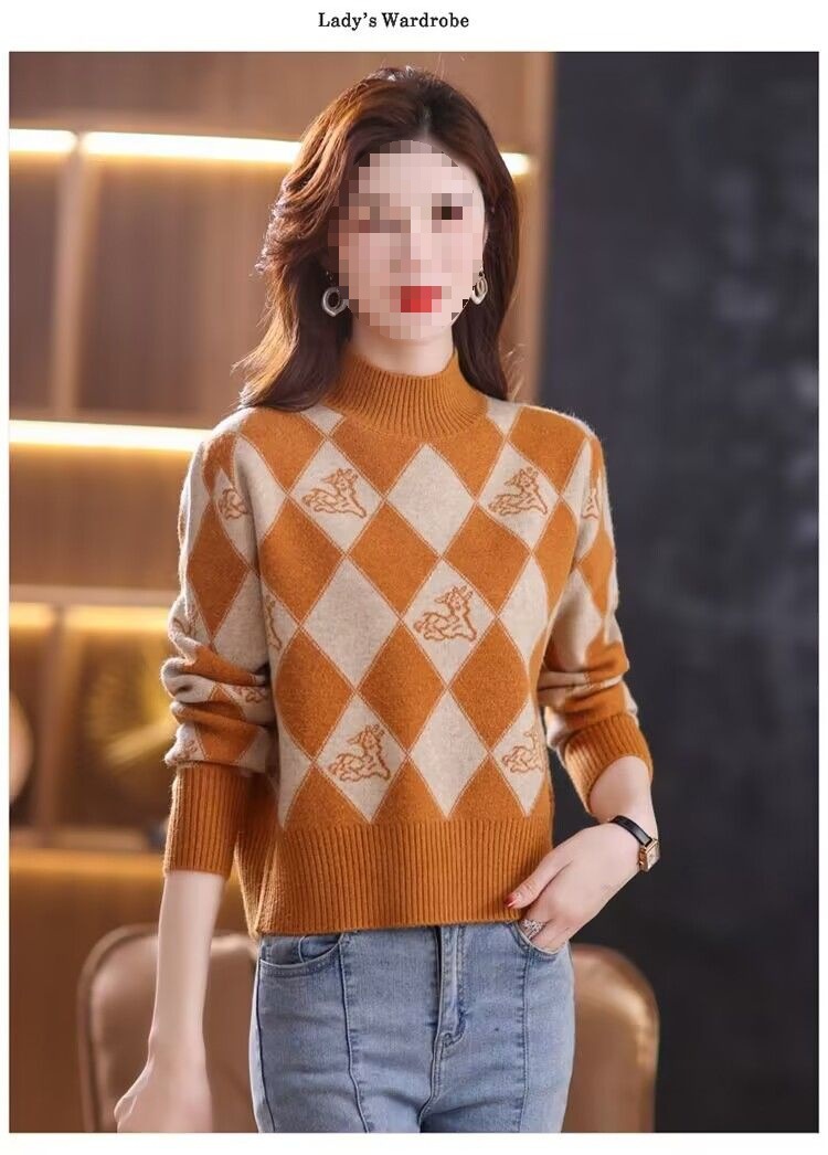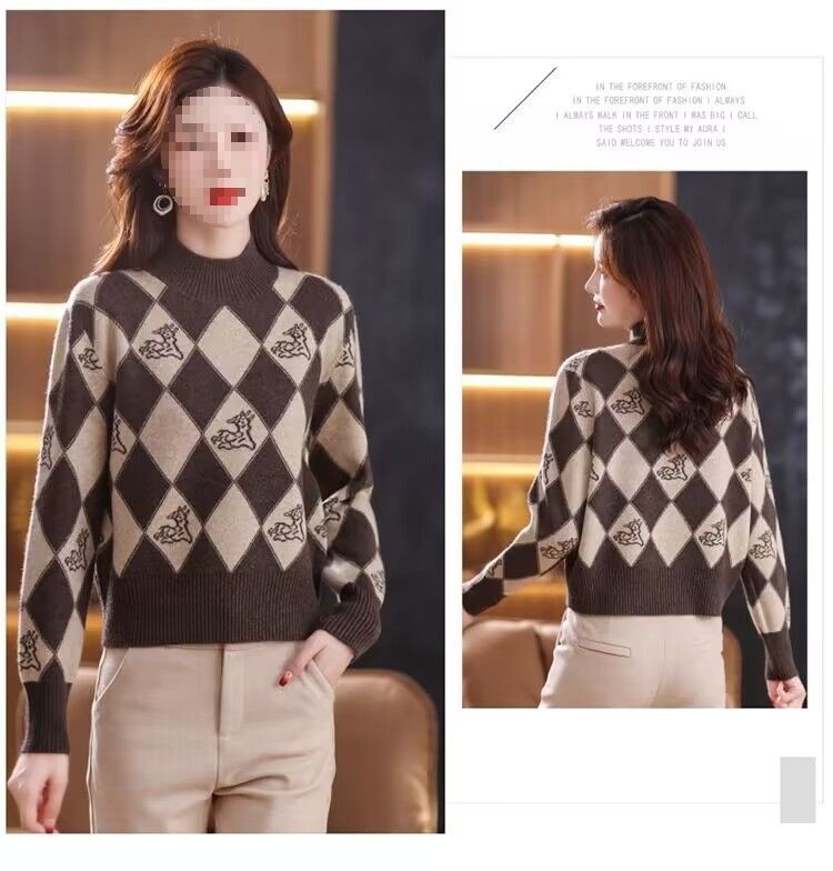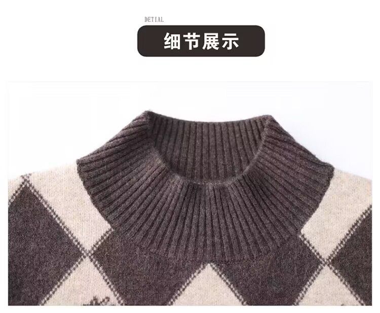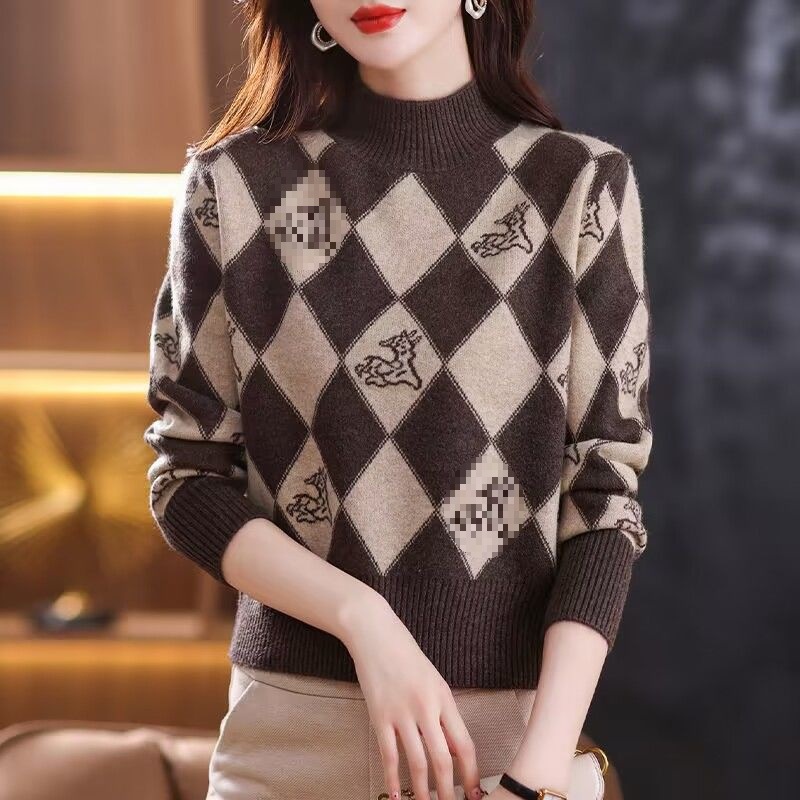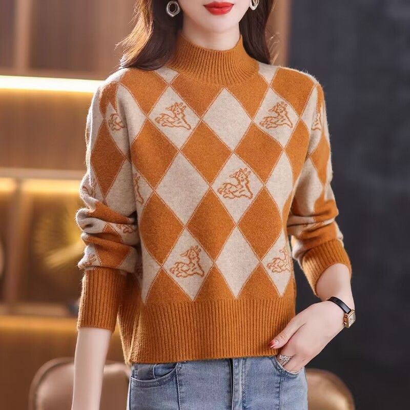기모 두꺼운 가을과 겨울 새로운 짧은 스웨터 여성의 세련된 마름모 자카드 느슨한 니트베이스 탑