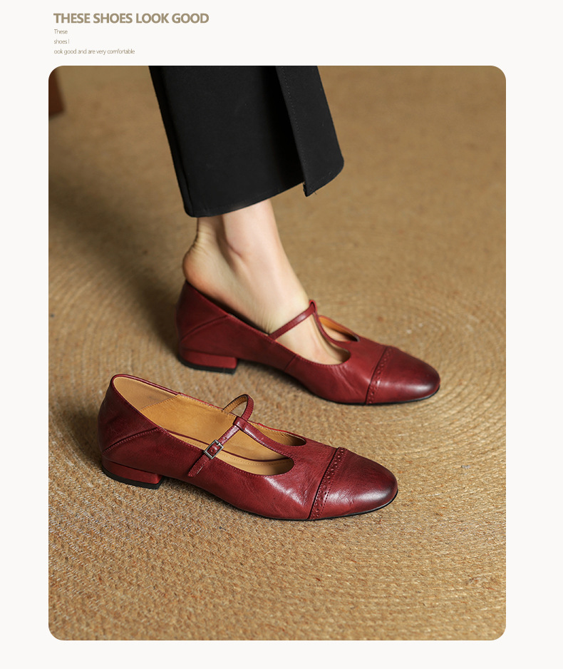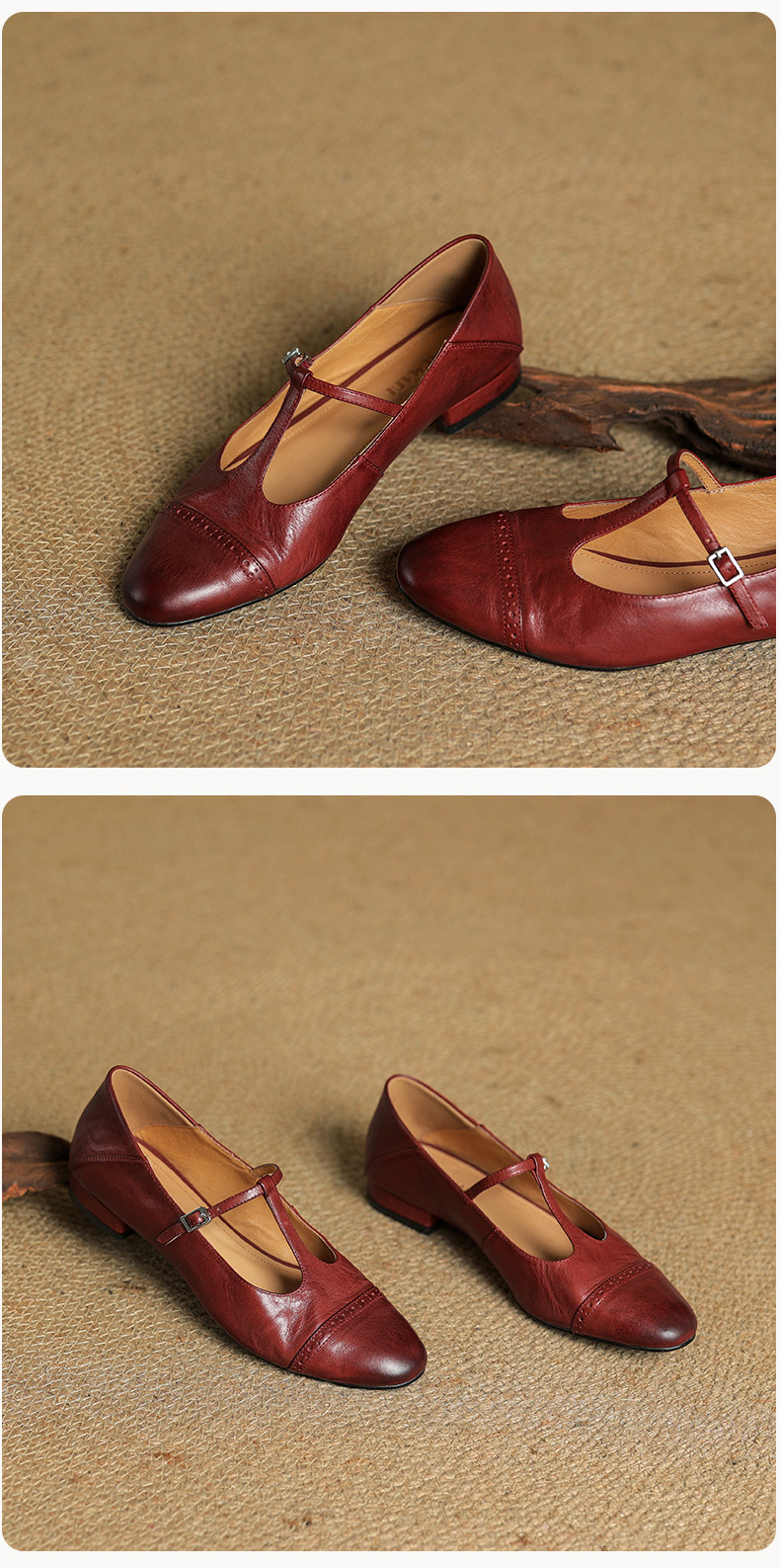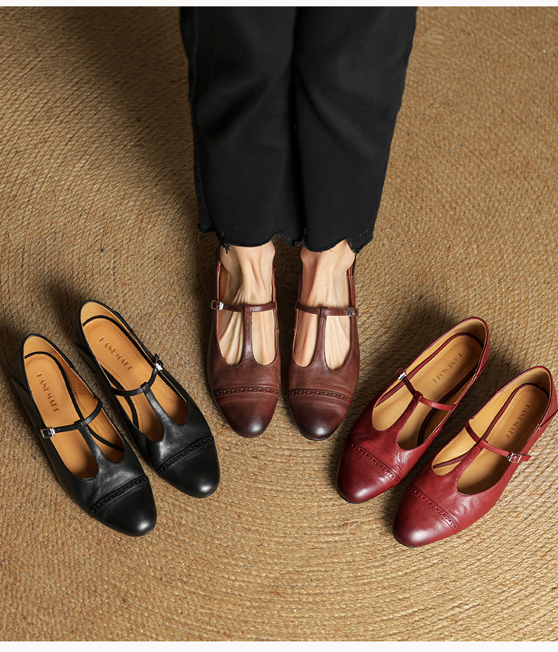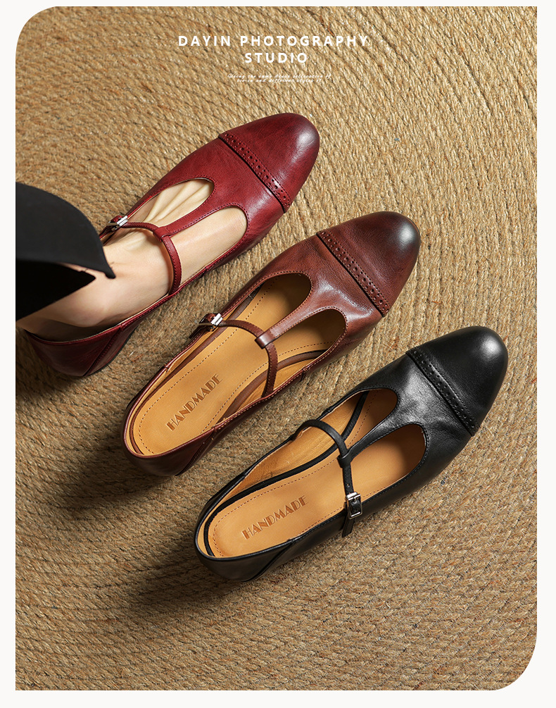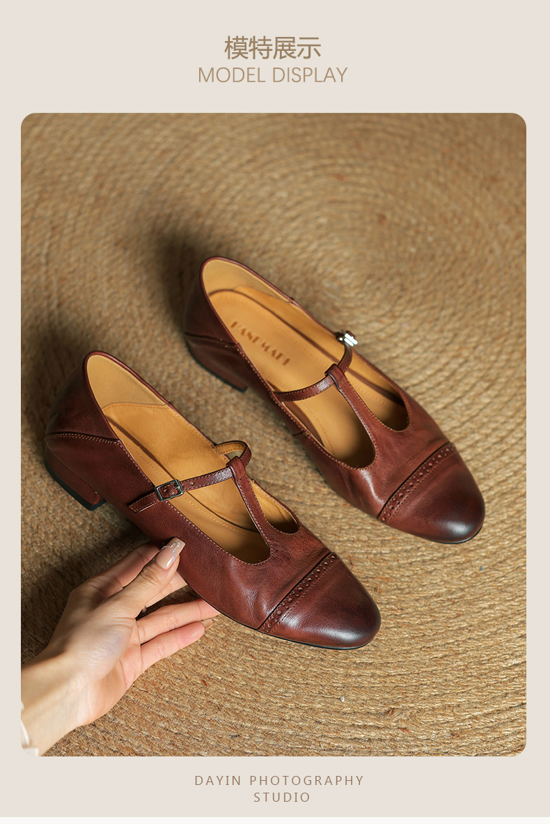 소가죽의 첫 번째 레이어 2025 봄과 가을 복고풍 스타일 T 자형 신발 두꺼운 뒤꿈치 레드 메리 제인 신발 여성용 T 자형 신발스토어 가기