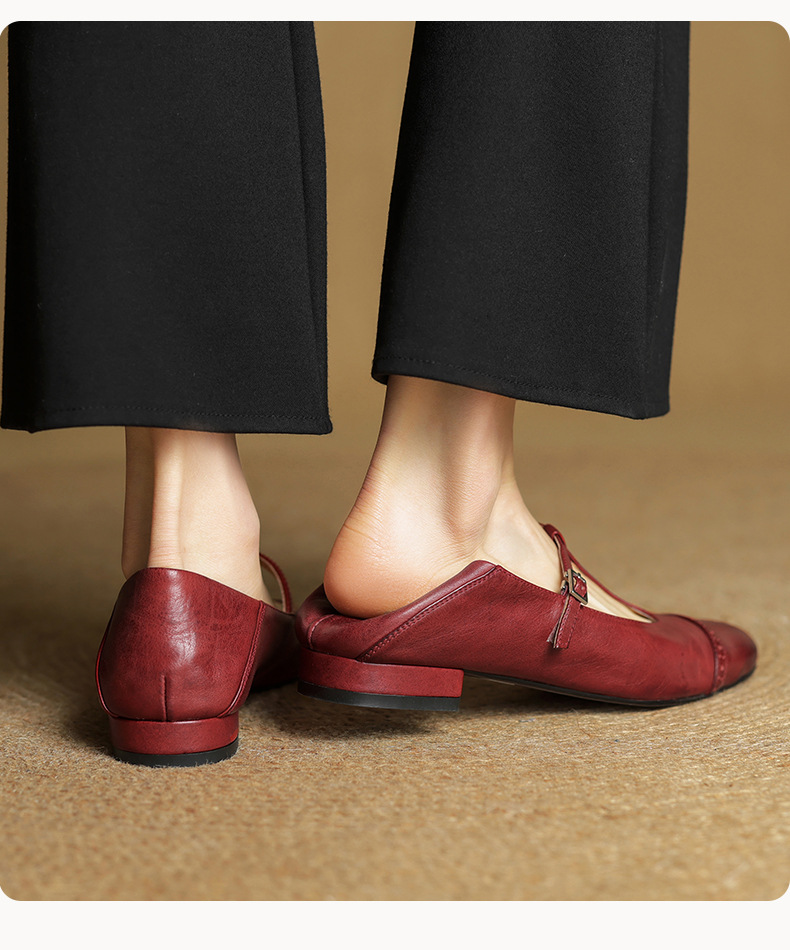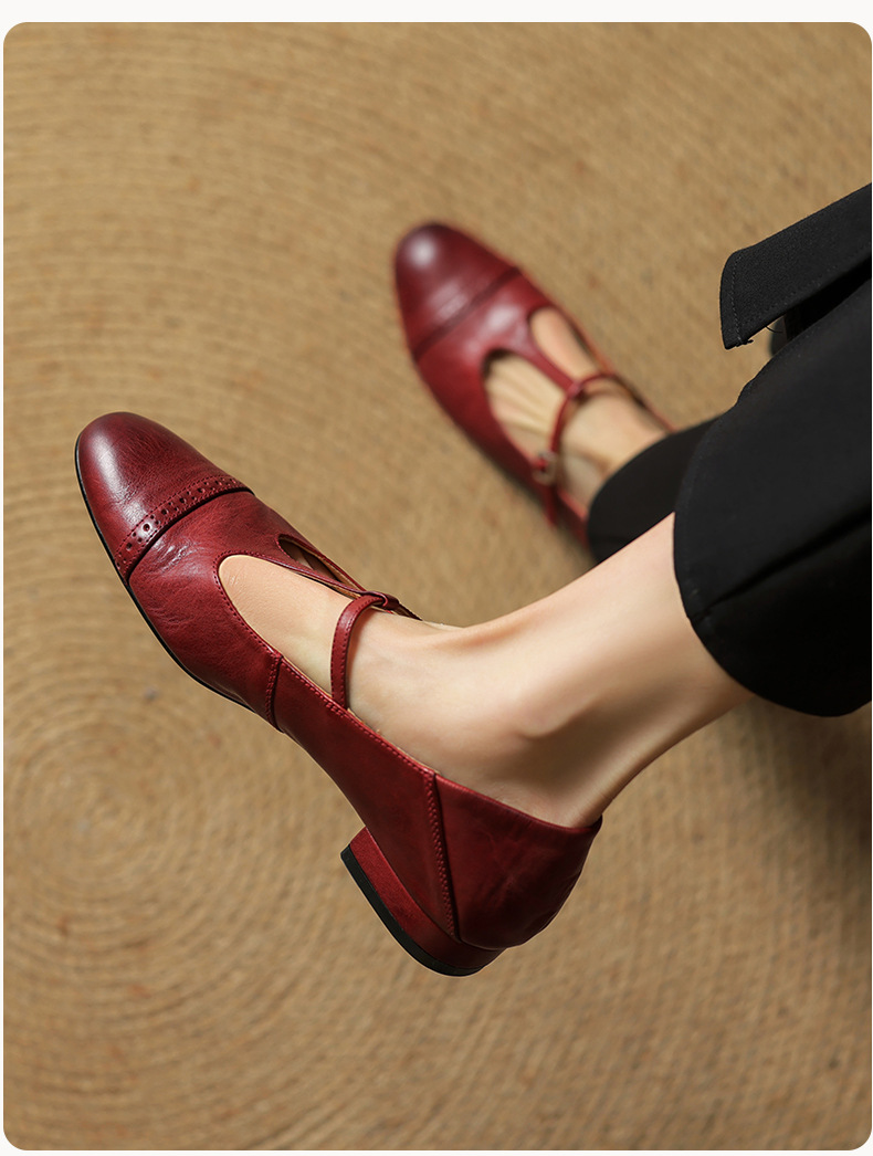 소가죽의 첫 번째 레이어 2025 봄과 가을 복고풍 스타일 T 자형 신발 두꺼운 뒤꿈치 레드 메리 제인 신발 여성용 T 자형 신발