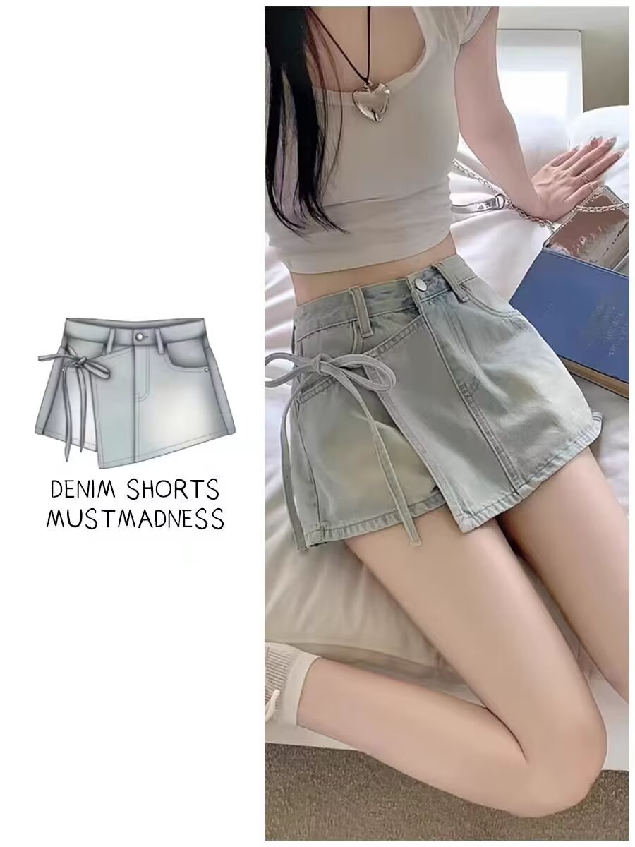가짜 투피스 데님 반바지 여성 여름 A 자형 높은 허리 불규칙한 서양식 스트랩 컬로 테스 작은 뜨거운 소녀 바지