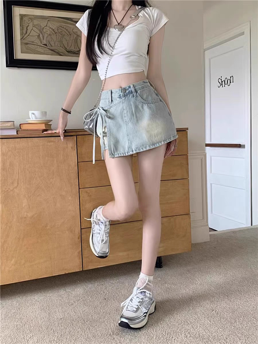 가짜 투피스 데님 반바지 여성 여름 A 자형 높은 허리 불규칙한 서양식 스트랩 컬로 테스 작은 뜨거운 소녀 바지스토어 가기