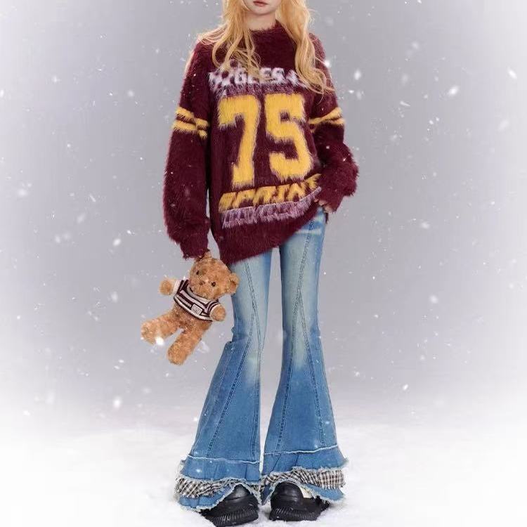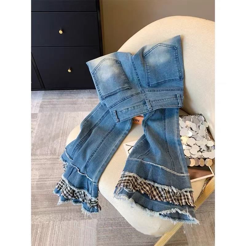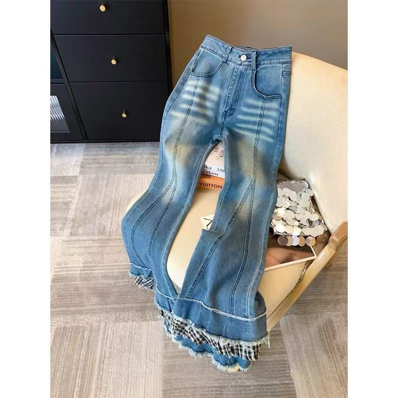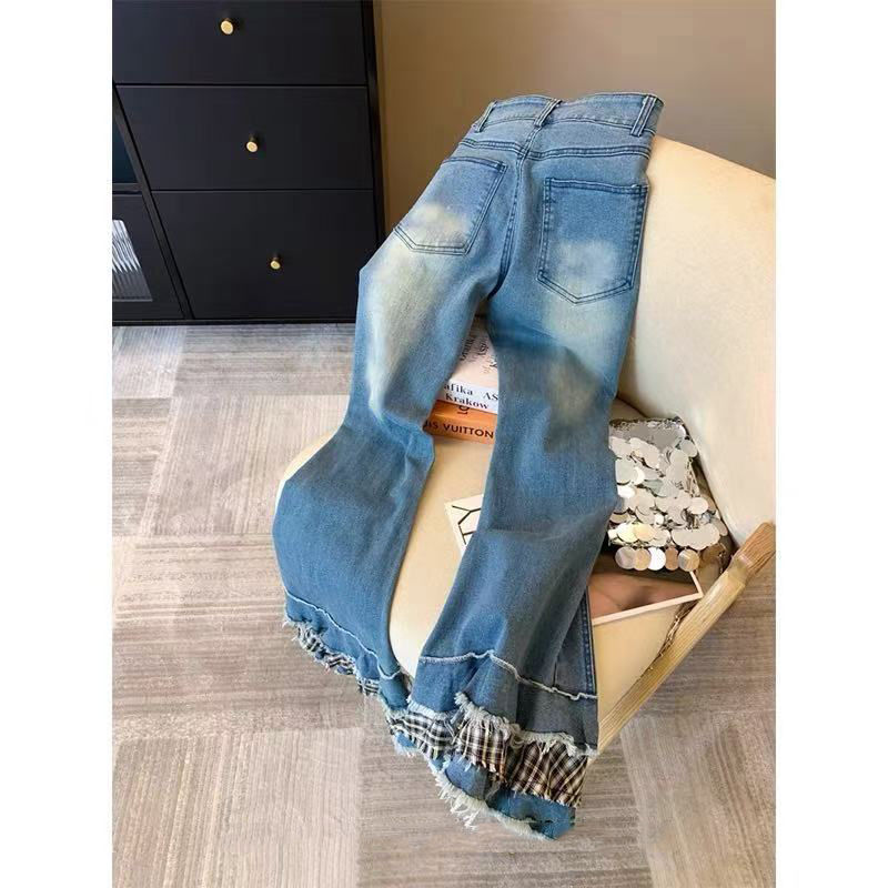 리얼 샷 간단한 마이크로 라 청바지 여성의 가을과 겨울 틈새 격자 무늬 스티칭 슬림 디자인 센스 올매치 트렌디 팬츠