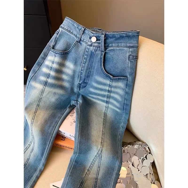 리얼 샷 간단한 마이크로 라 청바지 여성의 가을과 겨울 틈새 격자 무늬 스티칭 슬림 디자인 센스 올매치 트렌디 팬츠스토어 가기
