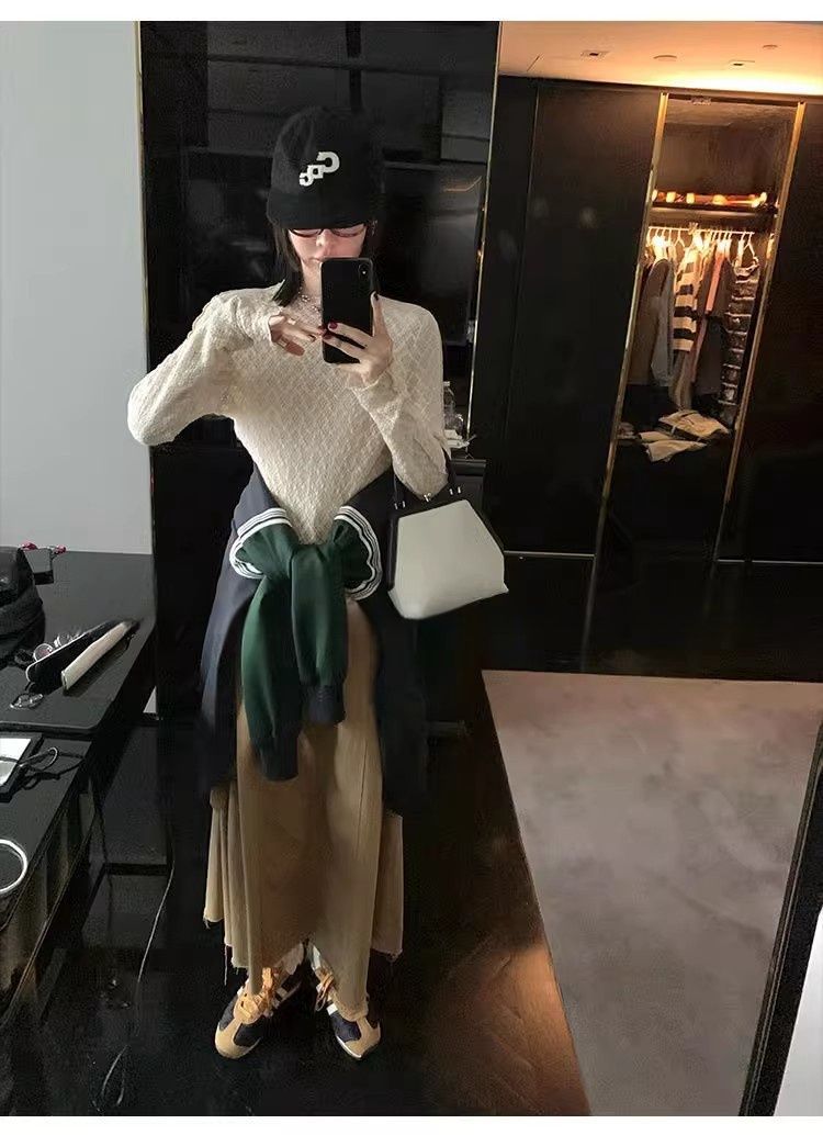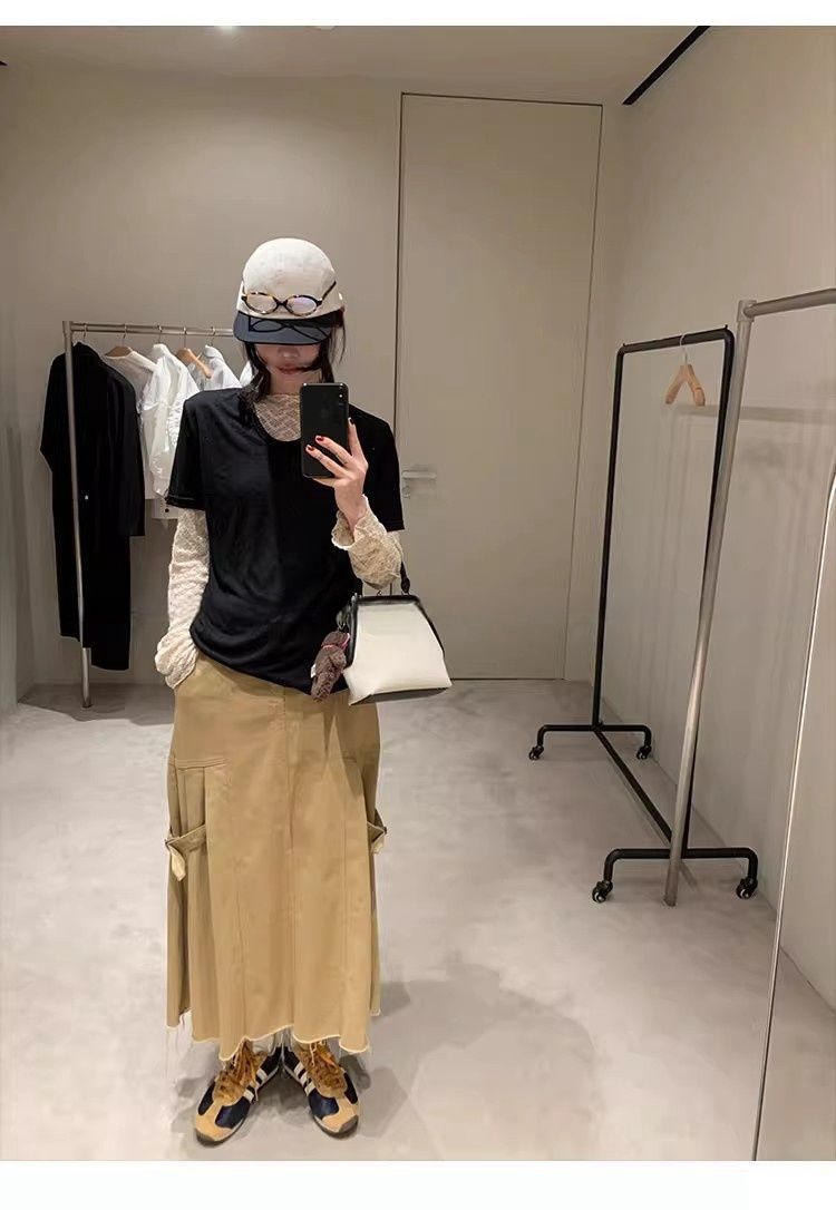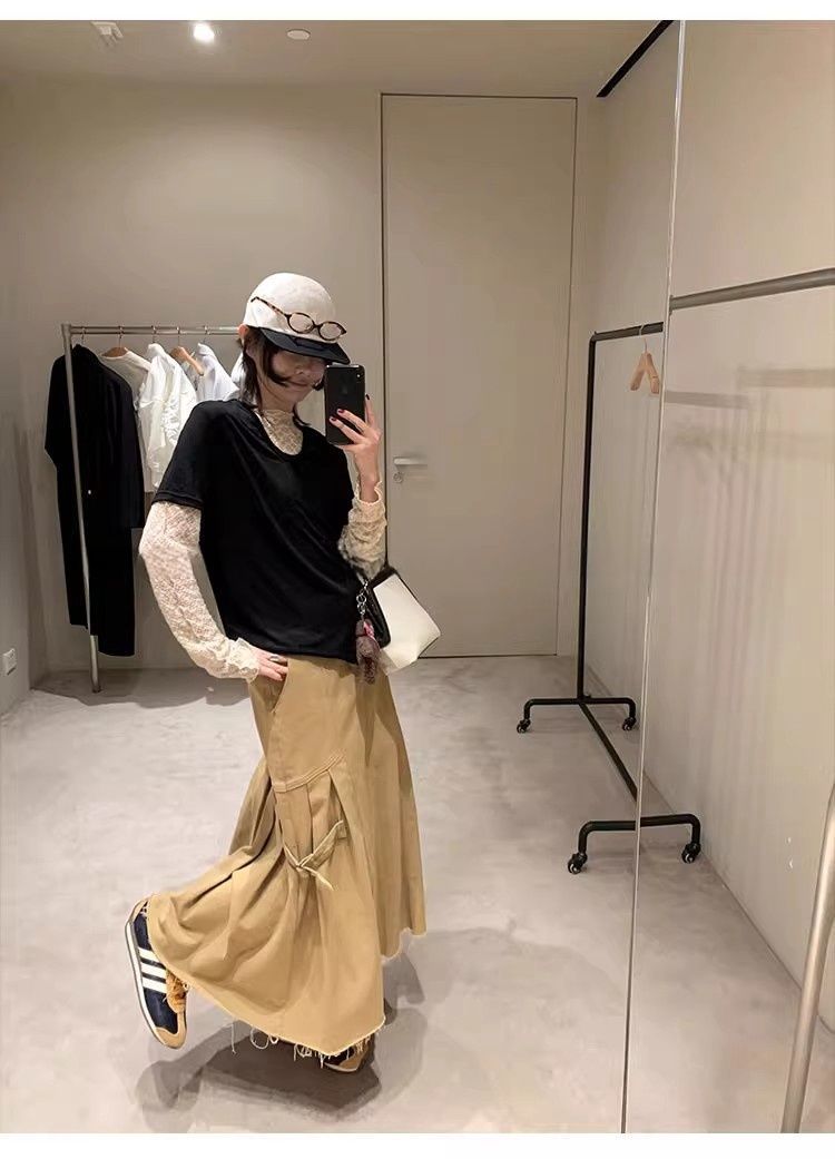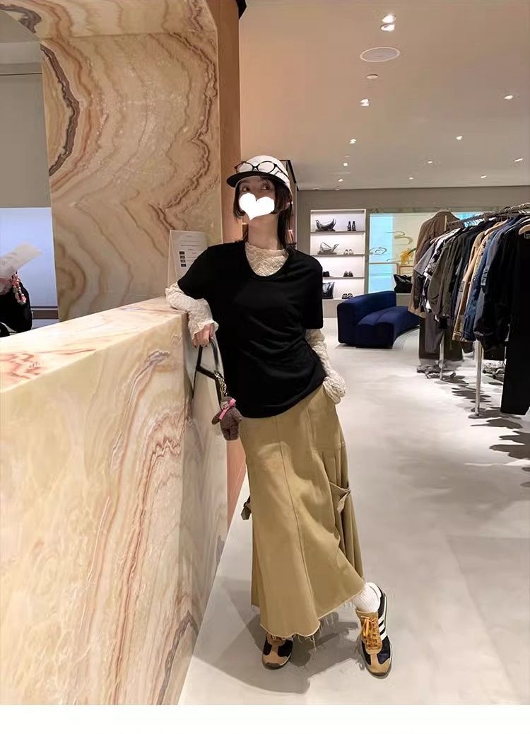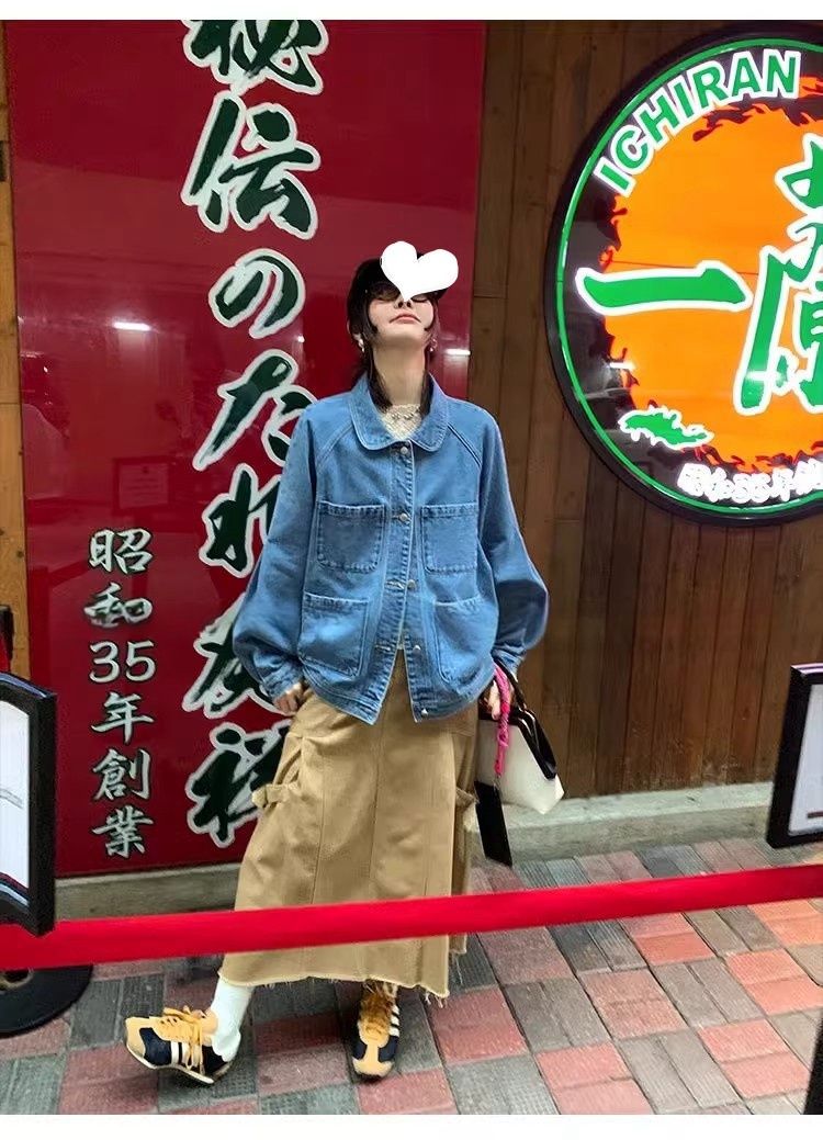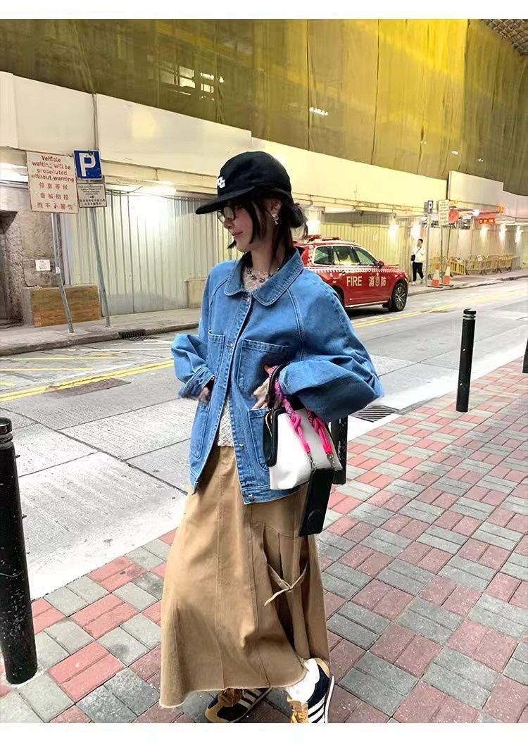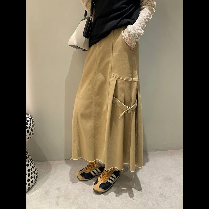 카키 불규칙한 높은 허리 데님 스커트 여성 봄과 여름 플러스 사이즈 통통녀 복고풍 디자인 주름 미디 스커트스토어 가기