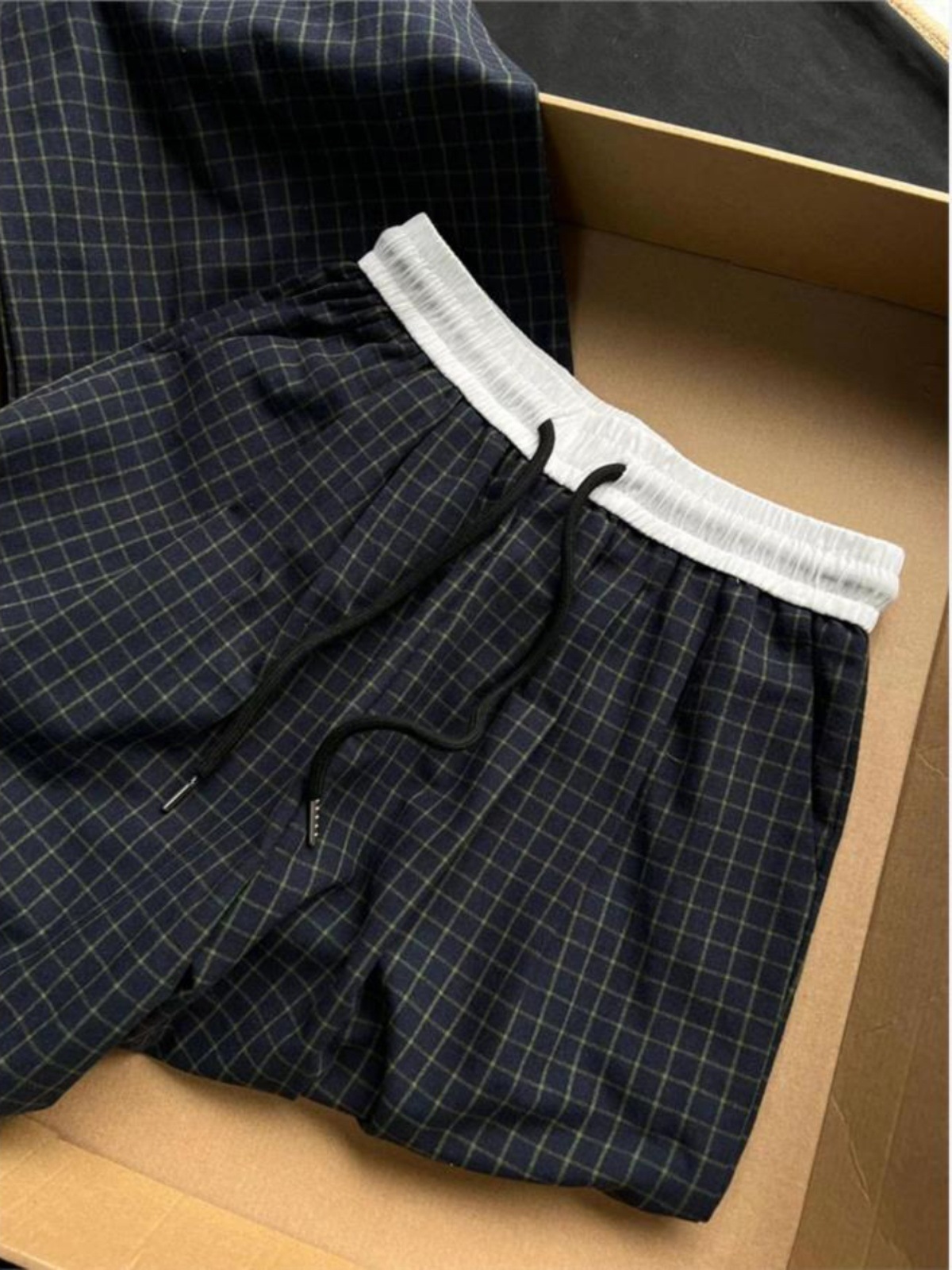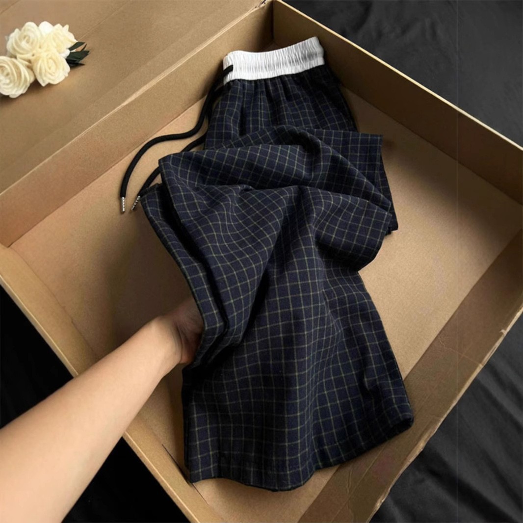 아메리칸 스타일 레트로 네이비 격자 무늬 캐주얼 바지 여성용 봄 얇은 2025 새로운 느슨한 투약 직선 다리 넓은 다리 바지스토어 가기