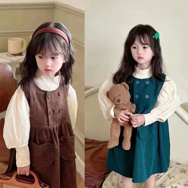 女童套装厚欧棉双面磨毛网纱泡泡袖打底衫加斜纹背心裙秋冬装新款스토어 가기