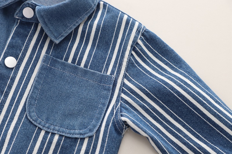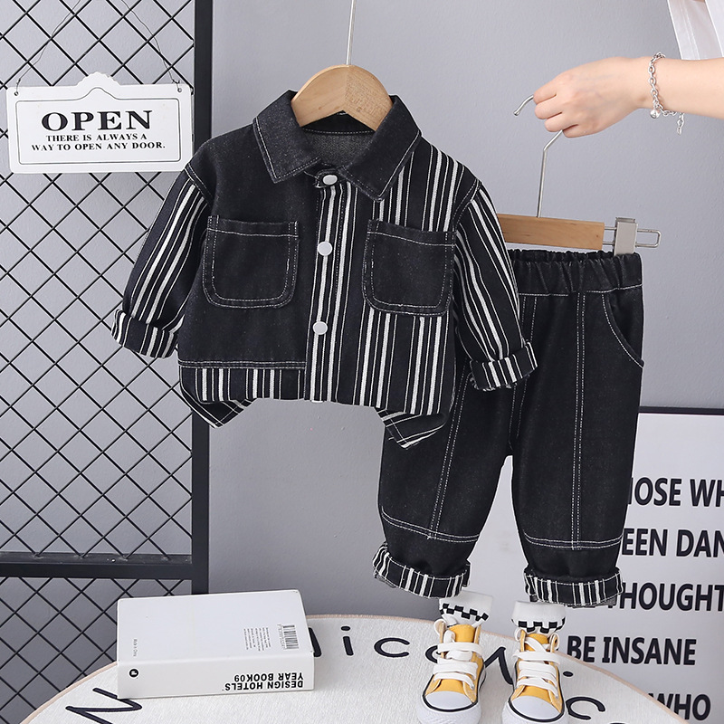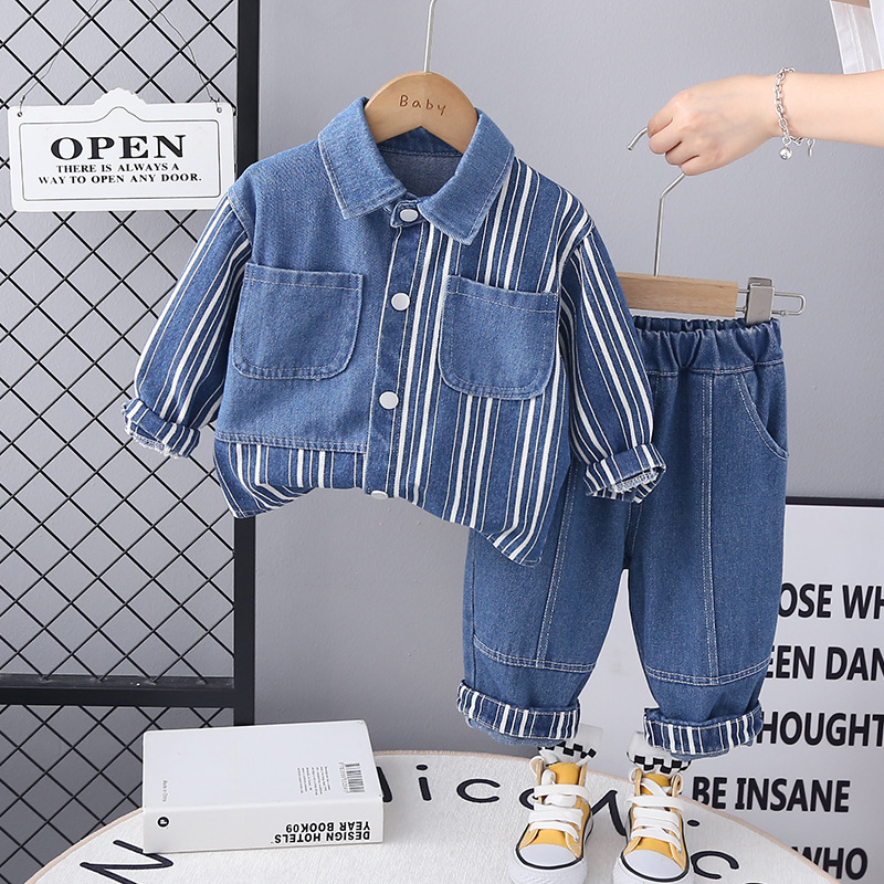 봄 2025 새로운 아동복 수직 데님 셔츠 소년 투피스 어린이 봄 의류 어린이 세트 세대 헤어스토어 가기