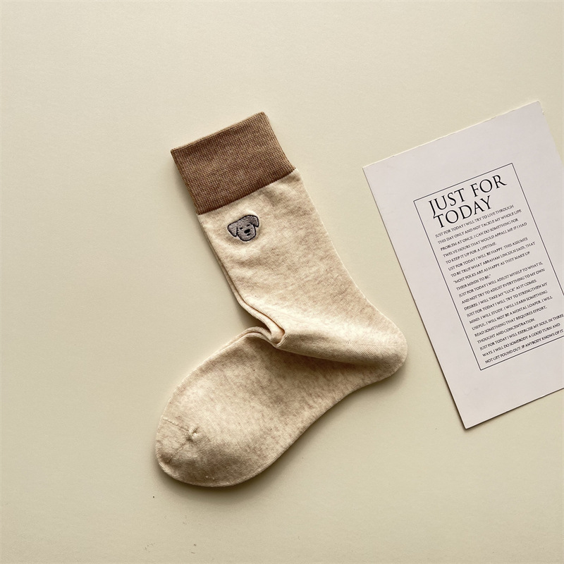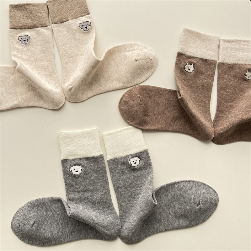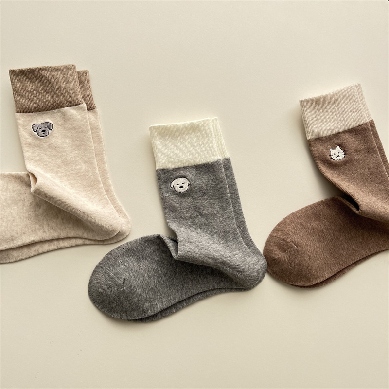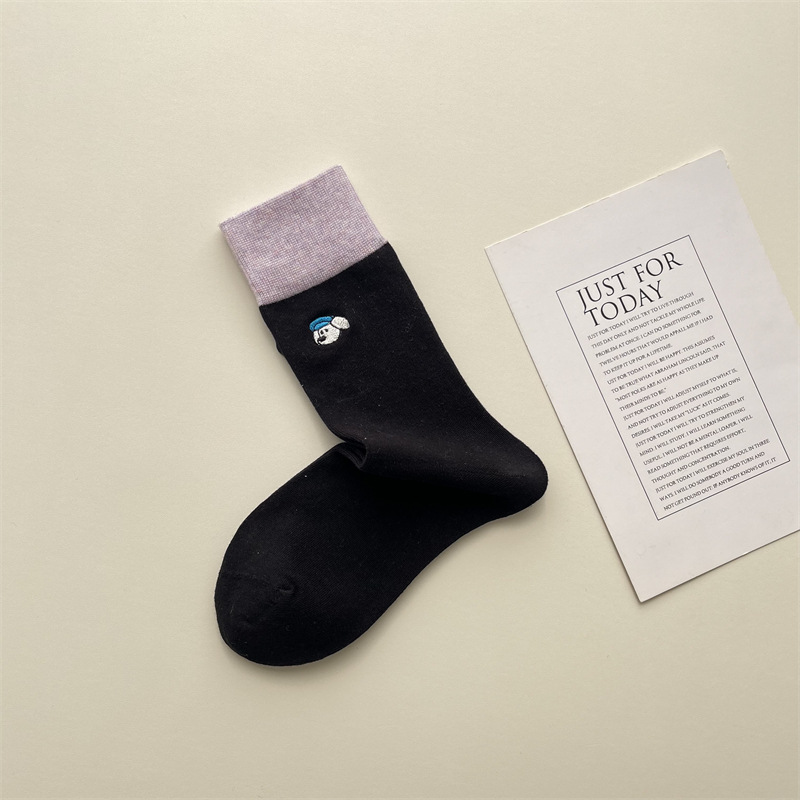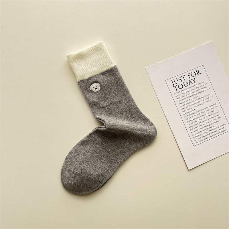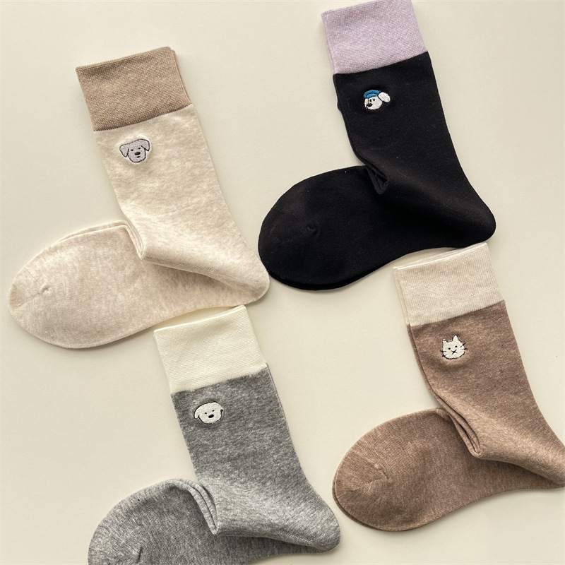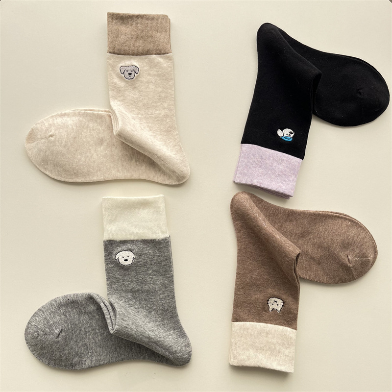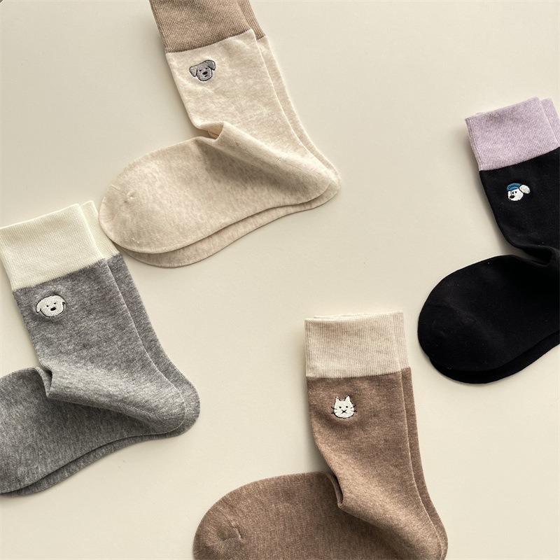 봄과 여름 새로운 학술 스타일 대조 컬러 양말 여성 한국 스타일 자수 만화 강아지 미드 사이즈 양말 뼈없는 캐주얼 코튼 양말