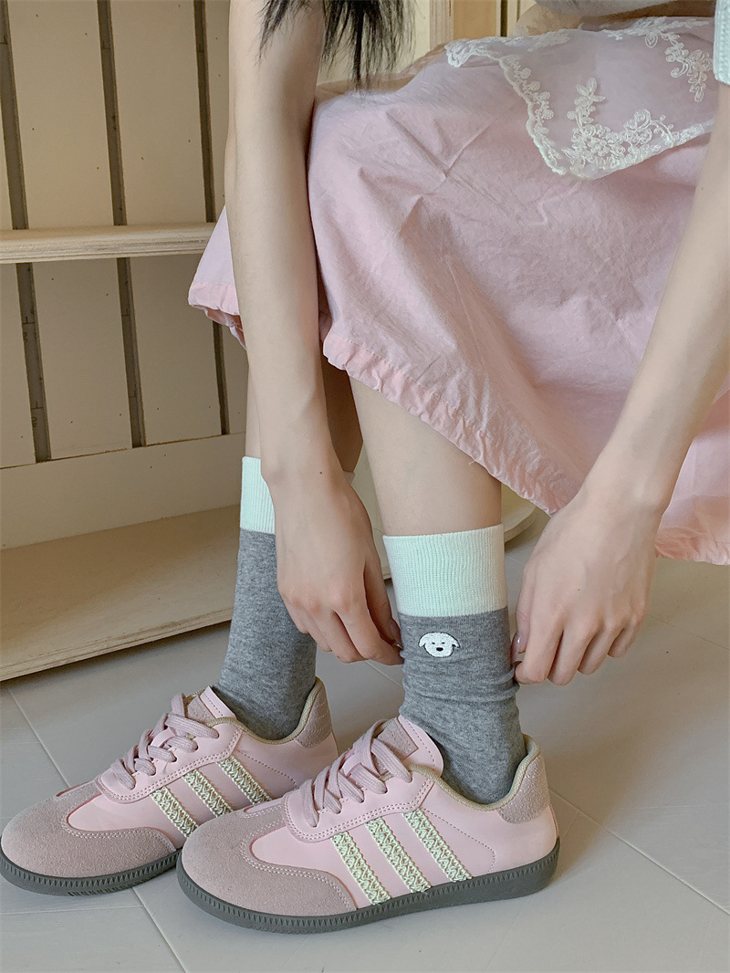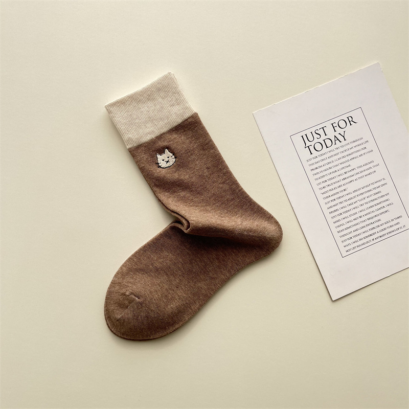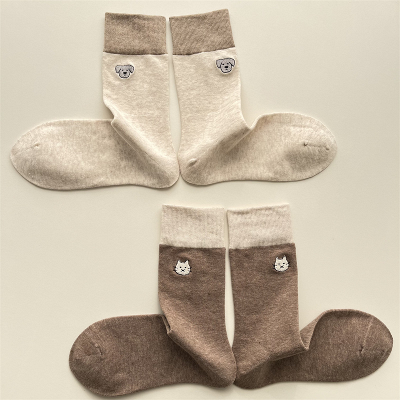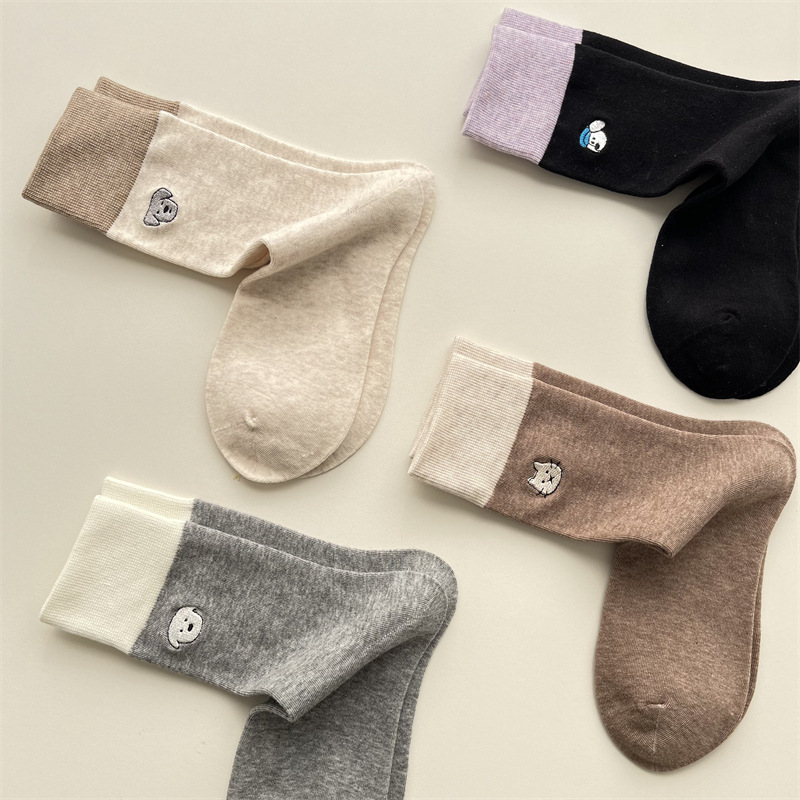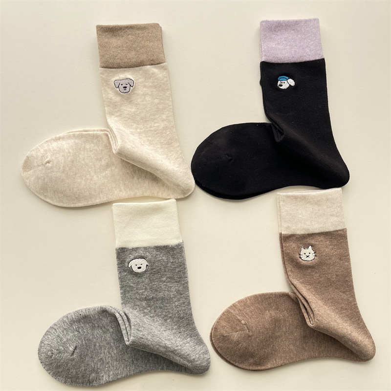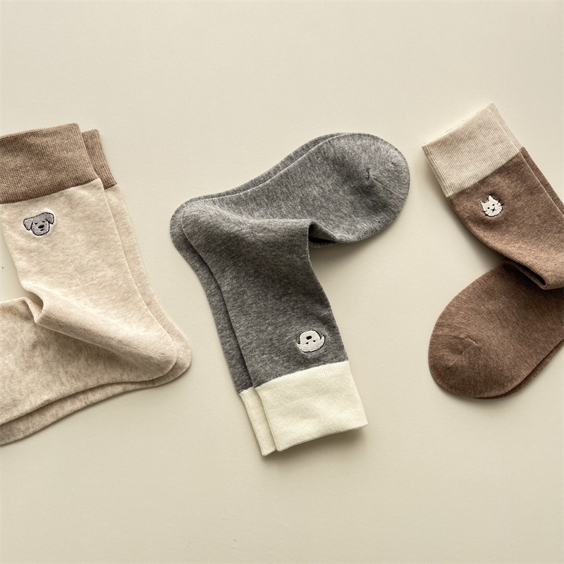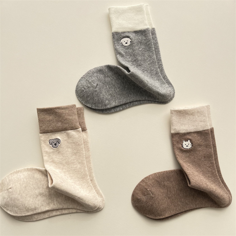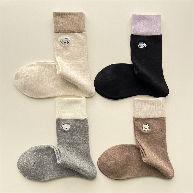봄과 여름 새로운 학술 스타일 대조 컬러 양말 여성 한국 스타일 자수 만화 강아지 미드 사이즈 양말 뼈없는 캐주얼 코튼 양말