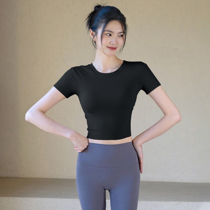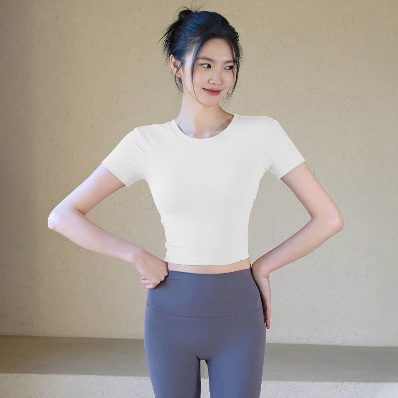 가슴 패드와 함께 요가 의류 여성의 봄과 여름 섹시한 아름다운 백 스포츠 탑 반팔 티셔츠 필라테스 훈련 피트니스 의류