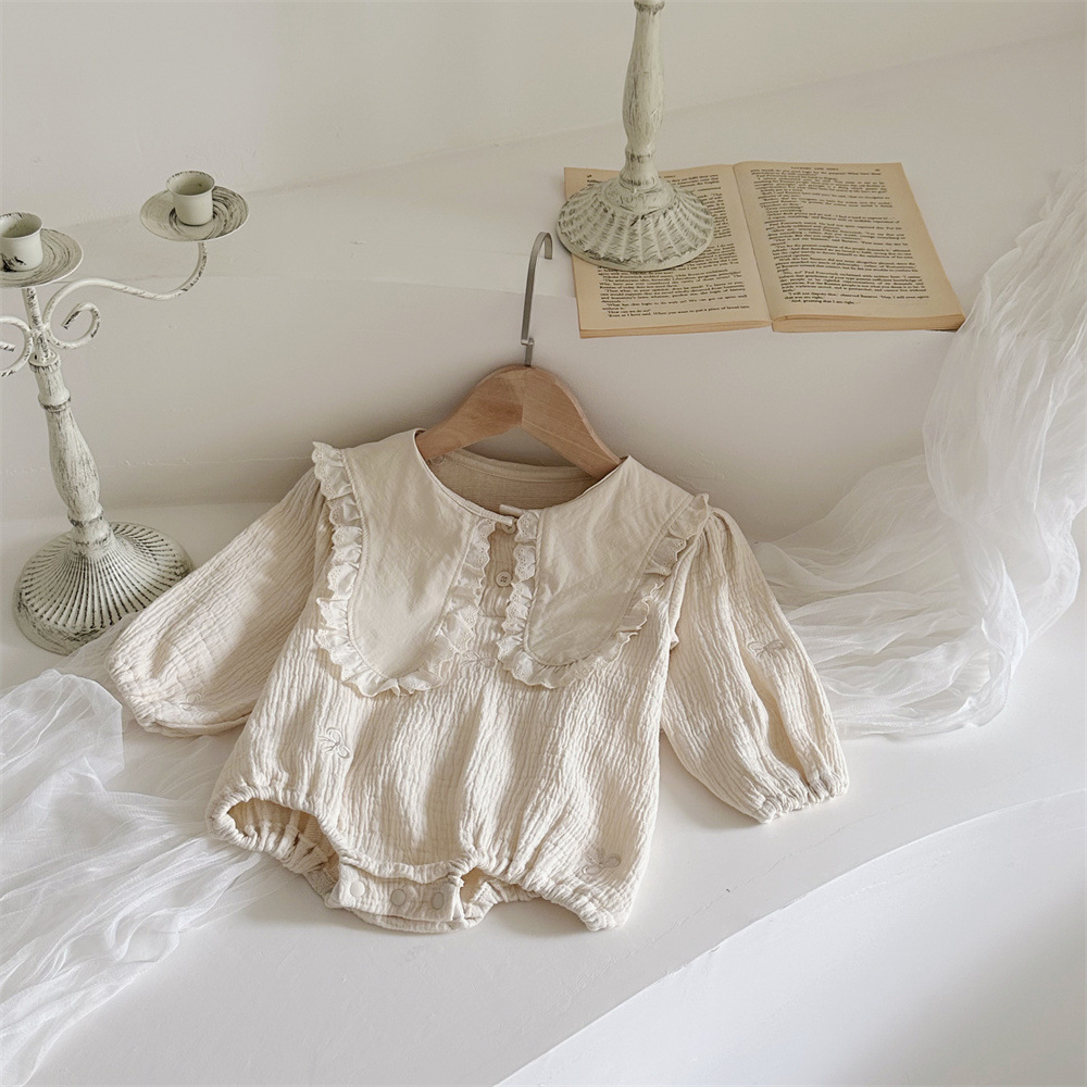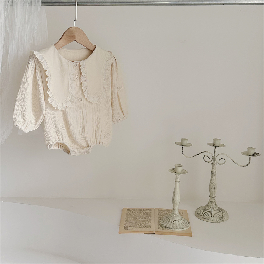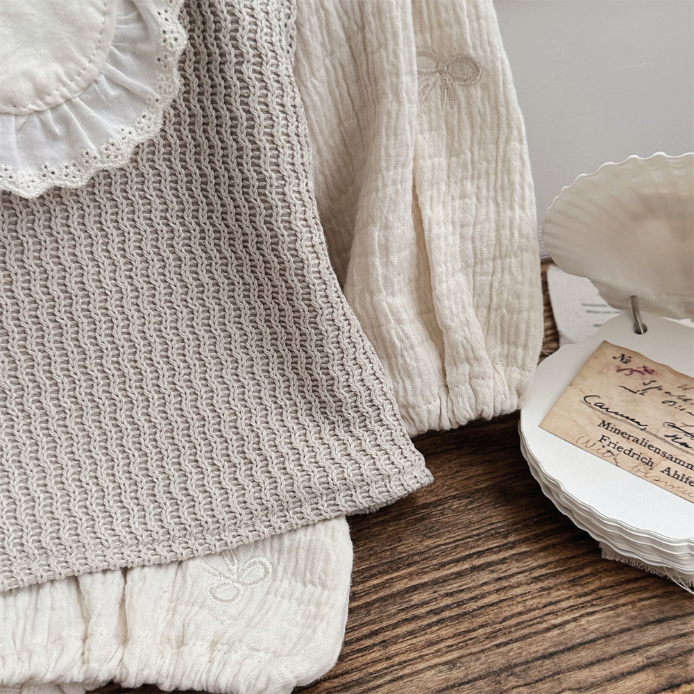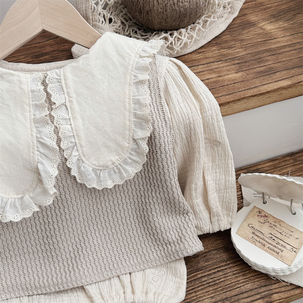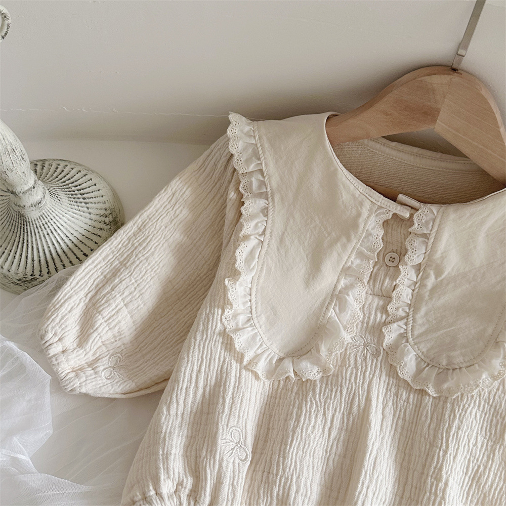 • 살구 레이스 라지 스퀘어 칼라 자수 리본 긴팔 카키