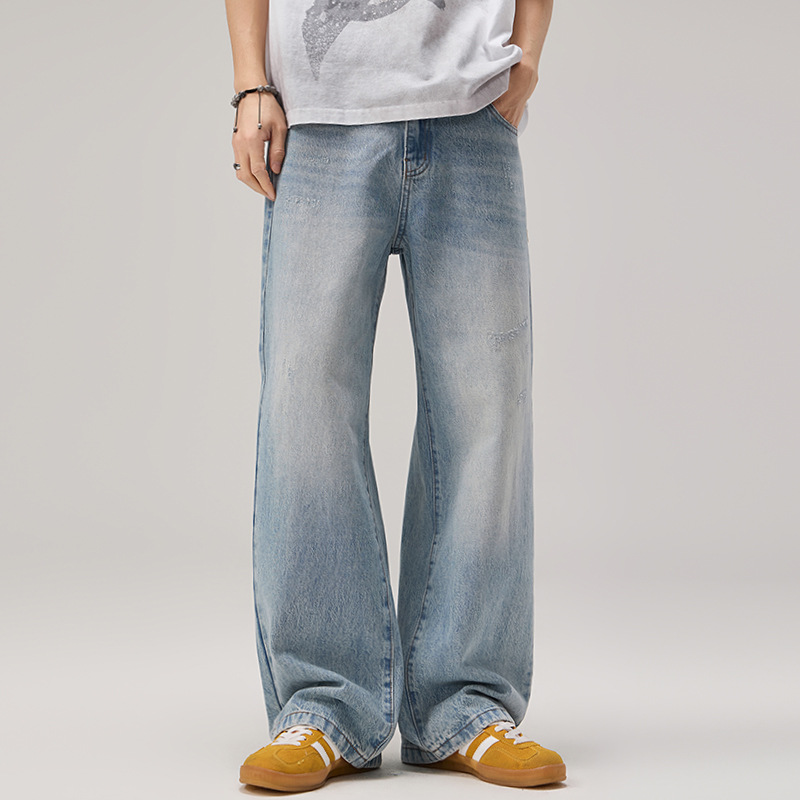 Muqiu 남성복 ∠ 2025 봄 새로운 미국 클린 핏 스트레이트 청바지 남성 통근 레트로 와이드 레그 팬츠