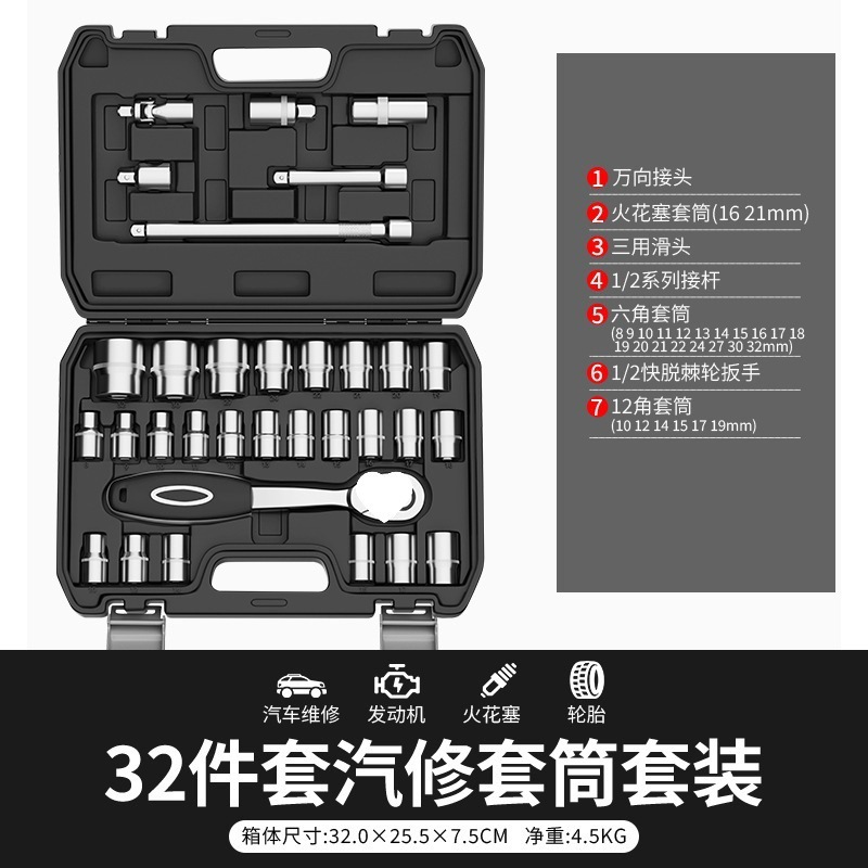 • [72톱니 대형 플라이 곡선 핸들 래칫] 대형 플라이 소켓 32개 세트
