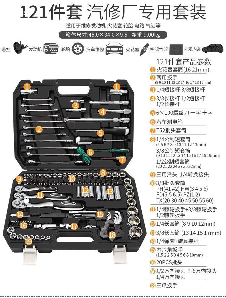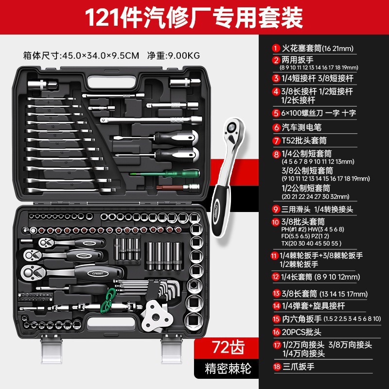 • [72톱니 대형 플라이 미디엄 플라이 소형 플라이 곡선 핸들 래칫] 121피스 소켓 렌치 세트