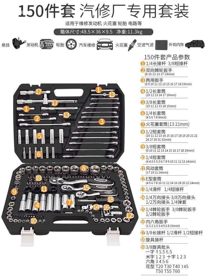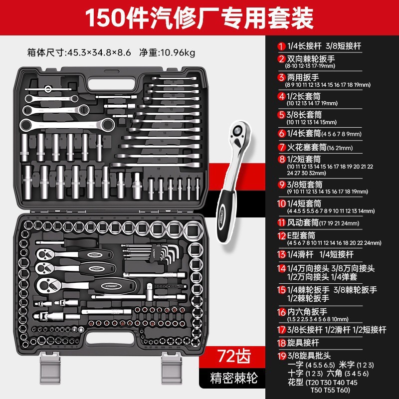 • [72톱니 대형 플라이 미디엄 플라이 소형 플라이 곡선 핸들 래칫] 150피스 소켓 렌치 세트