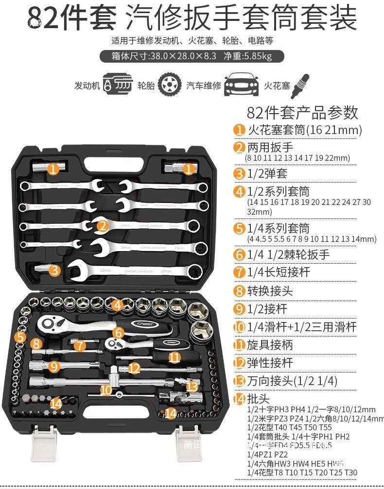 • [72톱니 대형 플라이 및 소형 플라이 곡선 핸들 래칫] 82피스 소켓 렌치 세트