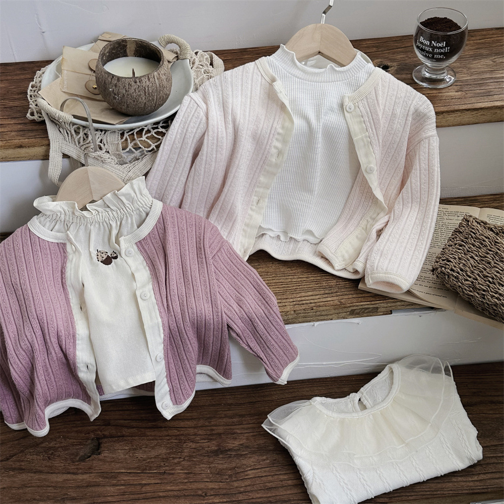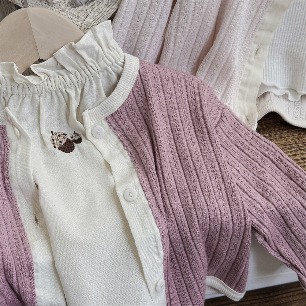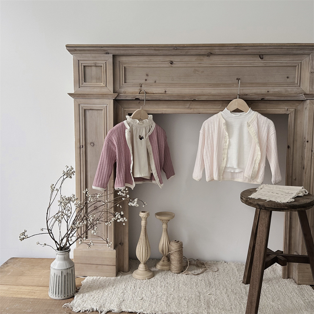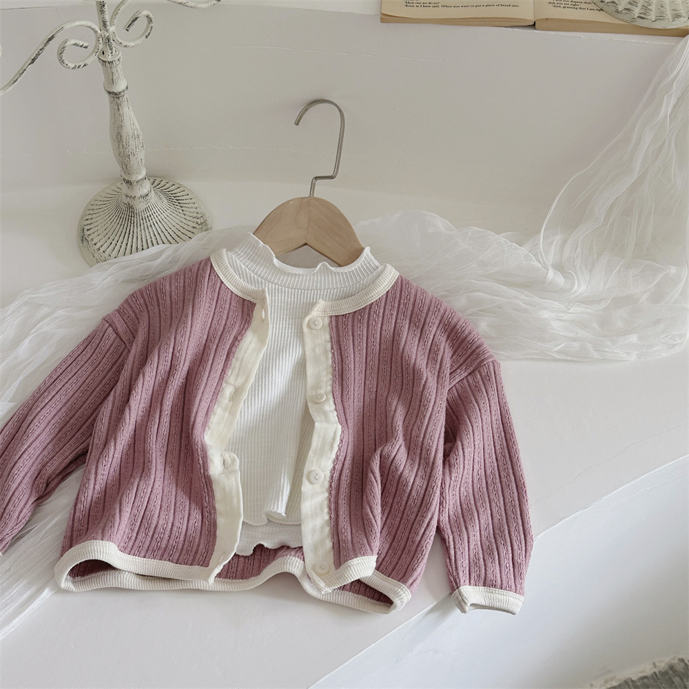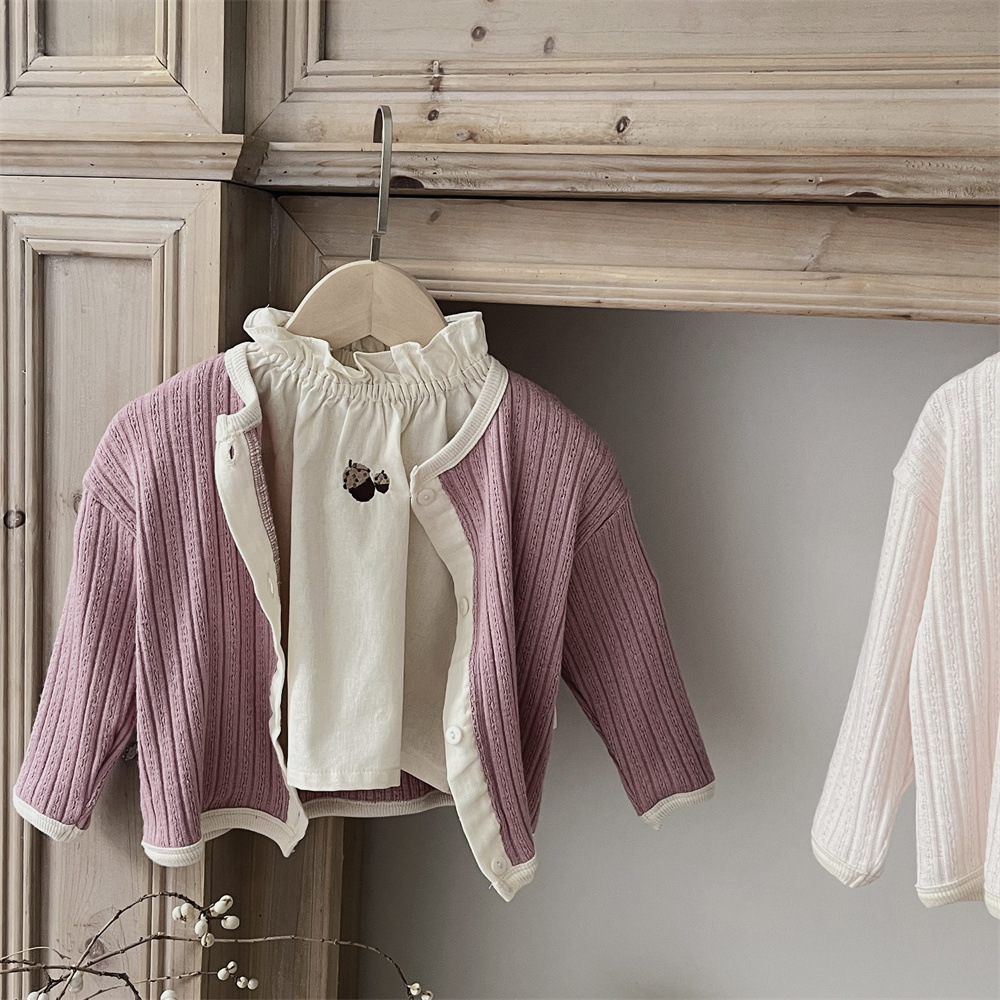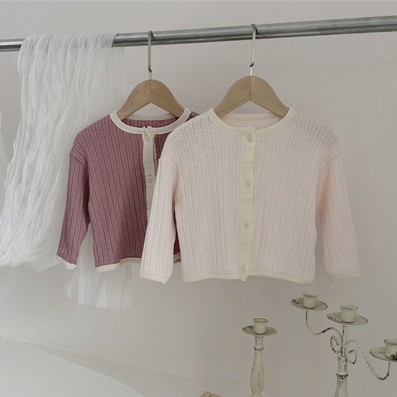 • 라이트 핑크 중공 피트 스트립 컬러 매칭 스트립 싱글 브레스트 긴팔 가디건