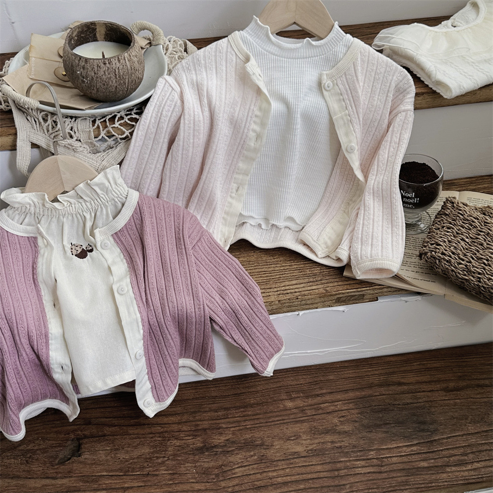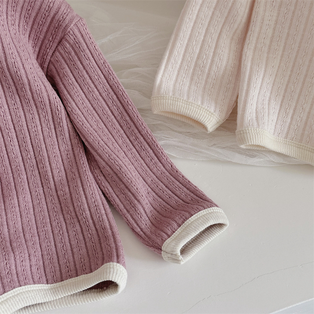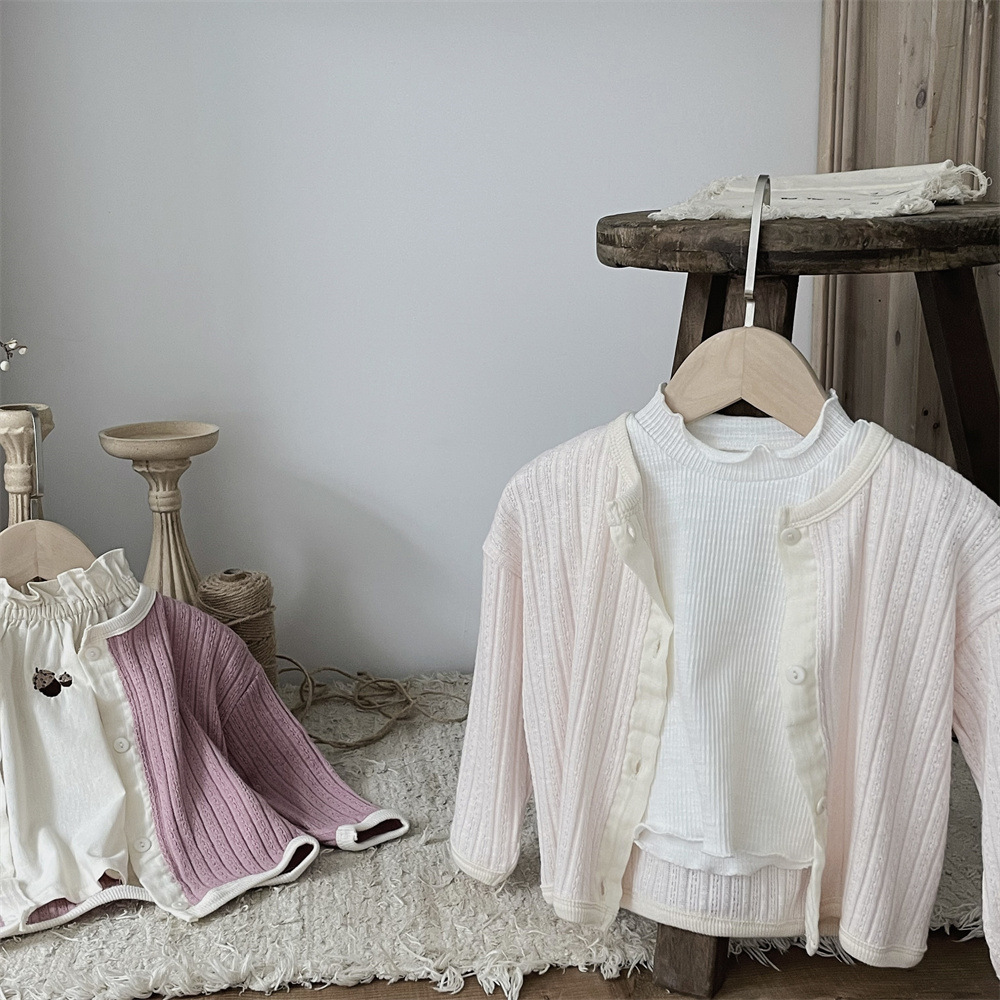 INS 유아 가을과 겨울 중공 구덩이 스트립 긴팔 카디건 여성용 보물 색상 일치 스트립 싱글 브레스트 재킷