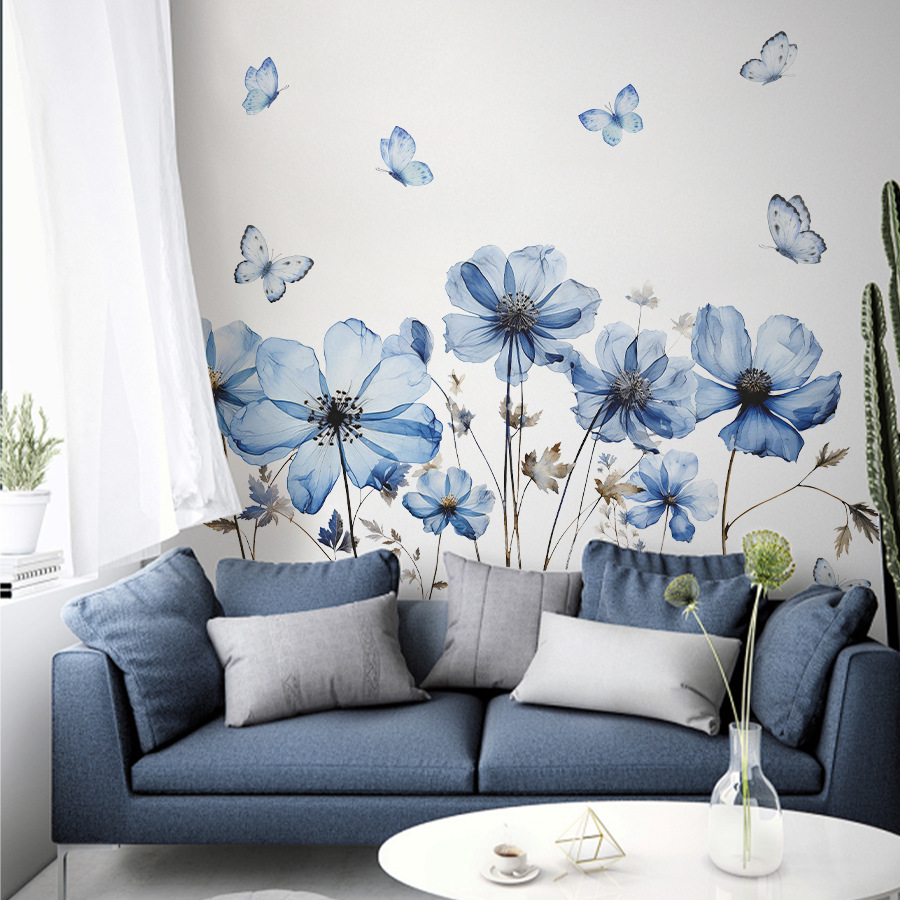 BR3453E 신선한 푸른 나비 꽃 꽃 자착 벽 스티커 침실 거실 침실 입구 배경 장식 스티커