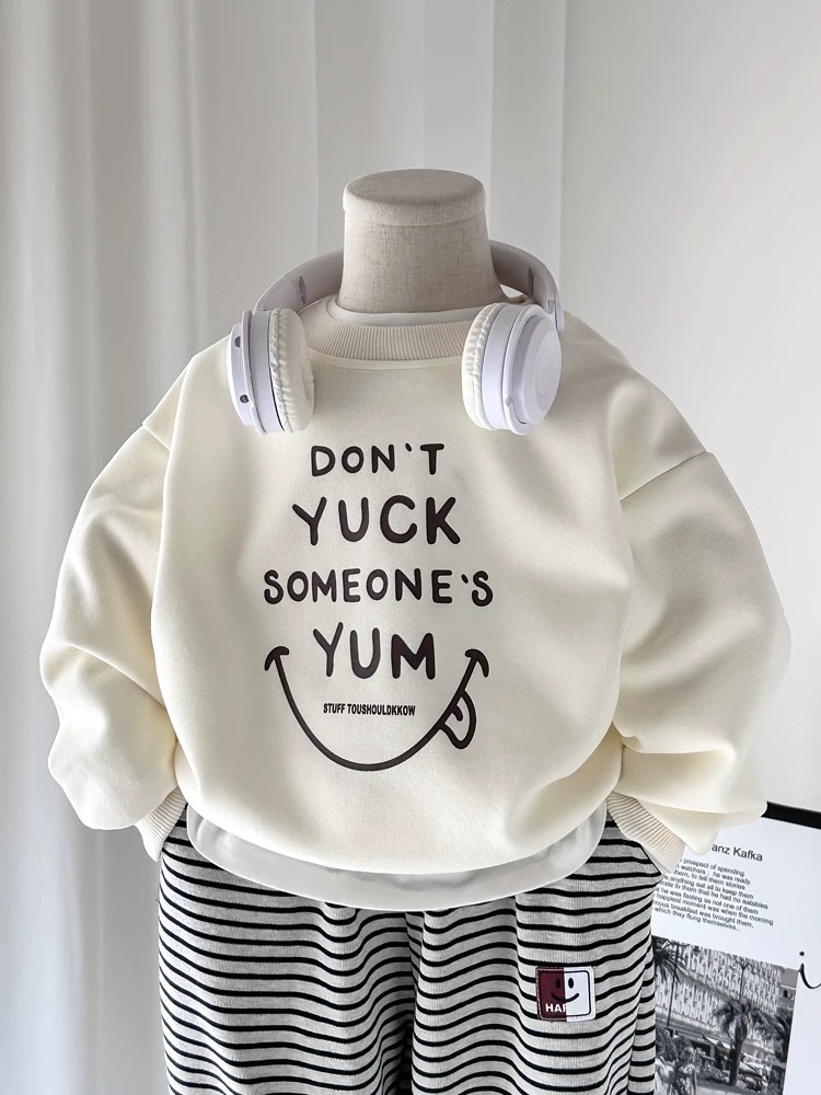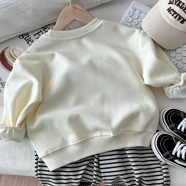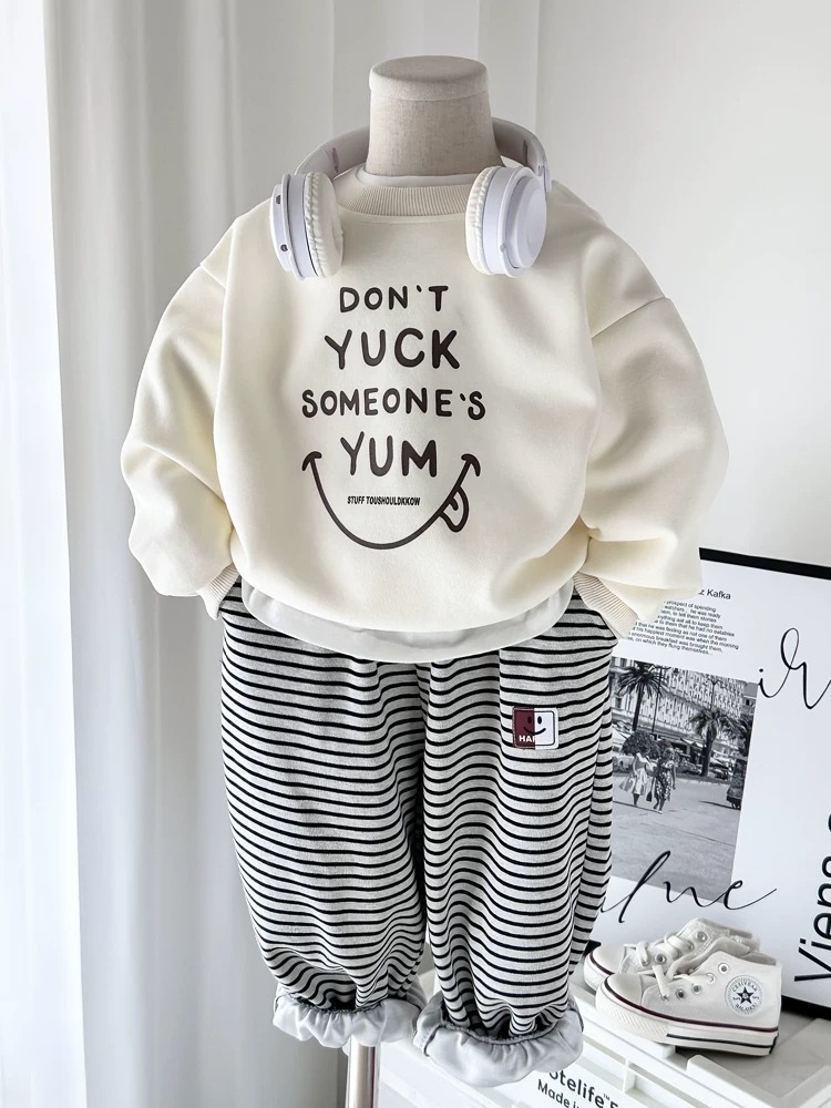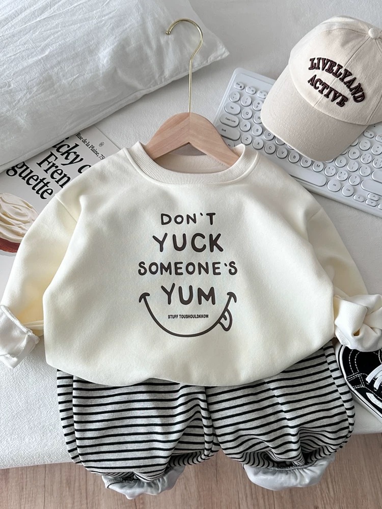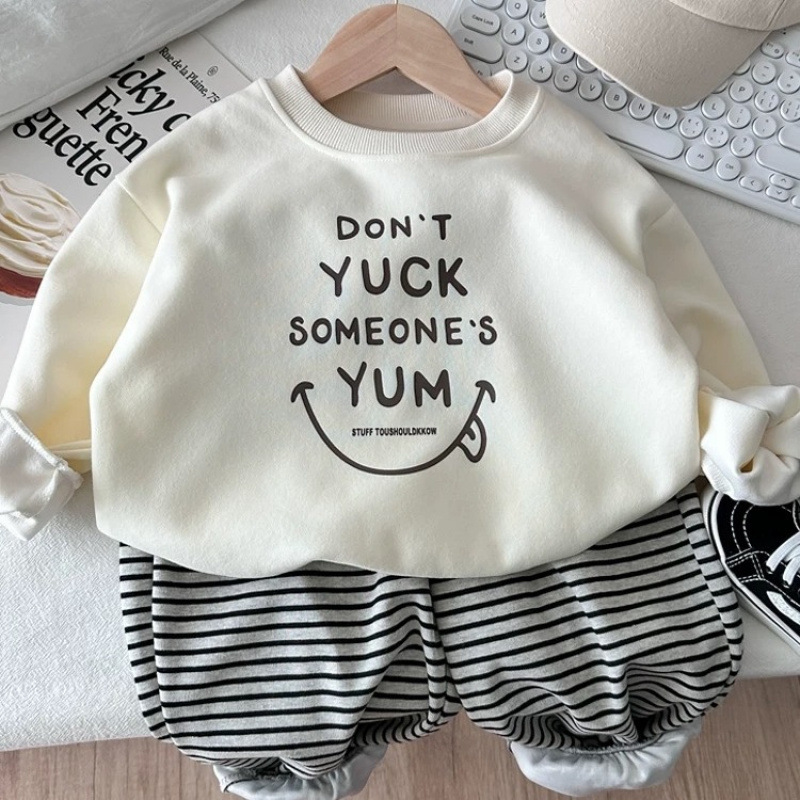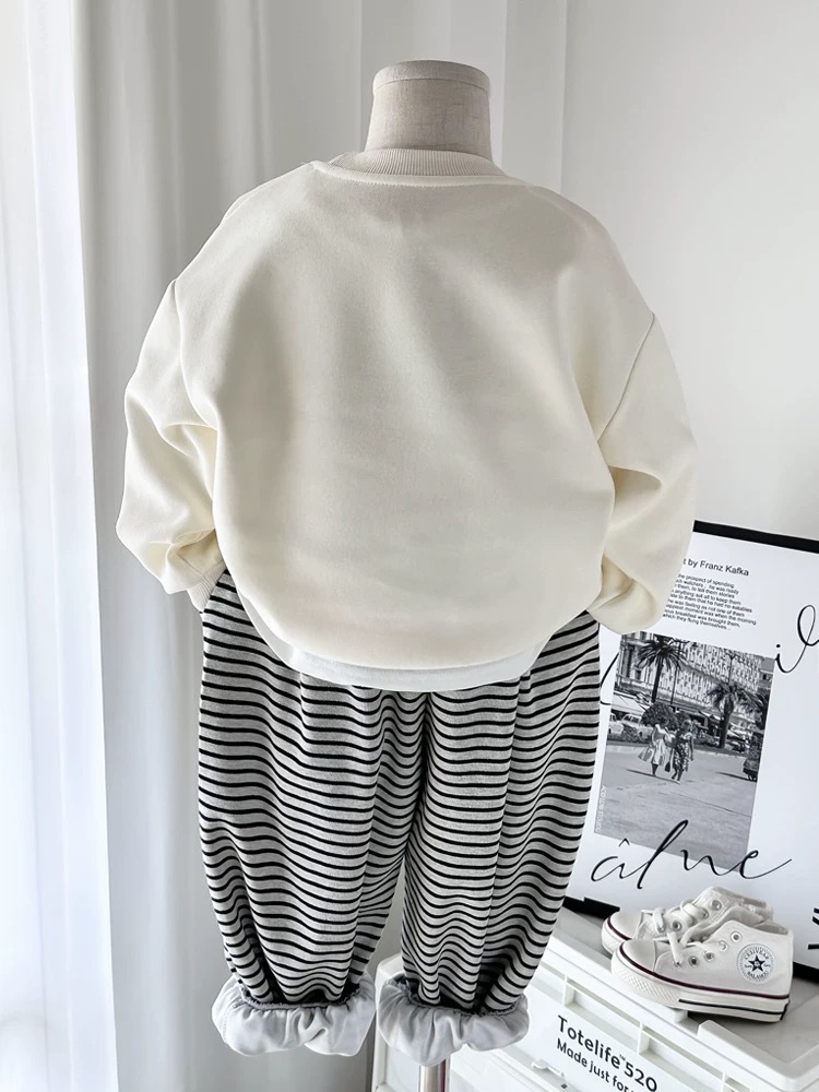 봄과 가을을위한 소년과 소녀를위한 순수 코튼 신식 스웨트 셔츠 세트 어린이를위한 트렌디 탑 아기 줄무늬 스웨트 바지 2 피스 세트