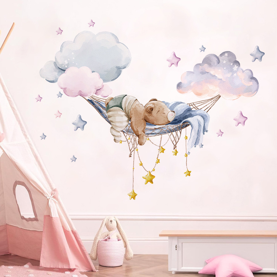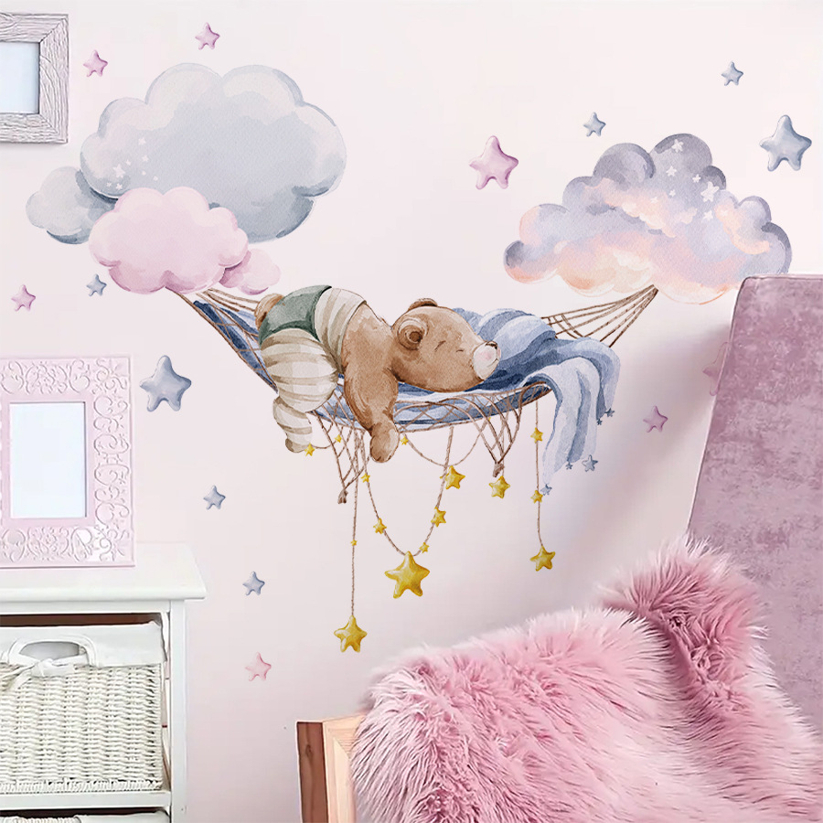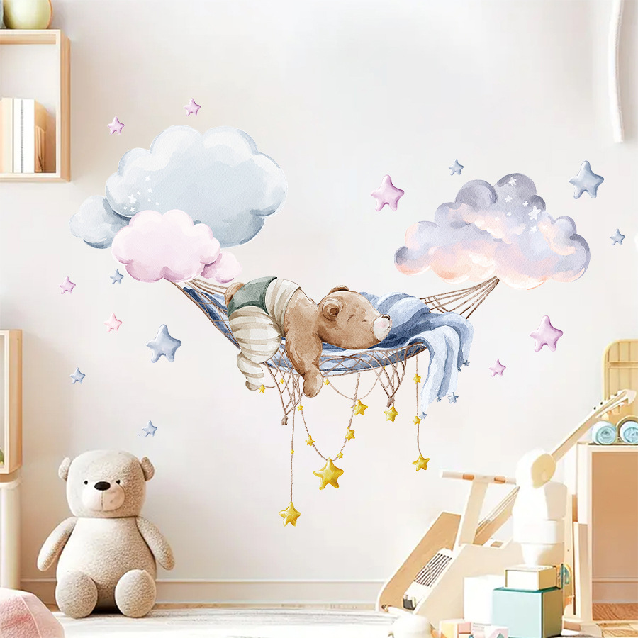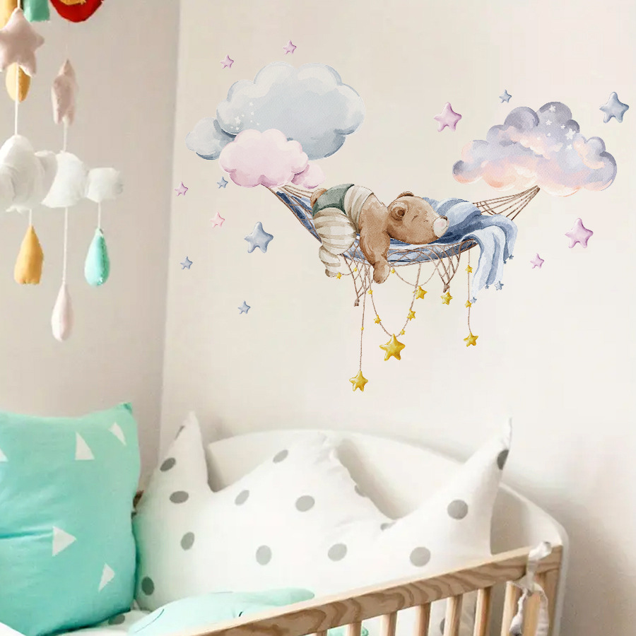 BR1206Q 클라우드 룸 슬리핑 베어 귀여운 만화 자기 접착 벽 스티커 침실 유치원 어린이 방 장식 스티커