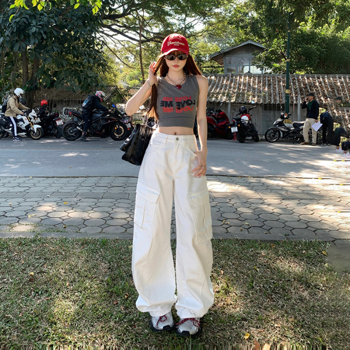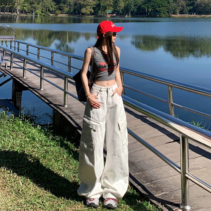 YC & American Retro High Street Loose Wide Leg Pocket Overalls 올 매치 봄 및 여름 스트레이트 청바지 여성용 뉴