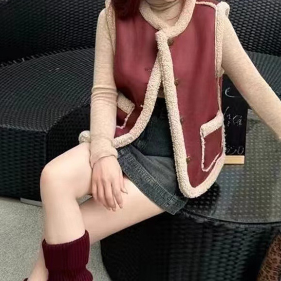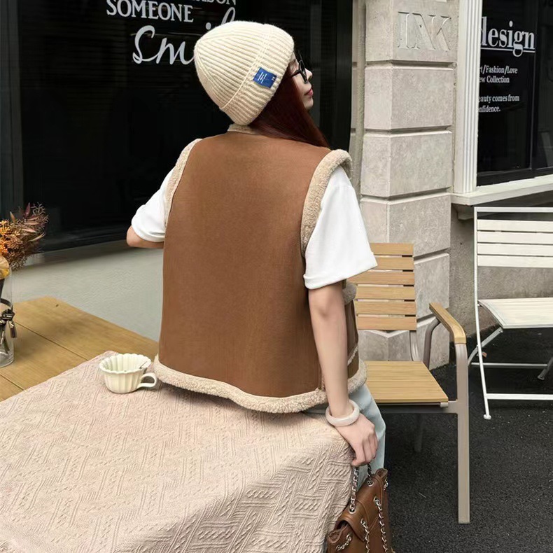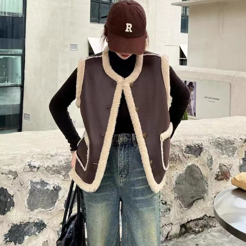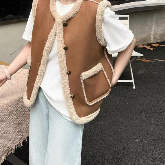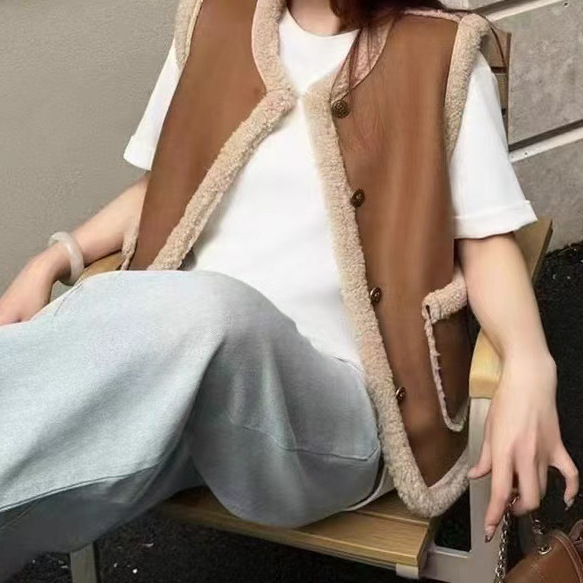 2024 가을과 겨울 새로운 양고기 스웨이드 모피 원피스 조끼 여성 조끼 가죽 지갑 올 매치 외관스토어 가기