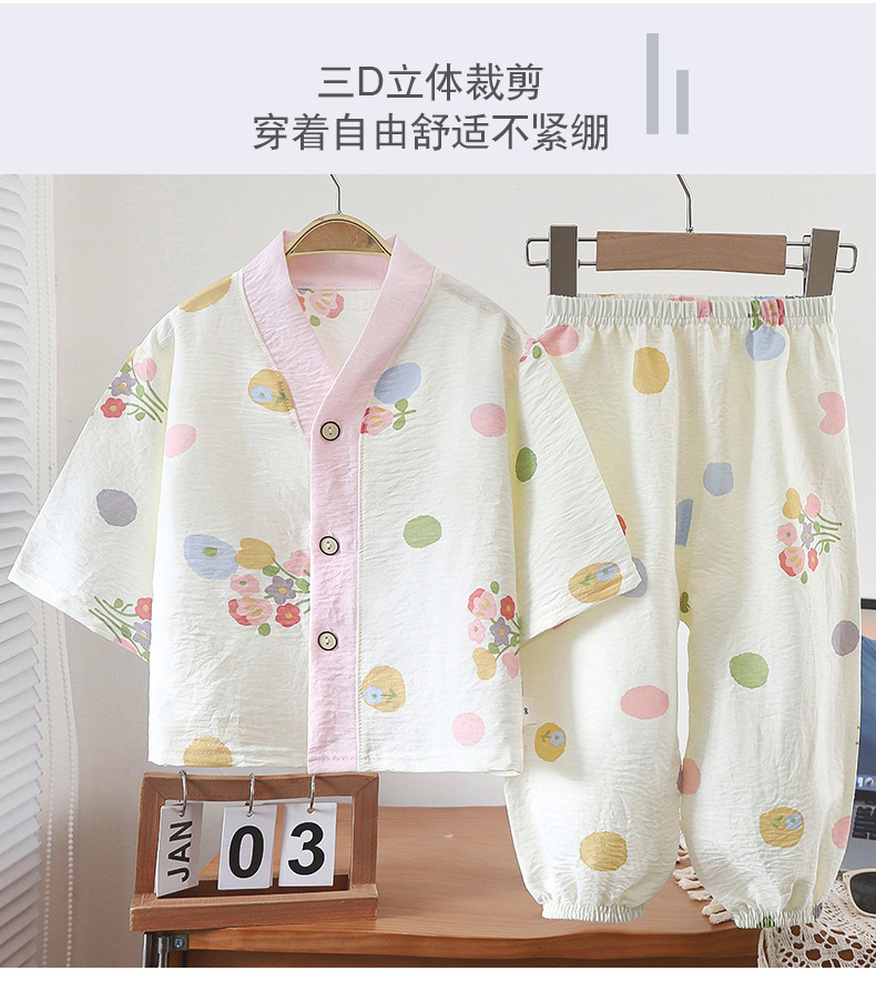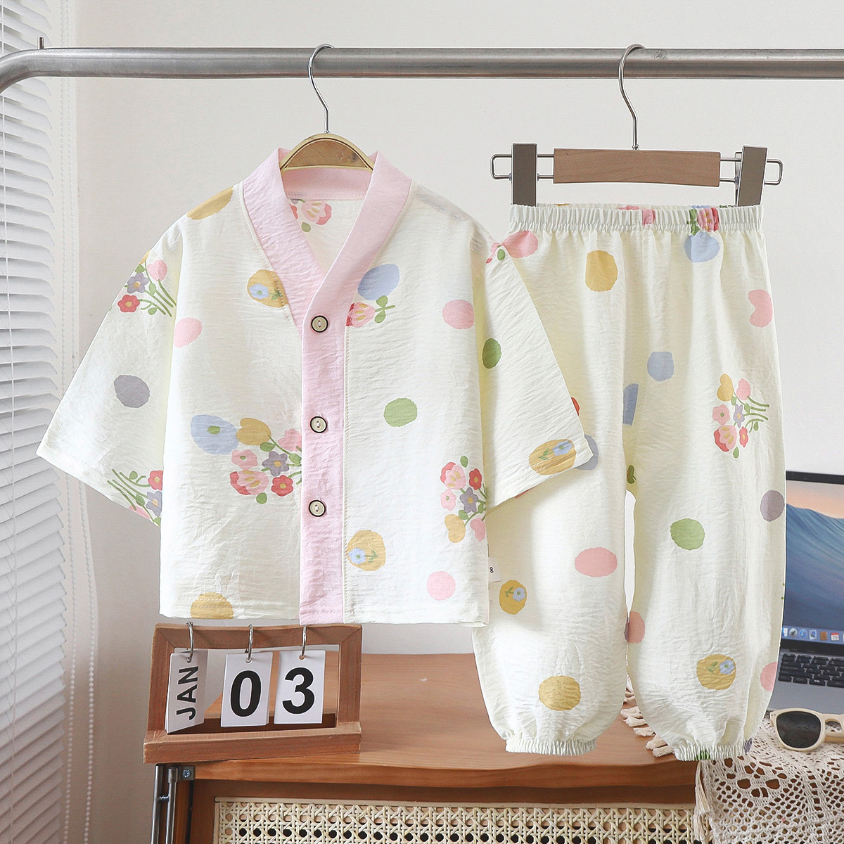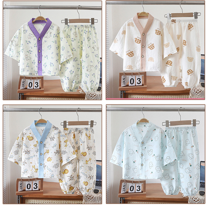 봄과 여름 새로운 구름 면화 어린이 잠옷 투피스 세트 소년 얇은 카디건 걸스 에어컨 홈 의류 세트