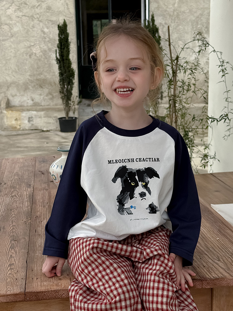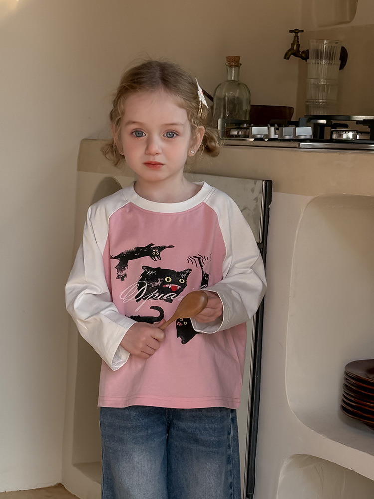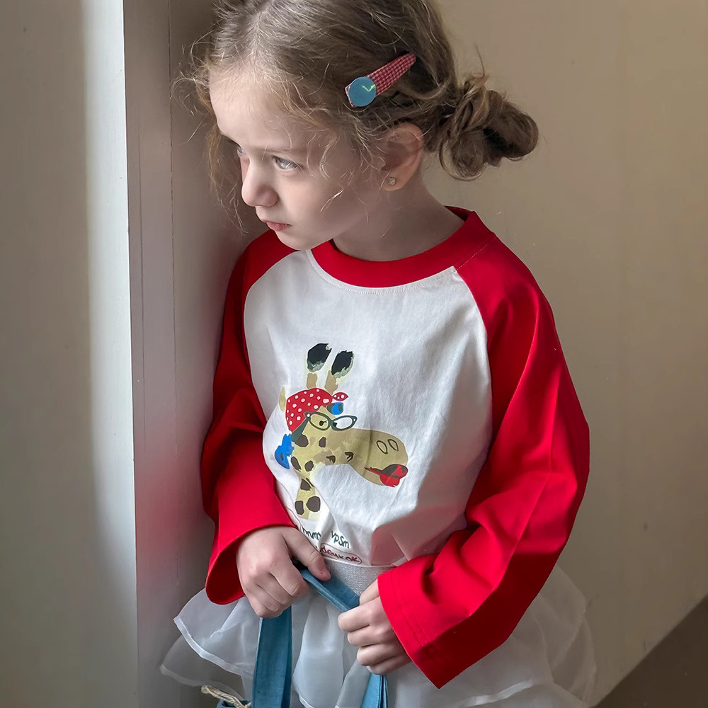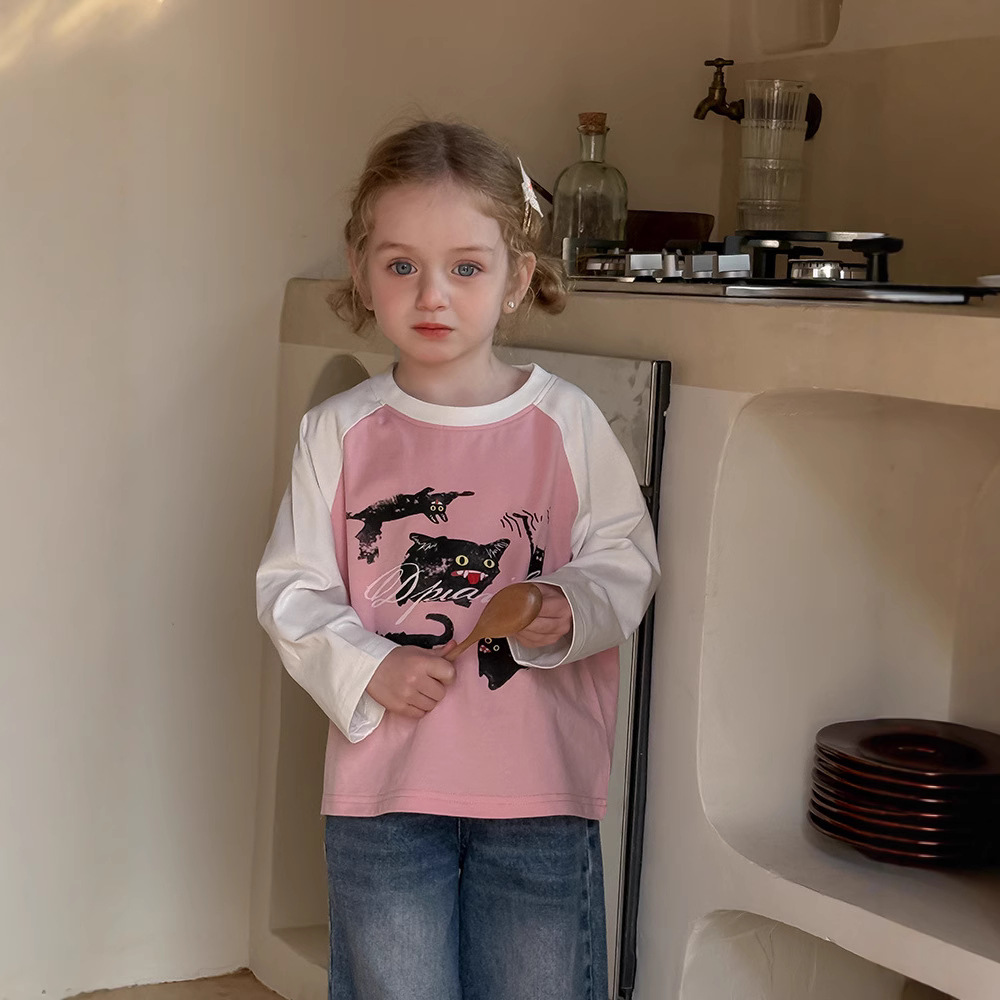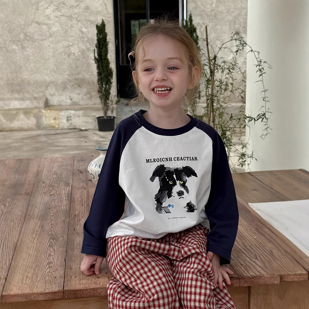 어린이 래글런 슬리브 만화 티셔츠 2025 봄 가을 신상 한국 스타일 남녀 공용 만화 배색 긴팔 라운드넥 티셔츠