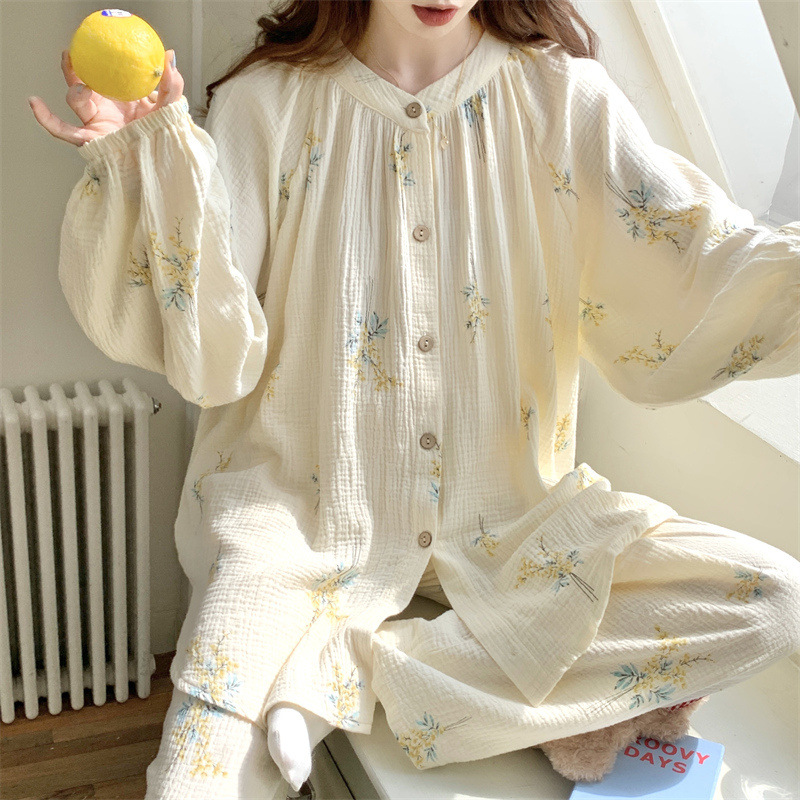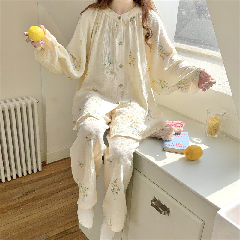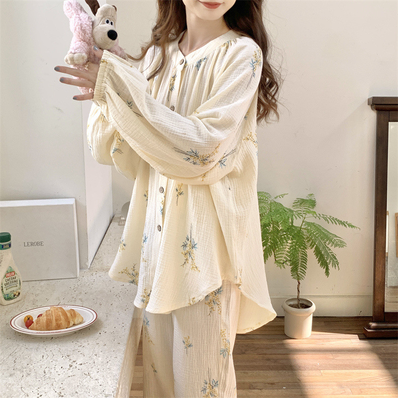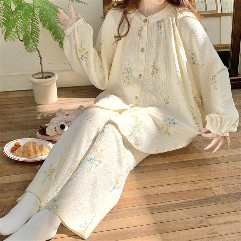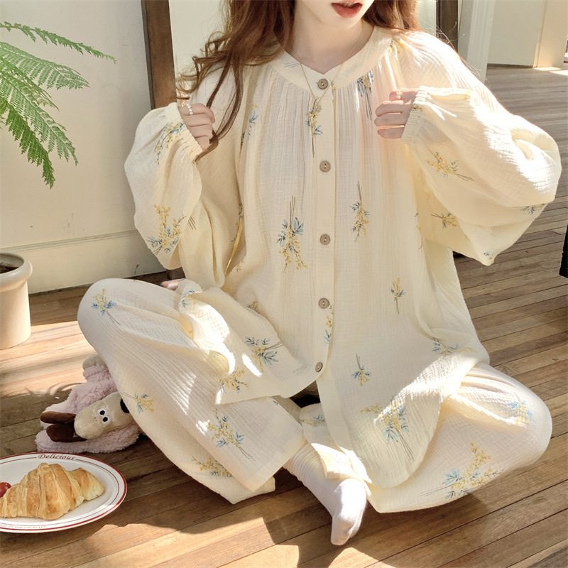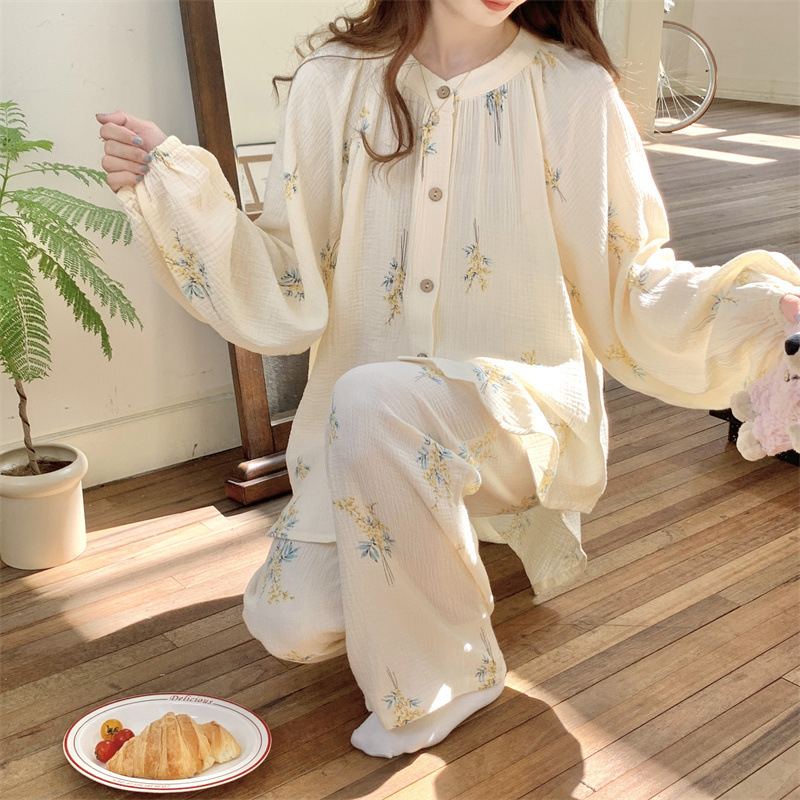 봄과 가을 목가적 인 스타일 둥근 목 카디건 긴 소매 세트 2025 새로운 간단한 신선한 바지 파자마 여성 홈 옷스토어 가기