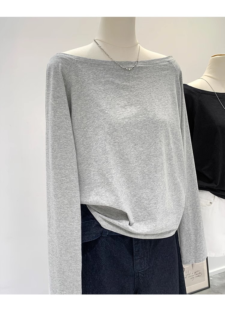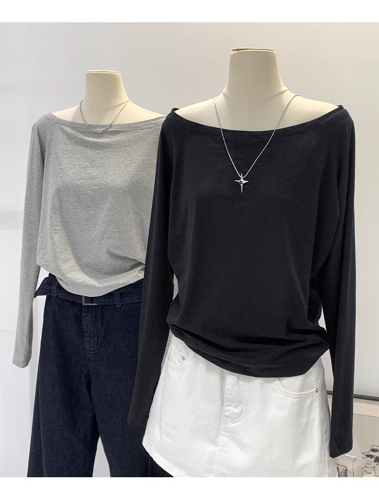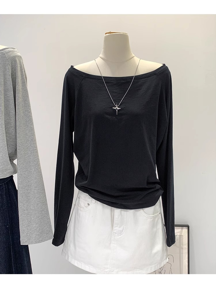 순수한 욕망 Slant Shoulder Collar 긴팔 티셔츠 여성의 봄과 가을 새로운 느슨한 슬리밍 게으른 스파이스 걸베이스 틈새 탑