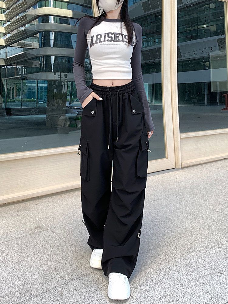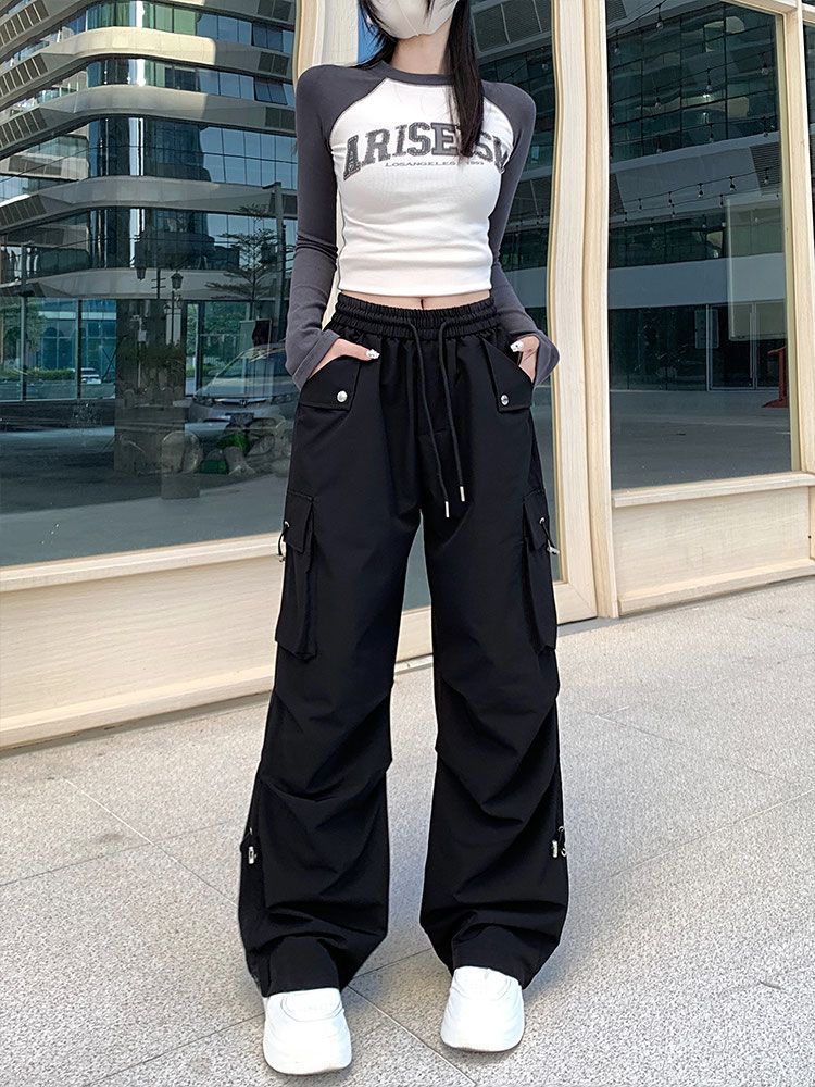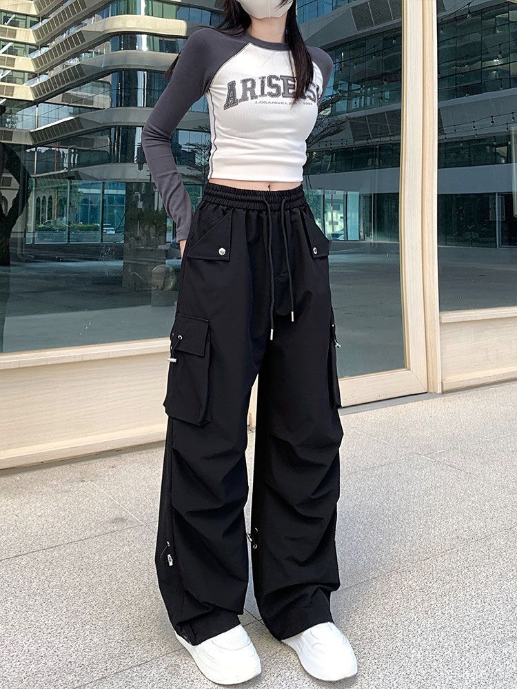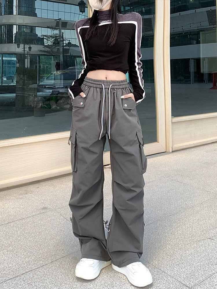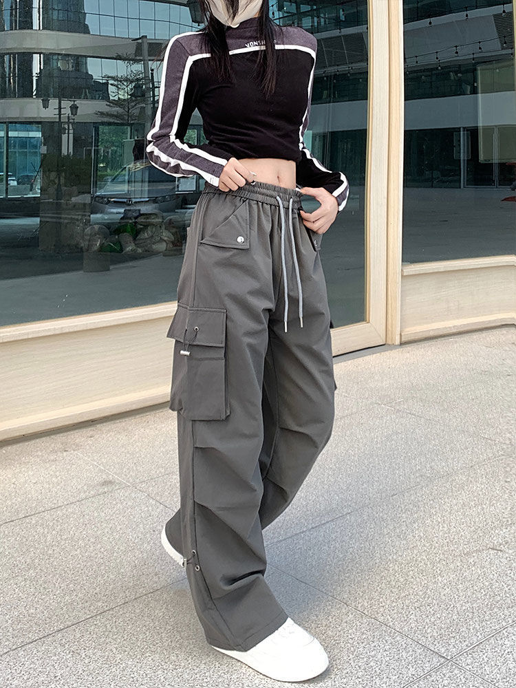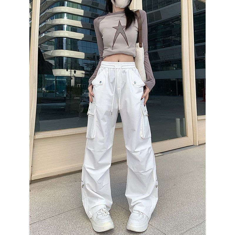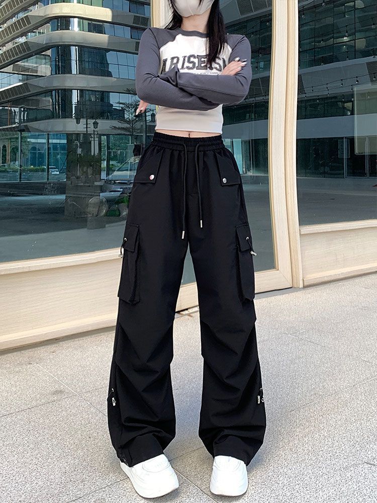 Daifa 아메리칸 스타일 대형 포켓 스트레이트 오버롤 여성용 봄과 가을 한국 스타일 느슨한 높은 허리 슬리밍 넓은 다리 캐주얼 바지