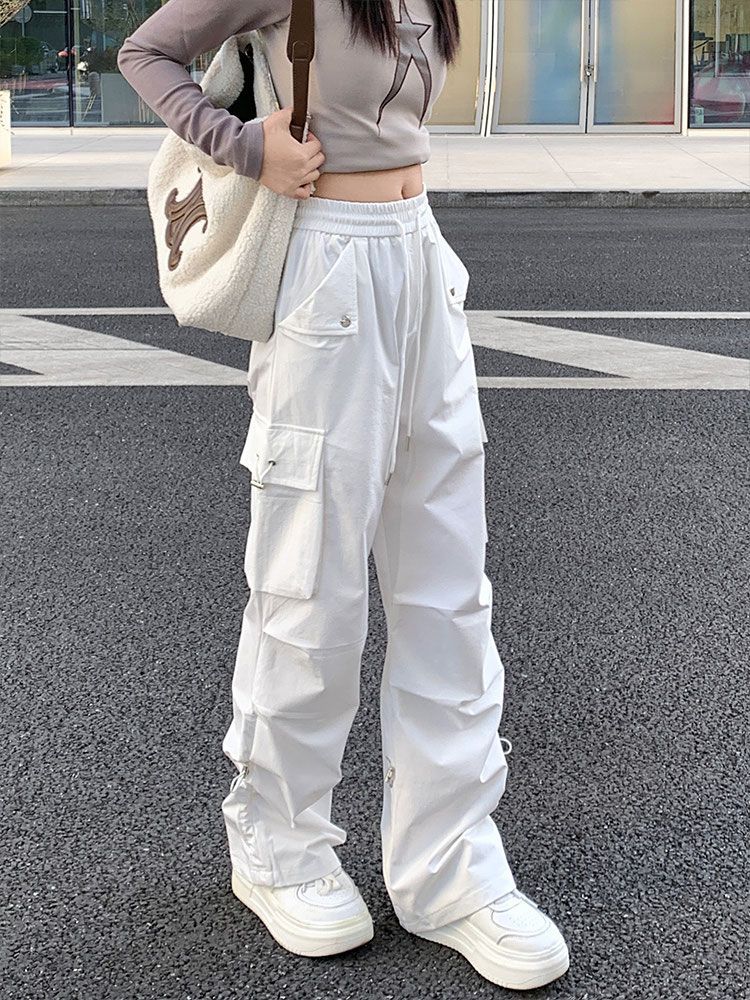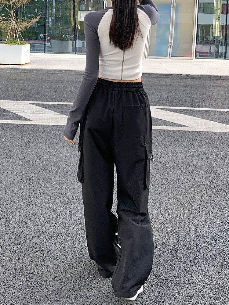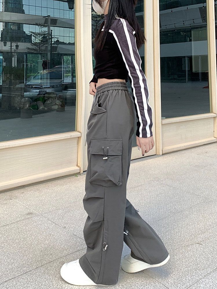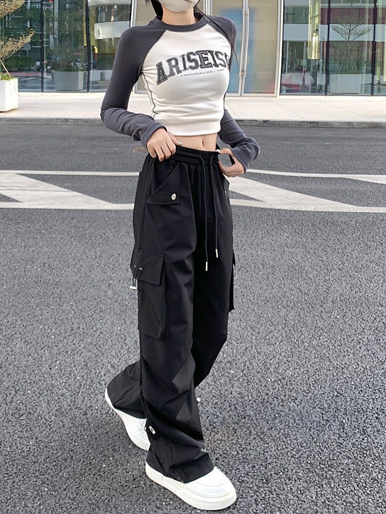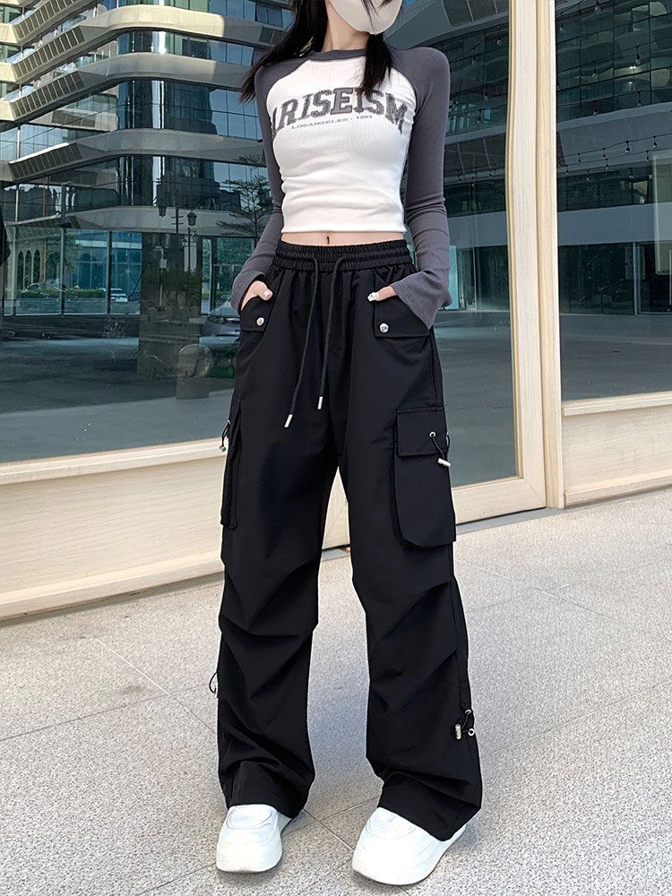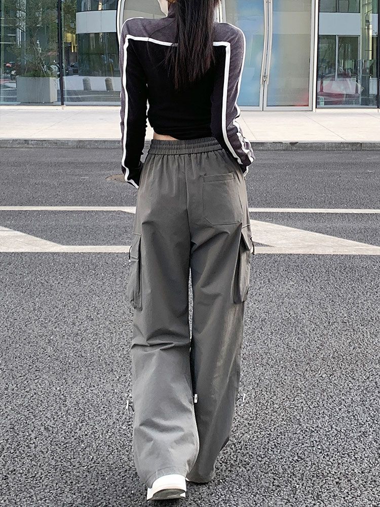 Daifa 아메리칸 스타일 대형 포켓 스트레이트 오버롤 여성용 봄과 가을 한국 스타일 느슨한 높은 허리 슬리밍 넓은 다리 캐주얼 바지