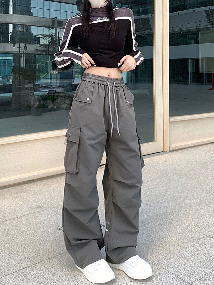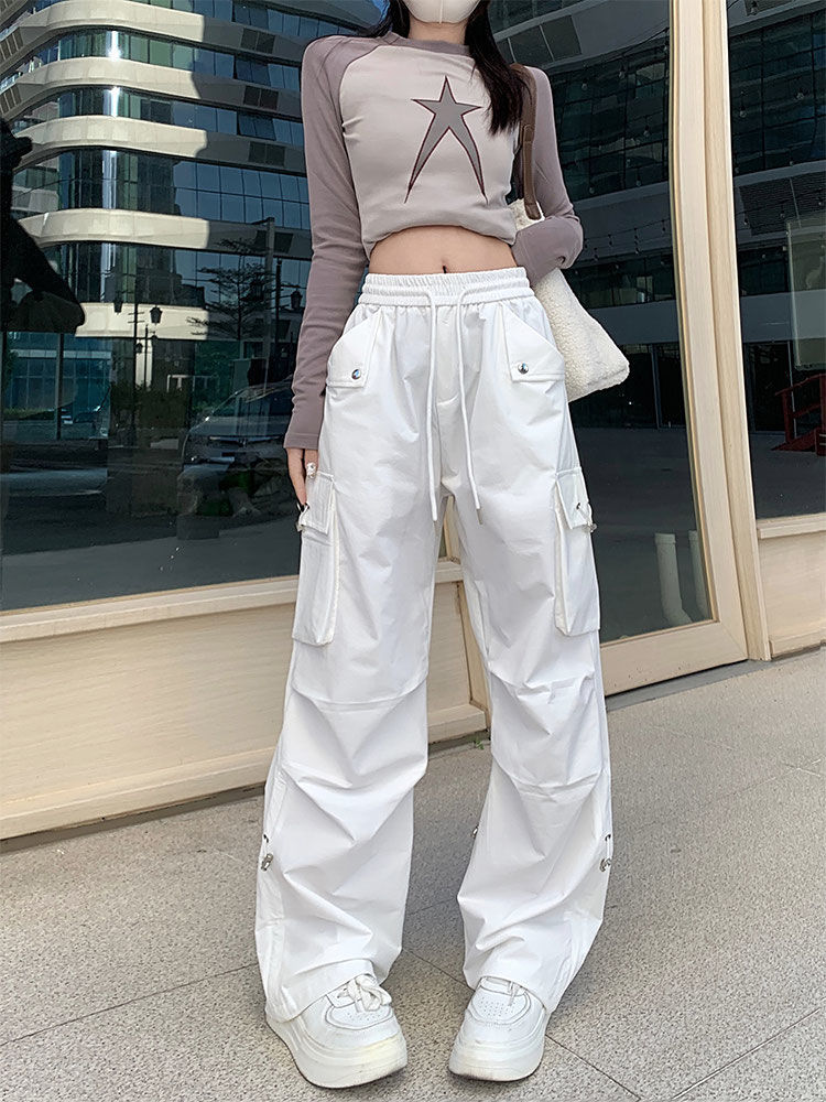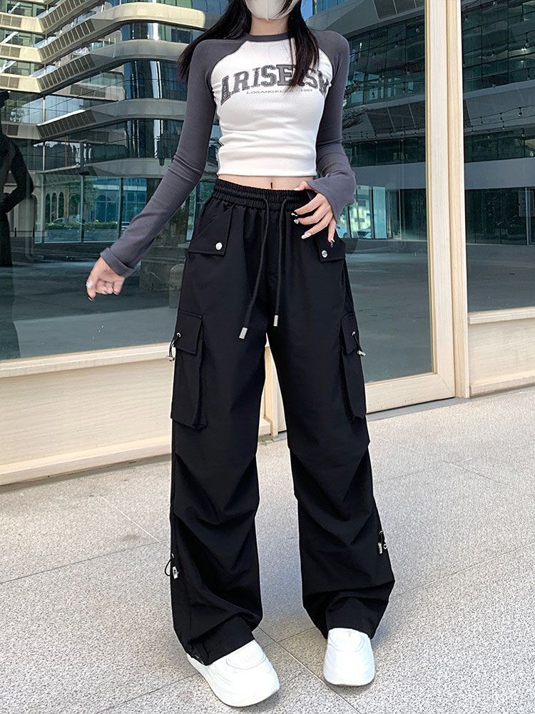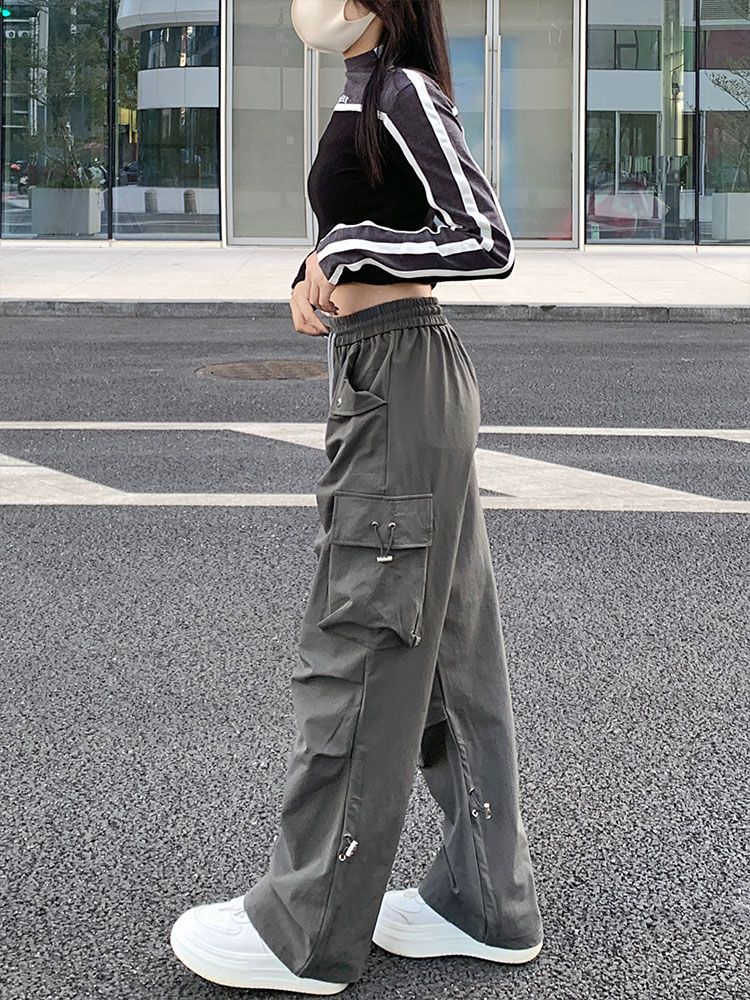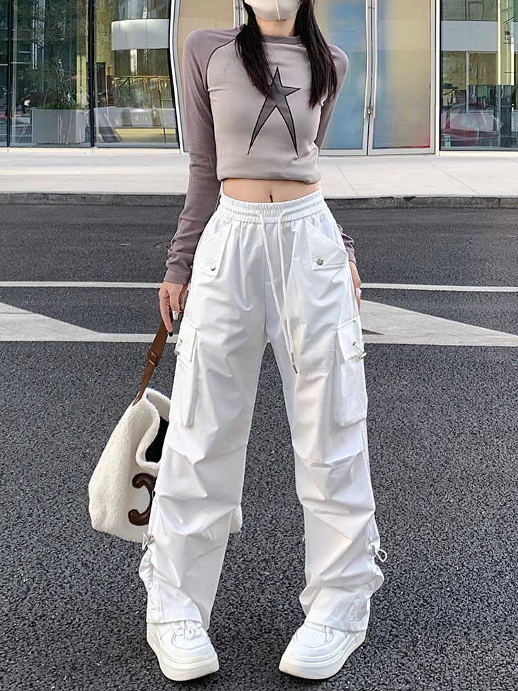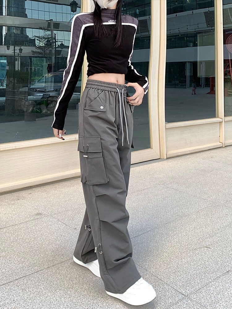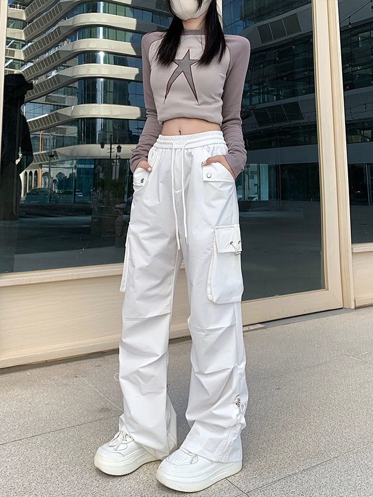 Daifa 아메리칸 스타일 대형 포켓 스트레이트 오버롤 여성용 봄과 가을 한국 스타일 느슨한 높은 허리 슬리밍 넓은 다리 캐주얼 바지
