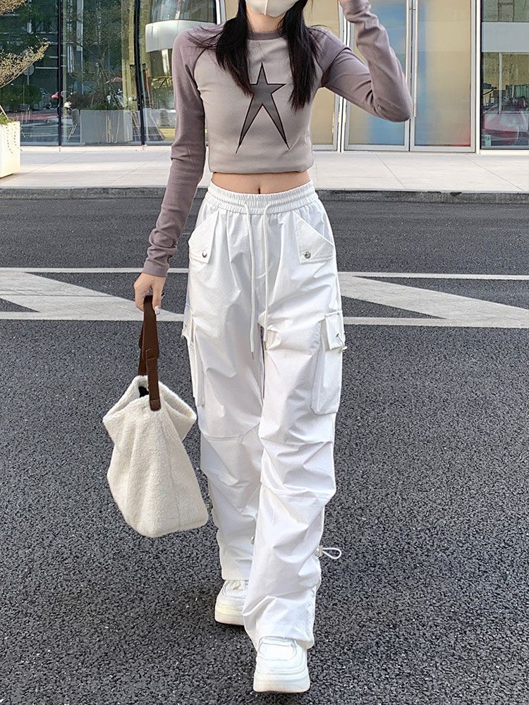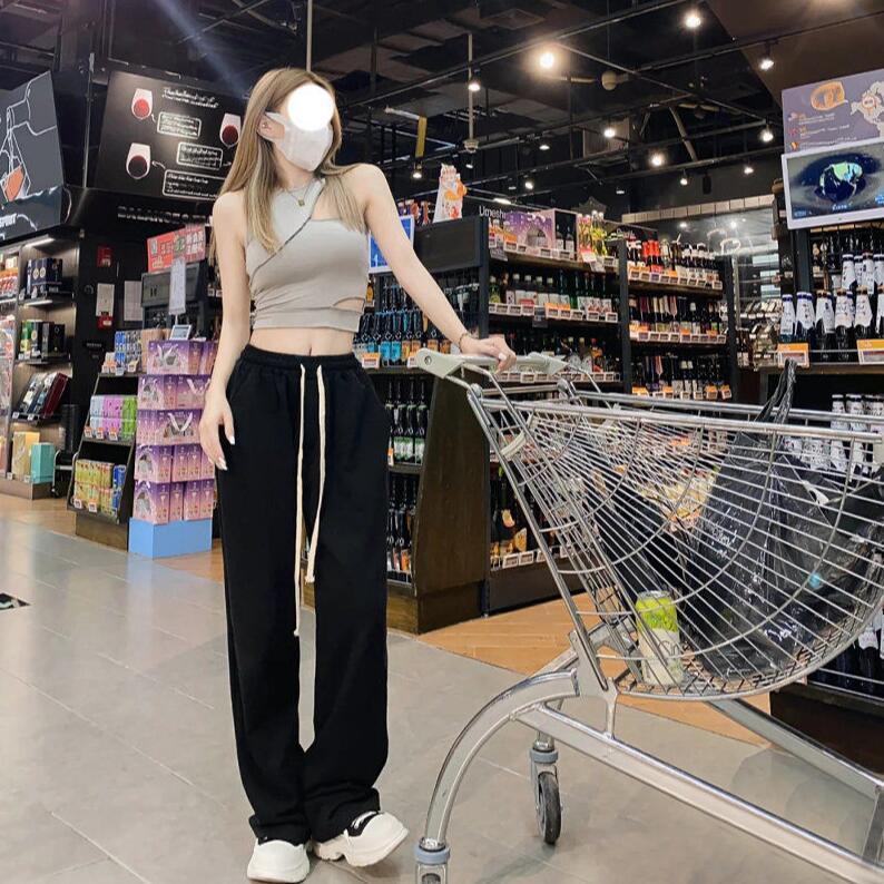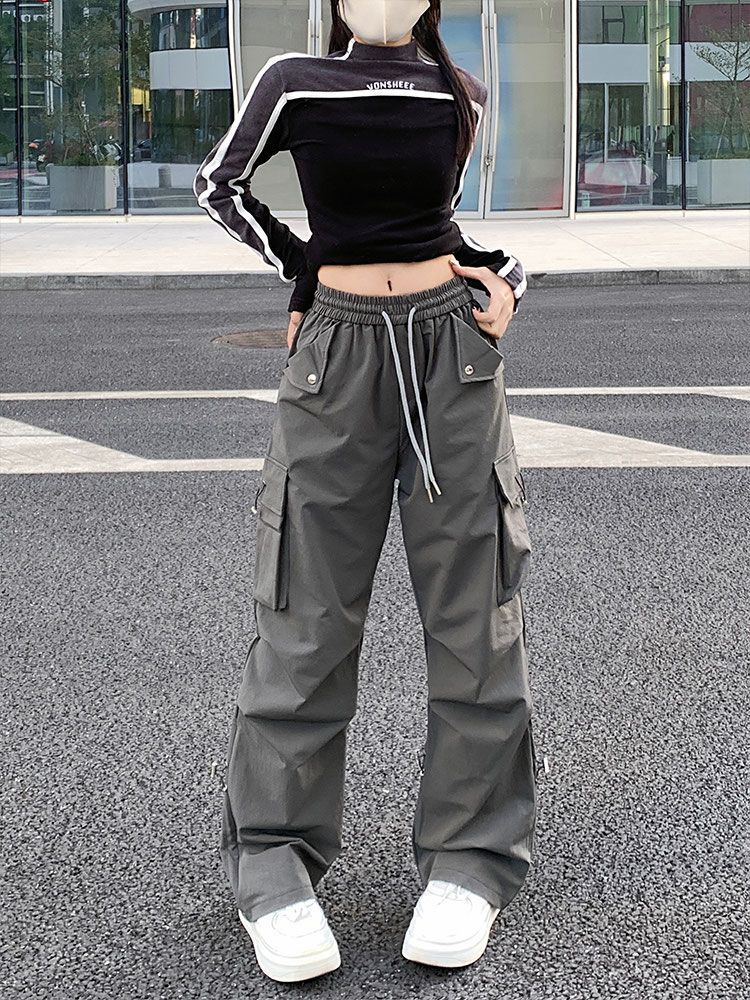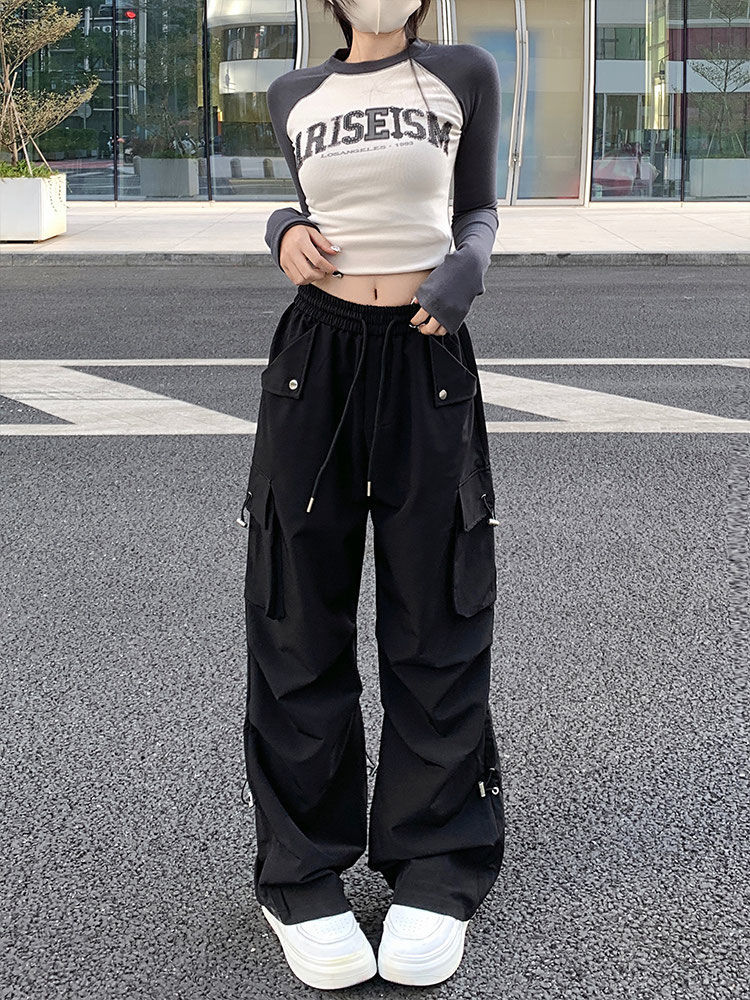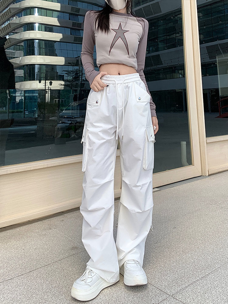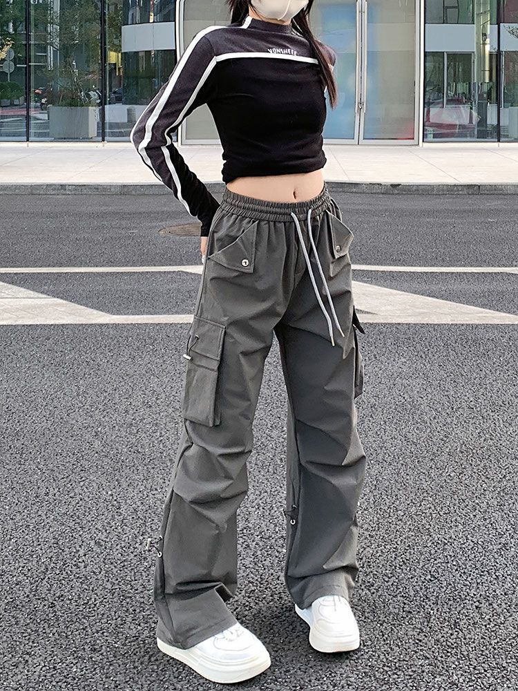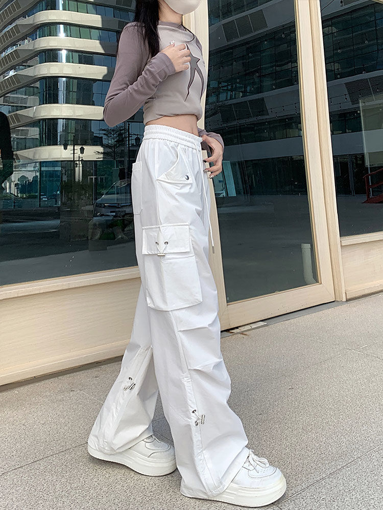 Daifa 아메리칸 스타일 대형 포켓 스트레이트 오버롤 여성용 봄과 가을 한국 스타일 느슨한 높은 허리 슬리밍 넓은 다리 캐주얼 바지