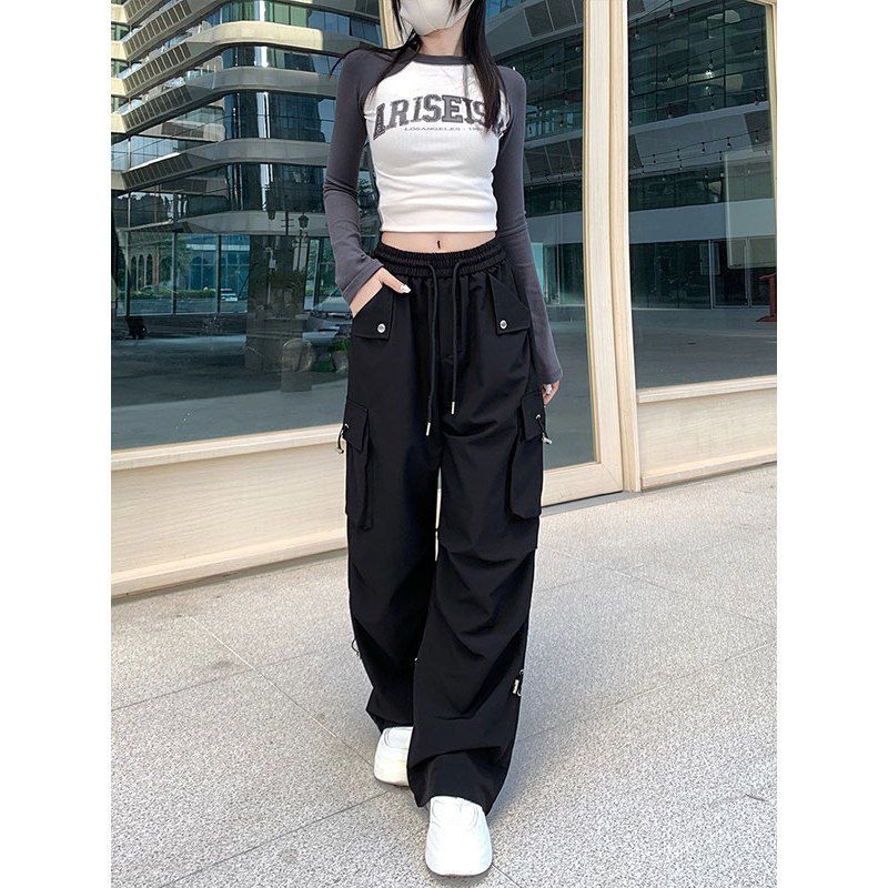 Daifa 아메리칸 스타일 대형 포켓 스트레이트 오버롤 여성용 봄과 가을 한국 스타일 느슨한 높은 허리 슬리밍 넓은 다리 캐주얼 바지스토어 가기