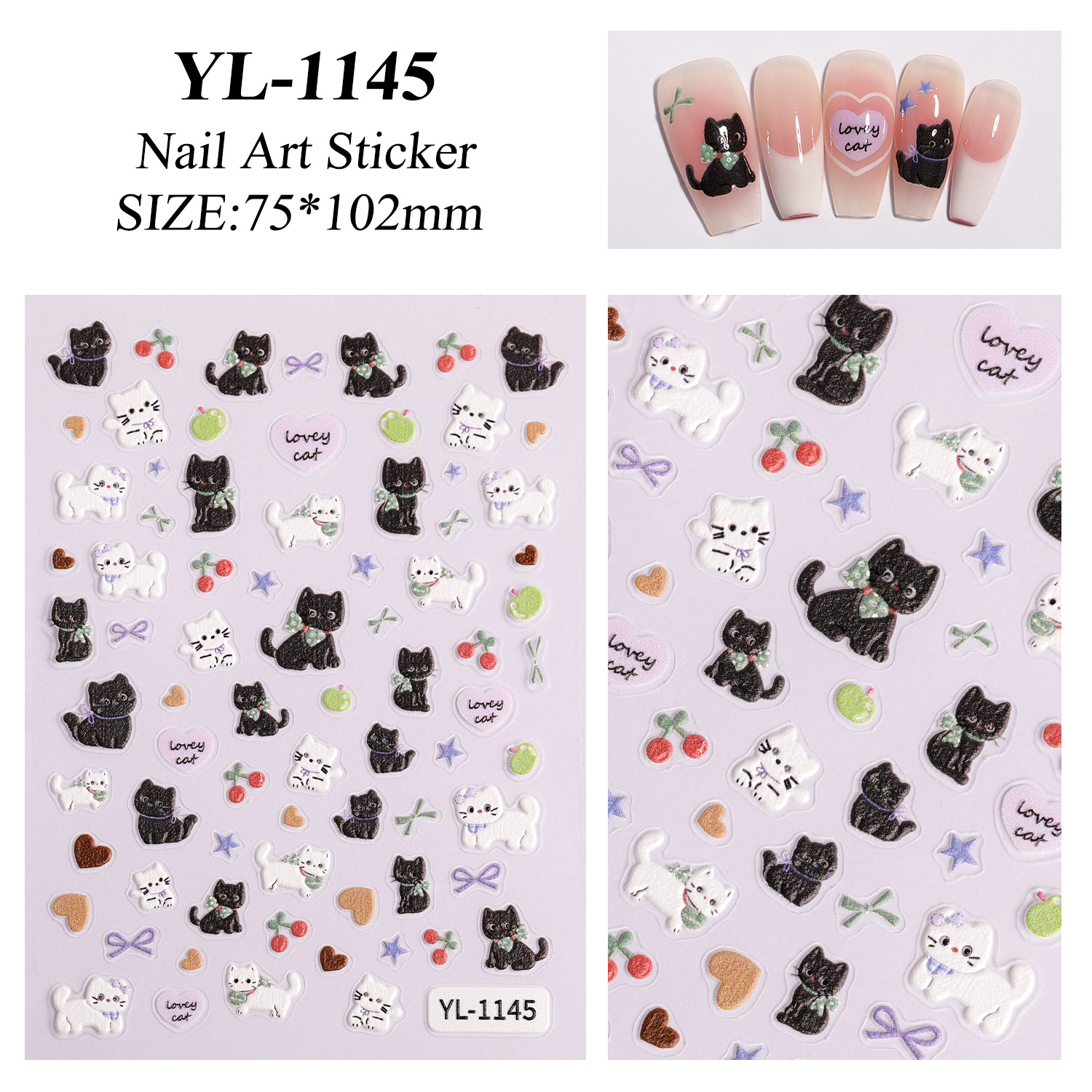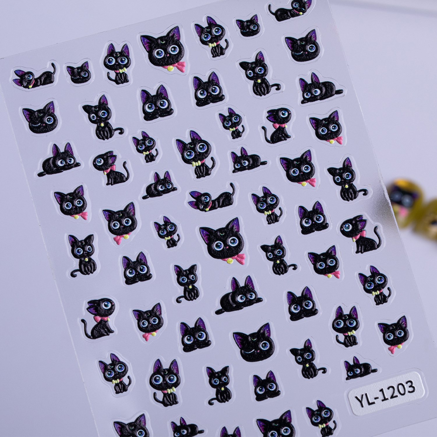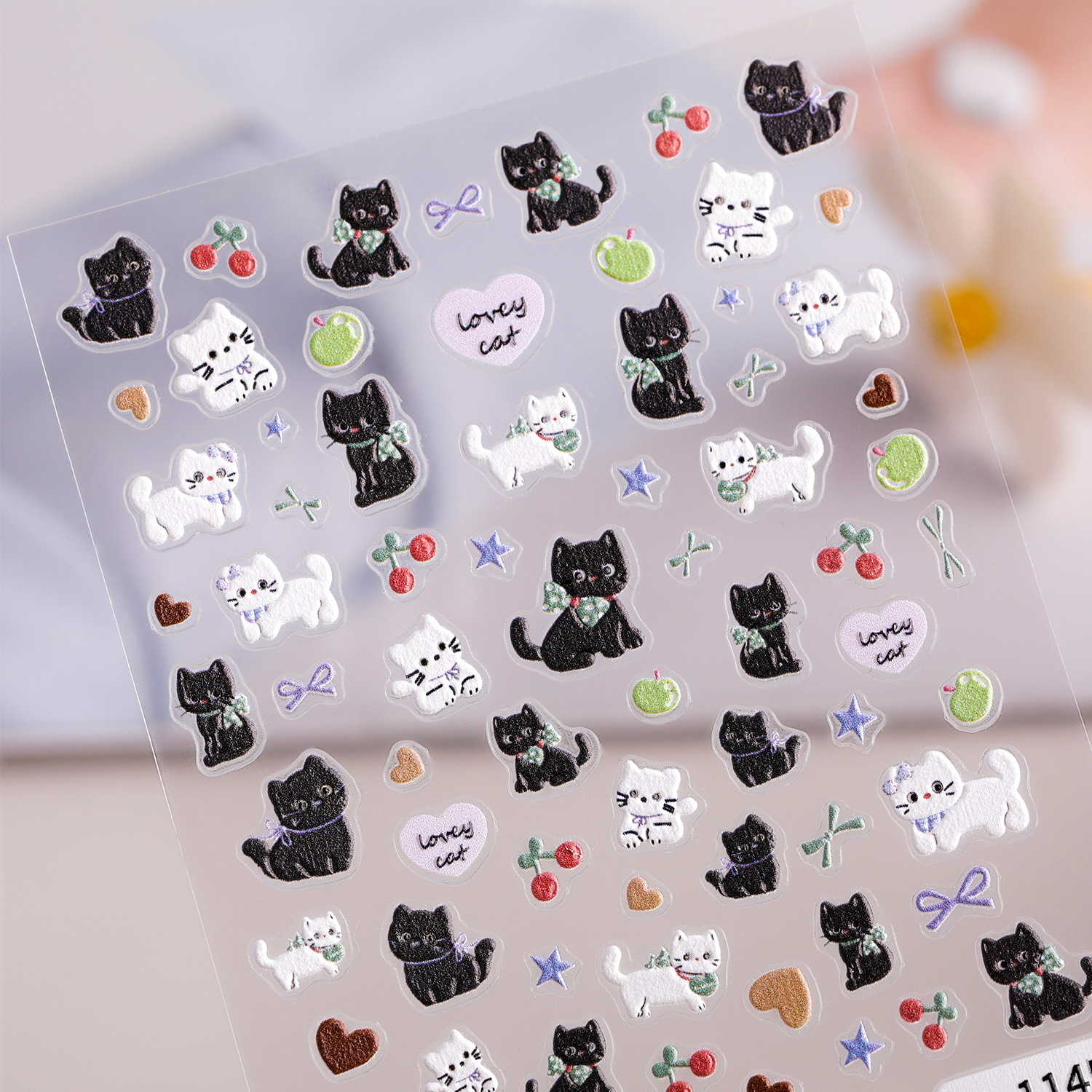 귀여운 고양이 네일 스티커 5D 구호 3 차원 접착제 달콤한 시원한 흑백 새끼 고양이 네일 스티커 보석 YL