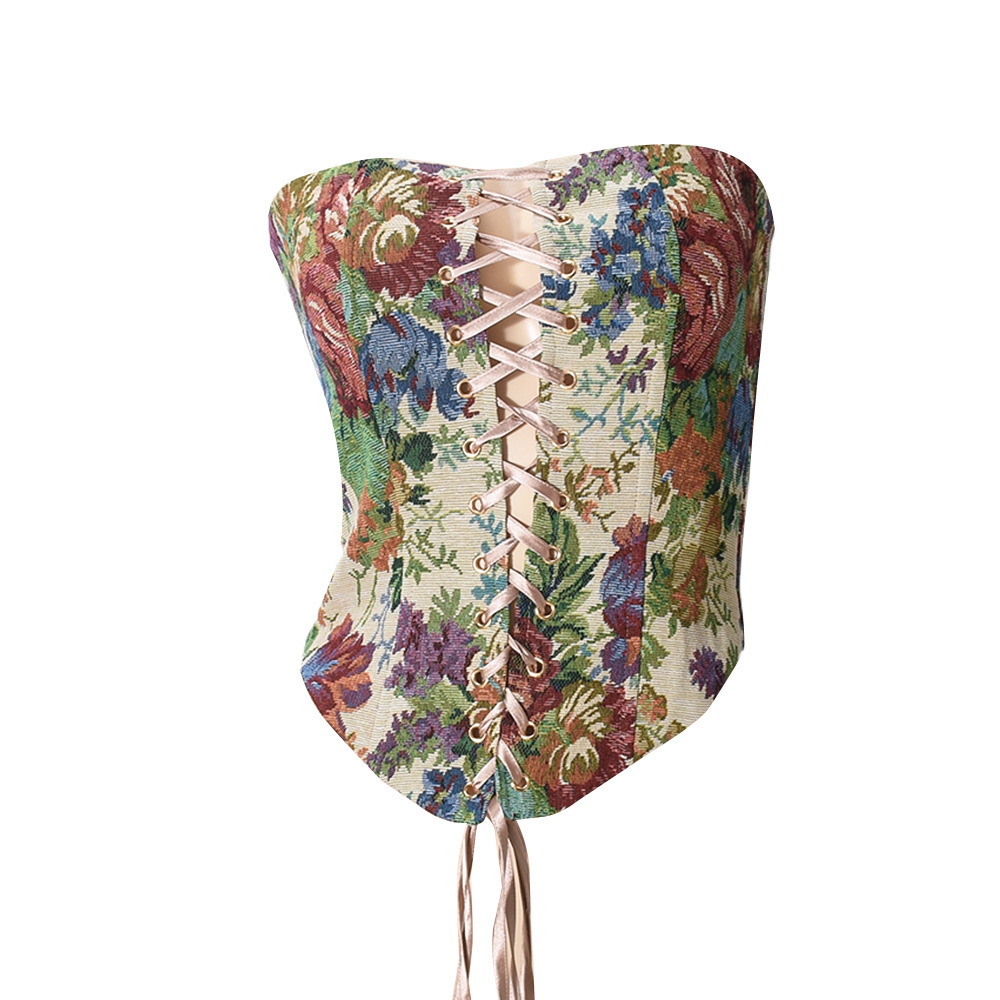 32458 레트로 스타일 유럽 및 미국 해외 무역 여성복, 가슴을 감싸는 크롭탑, 백리스, 끈 장식, 자수 장식의 짧은 상의