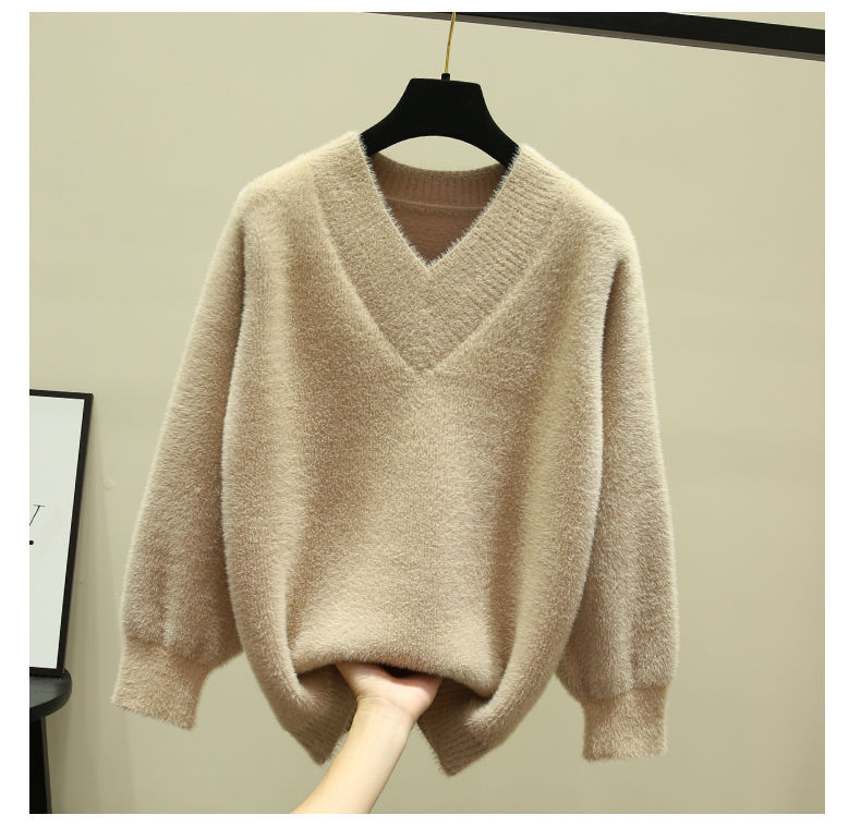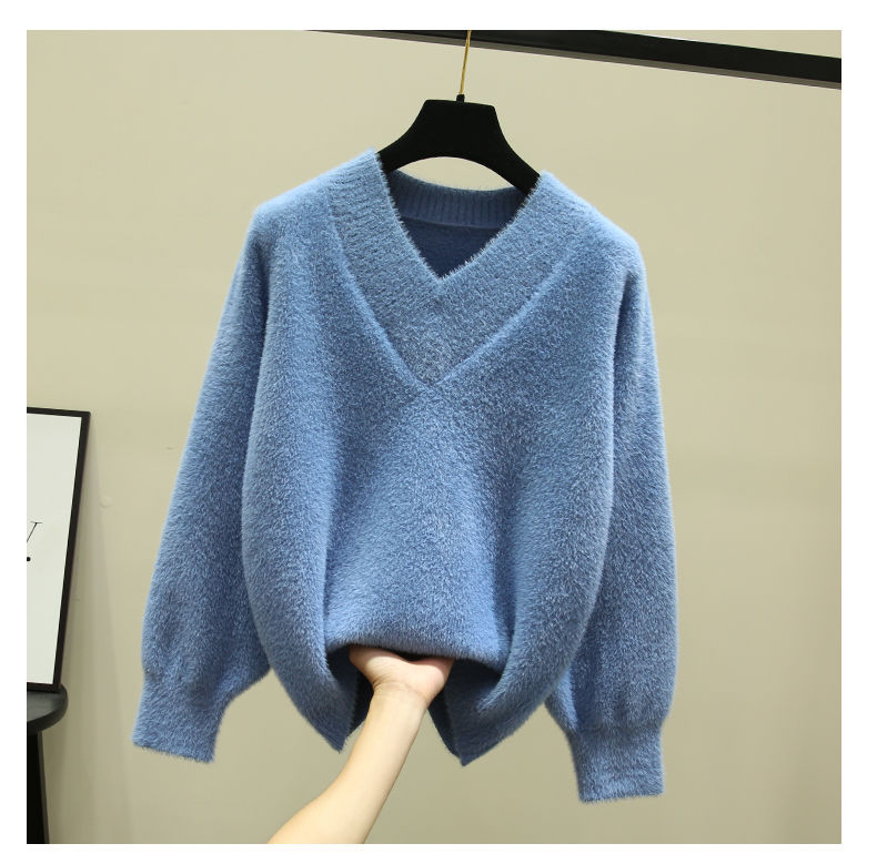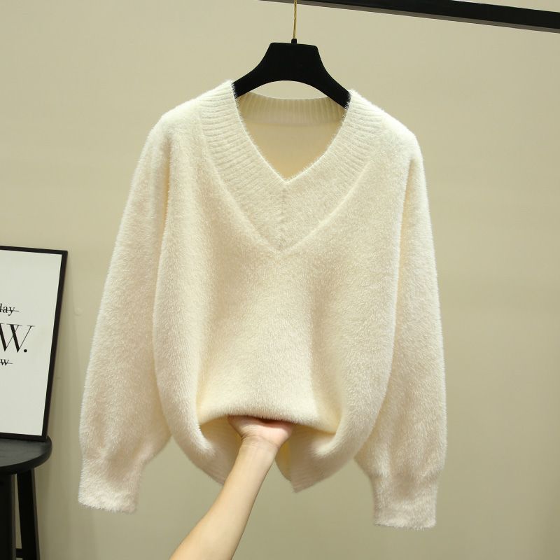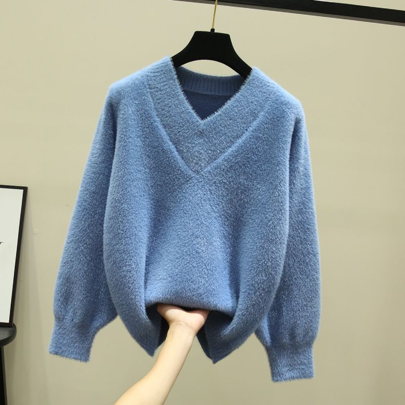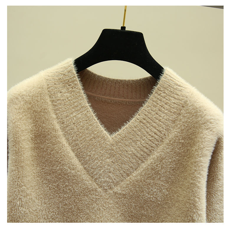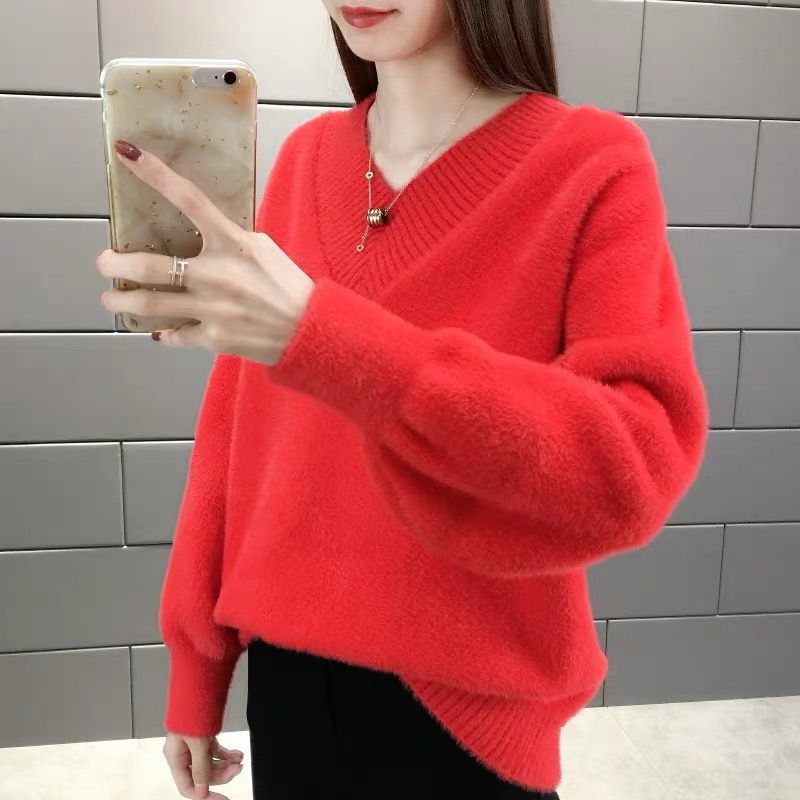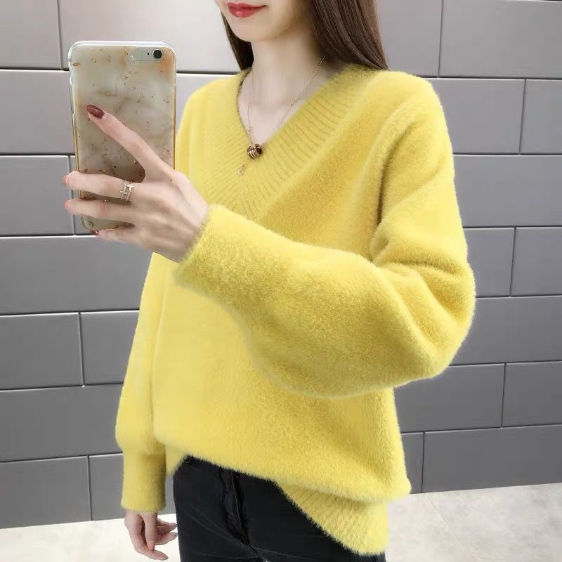 모방 밍크 벨벳 V-넥 스웨터 여성 풀오버 한국식 루즈 아우터 두꺼운 올매치 봄과 가을 니트 탑베이스 셔츠
