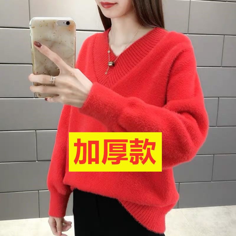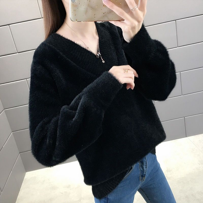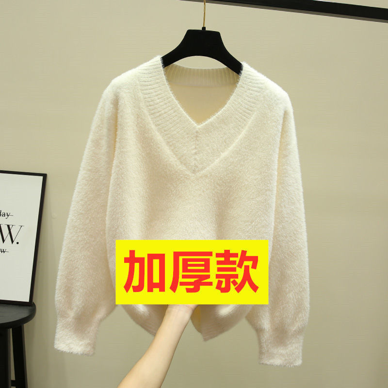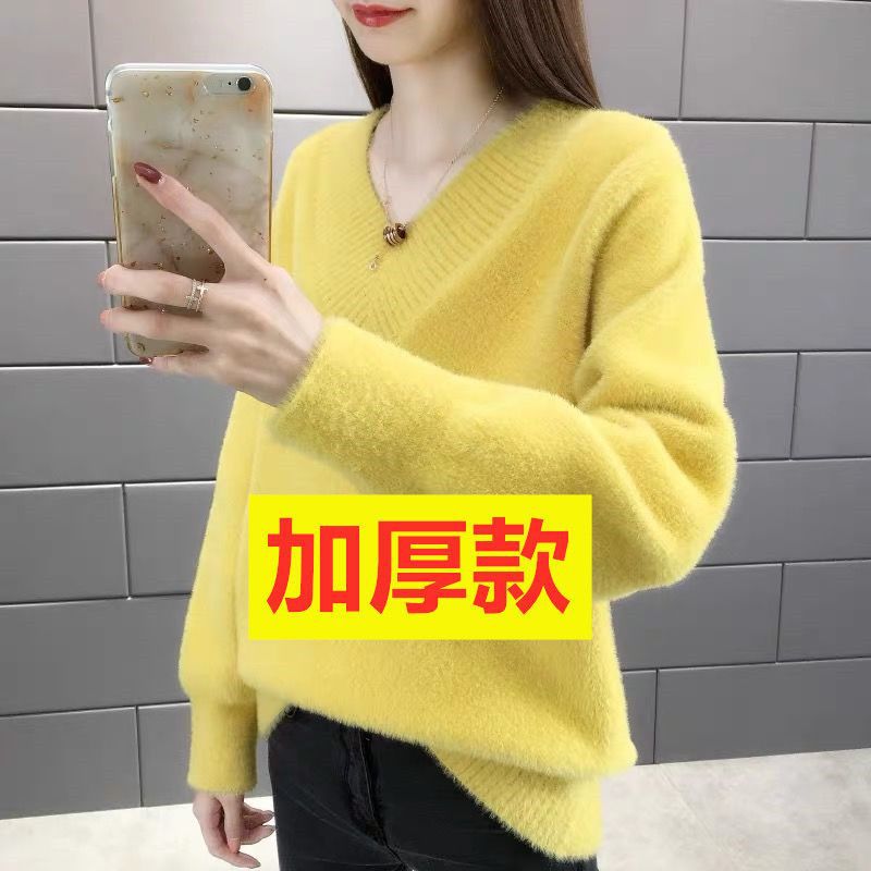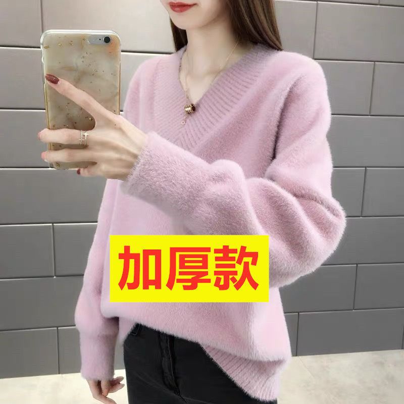 모방 밍크 벨벳 V-넥 스웨터 여성 풀오버 한국식 루즈 아우터 두꺼운 올매치 봄과 가을 니트 탑베이스 셔츠스토어 가기