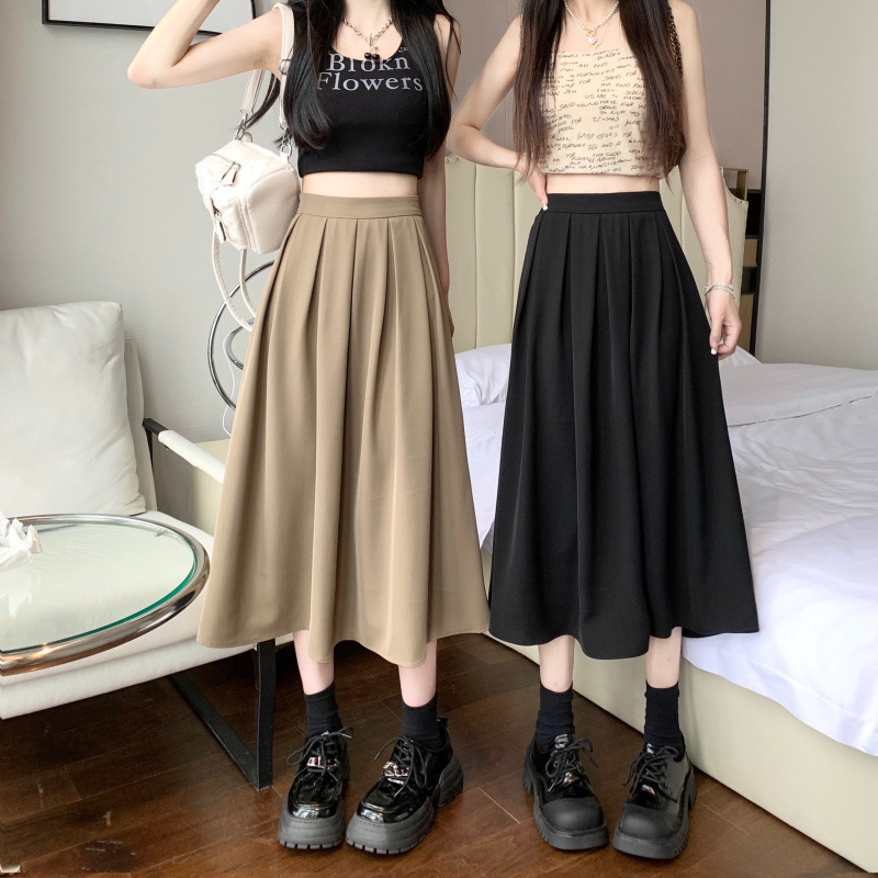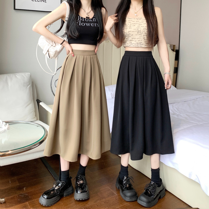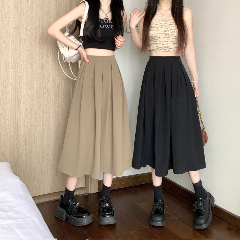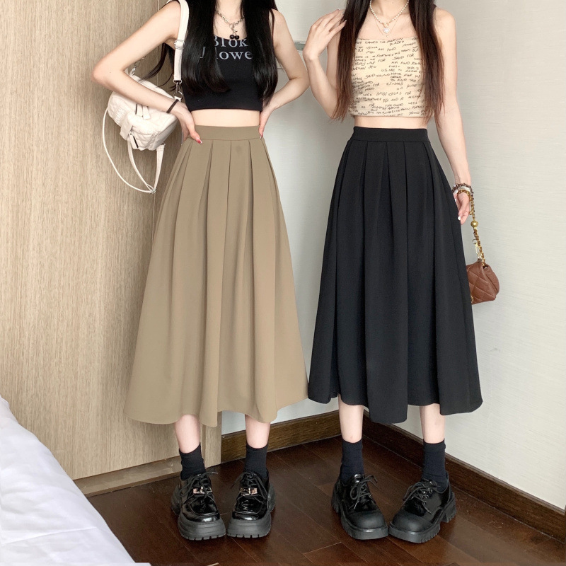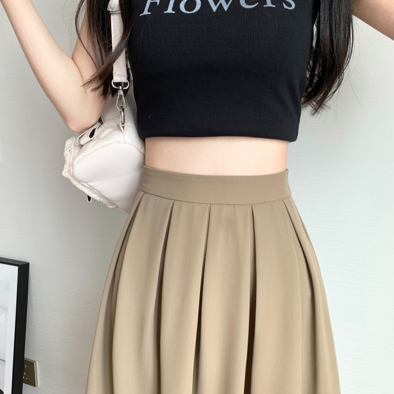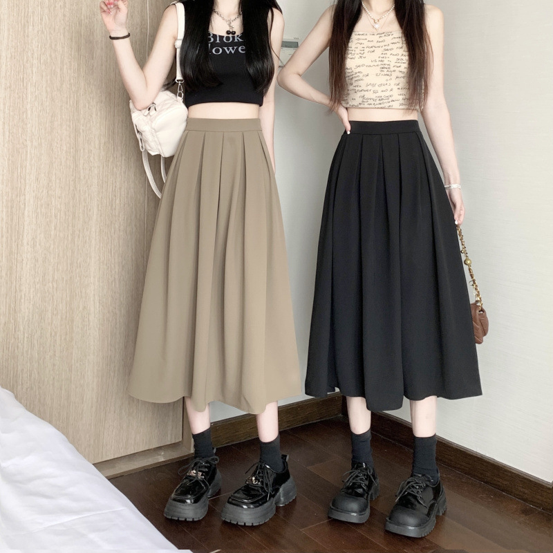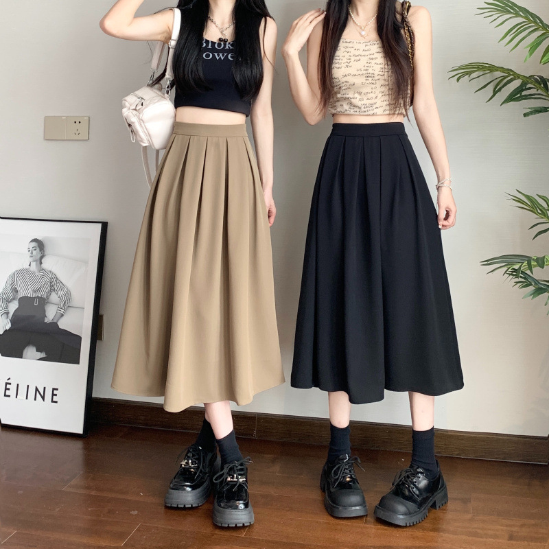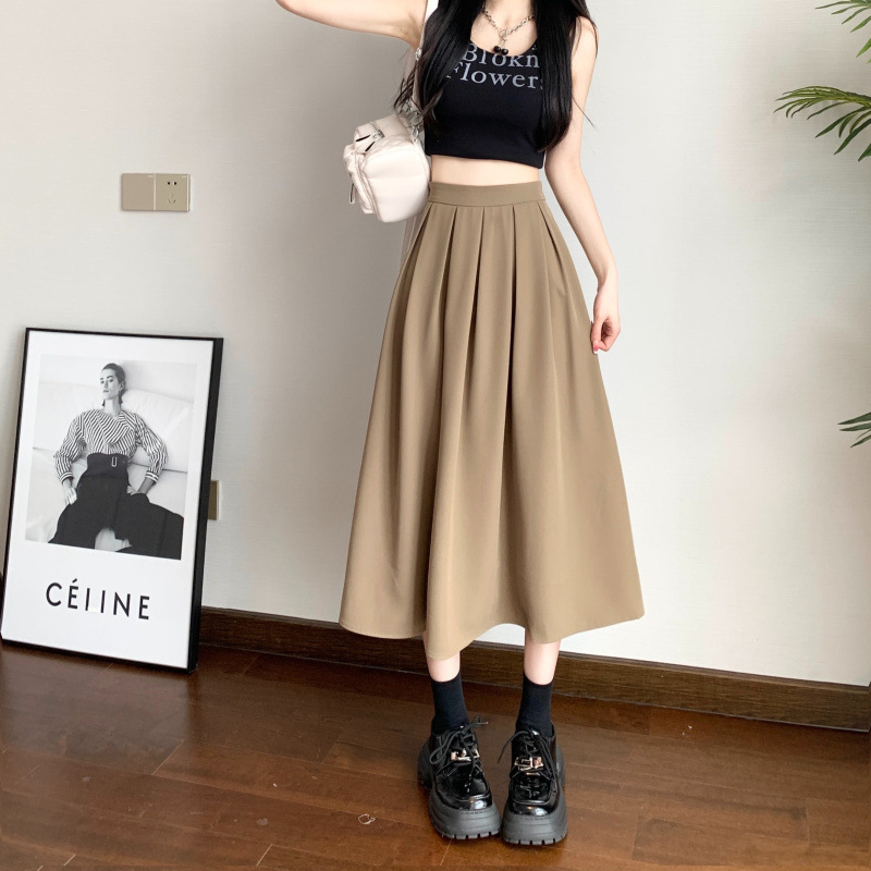 주름 치마 여성의 봄과 여름 새로운 중간 길이 세트 주름 치마 높은 허리 A 라인 우산 스커트 슬리밍 우아한 긴 치마